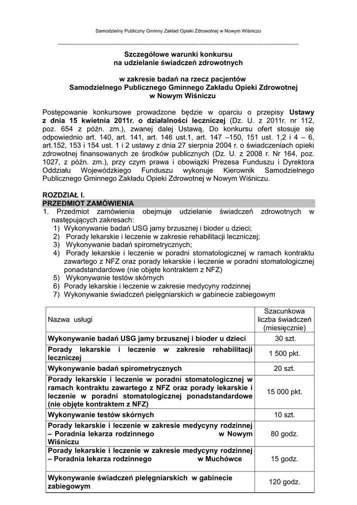 Samodzielny Publiczny Gminny Zakład Opieki Zdrowotnej w Nowym Wiśniczu ------------------------------------------------------------------------------------------------------------------------------------------------------- Szczegółowe warunki konkursu na udzielanie świadczeń zdrowotnych w zakresie badań na rzecz pacjentów Samodzielnego Publicznego Gminnego Zakładu Opieki Zdrowotnej w Nowym Wiśniczu Postępowanie konkursowe prowadzone będzie w oparciu o przepisy Ustawy z dnia 15 kwietnia 2011r. o działalności leczniczej (Dz. U. z 2011r. nr 112, poz. 654 z późn. zm.), zwanej dalej Ustawą, Do konkursu ofert stosuje się odpowiednio art. 140, art. 141, art. 146 ust.1, art. 147 –150, 151 ust. 1,2 i 4 – 6, art.152, 153 i 154 ust. 1 i 2 ustawy z dnia 27 sierpnia 2004 r. o świadczeniach opieki zdrowotnej finansowanych ze środków publicznych (Dz. U. z 2008 r. Nr 164, poz. 1027, z późn. zm.), przy czym prawa i obowiązki Prezesa Funduszu i Dyrektora Oddziału Wojewódzkiego Funduszu wykonuje Kierownik Samodzielnego Publicznego Gminnego Zakładu Opieki Zdrowotnej w Nowym Wiśniczu. ROZDZIAŁ I. PRZEDMIOT ZAMÓWIENIA 1. Przedmiot zamówienia obejmuje udzielanie świadczeń zdrowotnych w następujących zakresach: 1) Wykonywanie badań USG jamy brzusznej i bioder u dzieci; 2) Porady lekarskie i leczenie w zakresie rehabilitacji leczniczej; 3) Wykonywanie badań spirometrycznych; 4) Porady lekarskie i leczenie w poradni stomatologicznej w ramach kontraktu zawartego z NFZ oraz porady lekarskie i leczenie w poradni stomatologicznej ponadstandardowe (nie objęte kontraktem z NFZ) 5) Wykonywanie testów skórnych 6) Porady lekarskie i leczenie w zakresie medycyny rodzinnej 7) Wykonywanie świadczeń pielęgniarskich w gabinecie zabiegowym Szacunkowa liczba świadczeń (miesięcznie) Nazwa usługi Wykonywanie badań USG jamy brzusznej i bioder u dzieci Porady lekarskie i leczenie w zakresie leczniczej Wykonywanie badań spirometrycznych rehabilitacji Porady lekarskie i leczenie w poradni stomatologicznej w ramach kontraktu zawartego z NFZ oraz porady lekarskie i leczenie w poradni stomatologicznej ponadstandardowe (nie objęte kontraktem z NFZ) Wykonywanie testów skórnych Porady lekarskie i leczenie w zakresie medycyny rodzinnej – Poradnia lekarza rodzinnego w Nowym Wiśniczu Porady lekarskie i leczenie w zakresie medycyny rodzinnej – Poradnia lekarza rodzinnego w Muchówce Wykonywanie świadczeń pielęgniarskich w gabinecie zabiegowym 30 szt. 1 500 pkt. 20 szt. 15 000 pkt. 10 szt. 80 godz. 15 godz. 120 godz. Samodzielny Publiczny Gminny Zakład Opieki Zdrowotnej w Nowym Wiśniczu ------------------------------------------------------------------------------------------------------------------------------------------------------- Zamawiający wymaga, by badania i świadczenia zdrowotne wykonywanie były w pomieszczeniach i na sprzęcie należącym do Samodzielnego Publicznego Gminnego Zakładu Opieki Zdrowotnej w Nowym Wiśniczu. 2. Świadczenia będące przedmiotem niniejszego konkursu muszą być realizowane przez osoby dysponujące kwalifikacjami o jakich mowa w ogłoszeniu o konkursie z dnia 03.06.2013 r. 3. Niniejsze szczegółowe warunki konkursu będą stanowić integralną część umowy podpisanej z wybranym oferentem. 4. Warunki udzielania świadczeń oraz inne sprawy nieopisane w niniejszych szczegółowych warunkach konkursu będą zawarte w umowie, której projekt stanowi załącznik nr 6. Akceptacja projektu umowy jest warunkiem udziału w niniejszym konkursie. ROZDZIAŁ II. WYMAGANIA i WARUNKI DLA OFERENTÓW PODSTAWOWE ZASADY PRZEPROWADZENIA KONKURSU OFERT 1. Ofertę składa oferent dysponujący odpowiednimi kwalifikacjami i uprawnieniami do wykonywania świadczeń zdrowotnych objętych przedmiotem zamówienia w zakresie objętym postępowaniem konkursowym. 2. Korespondencja dotycząca konkursu powinna być kierowana przez oferenta na adres: Samodzielny Publiczny Gminny Zakład Opieki Zdrowotnej w Nowym Wiśniczu, 32-720 Nowy Wiśnicz, ul. Podzamcze 4, z dopiskiem na kopercie “Konkurs na udzielanie świadczeń zdrowotnych w zakresie ……………(wpisać według właściwości z rozdziału I ust. 1 pkt. 1-7)”. 3.Dokonując wyboru najkorzystniejszej oferty Udzielający zamówienia stosuje zasady określone w niniejszych "Szczegółowych warunkach konkursu" oraz "Regulaminie pracy komisji konkursowej". 4.Udzielający zamówienia zastrzega sobie prawo do odwołania konkursu oraz do przesunięcia terminu składania ofert, 5.O odwołaniu konkursu ofert Udzielający zamówienia zawiadamia pisemnie oferentów biorących w nim udział. PRZYGOTOWANIE OFERTY 1.Oferent składa ofertę zgodnie z wymaganiami określonymi w "Szczegółowych warunkach konkursu" na formularzu udostępnionym przez Udzielającego zamówienia. 2.Oferenci ponoszą wszelkie koszty związane z przygotowaniem i złożeniem oferty. 3.Oferta powinna zawierać wszelkie dokumenty i załączniki wymagane w "Szczegółowych warunkach konkursu". 4.Oferta winna być sporządzona w sposób przejrzysty i czytelny. 5.Ofertę oraz wszystkie załączniki należy sporządzić w języku polskim pod rygorem odrzucenia oferty, z wyłączeniem pojęć medycznych. 6.Ofertę oraz każdą z jej stron numeruje i podpisuje oferent lub osoba upoważniona na podstawie pełnomocnictwa złożonego w oryginale w formie pisemnej, poświadczonego przez notariusza. 7.Strony oferty oraz miejsca, w których naniesione zostały poprawki, podpisuje oferent lub osoba, o której mowa w pkt. 6. Poprawki mogą być dokonane jedynie poprzez przekreślenie błędnego zapisu i umieszczenie obok niego czytelnego zapisu poprawnego. Samodzielny Publiczny Gminny Zakład Opieki Zdrowotnej w Nowym Wiśniczu ------------------------------------------------------------------------------------------------------------------------------------------------------- 8.Oferent może wprowadzić zmiany lub wycofać złożoną ofertę, jeżeli w formie 