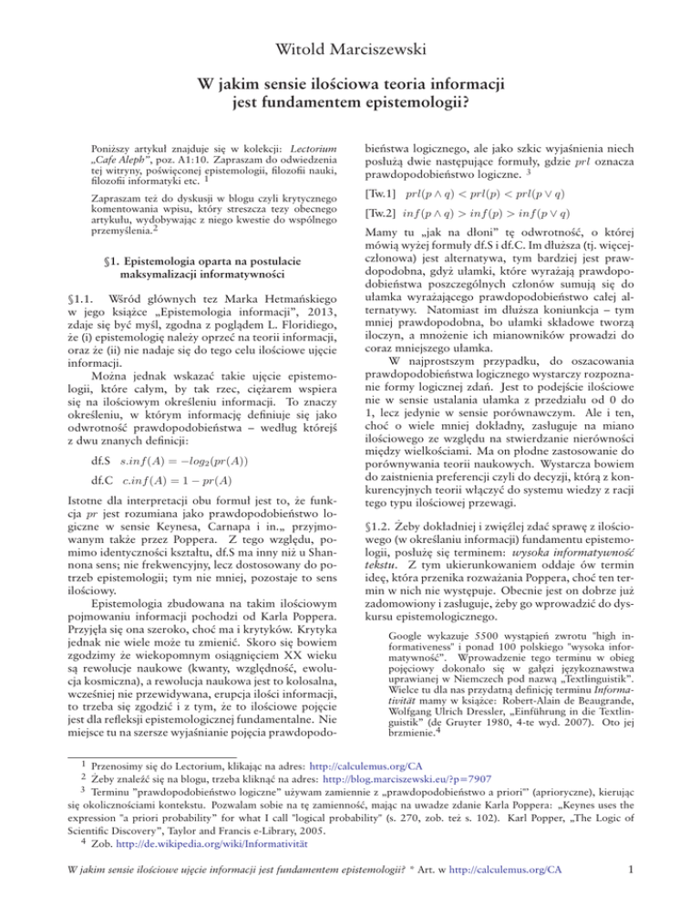 Witold Marciszewski W jakim sensie ilościowa teoria informacji jest fundamentem epistemologii? Poniższy artykuł znajduje się w kolekcji: Lectorium „Cafe Aleph”, poz. A1:10. Zapraszam do odwiedzenia tej witryny, poświęconej epistemologii, filozofii nauki, filozofii informatyki etc. 1 bieństwa logicznego, ale jako szkic wyjaśnienia niech posłużą dwie następujące formuły, gdzie prl oznacza prawdopodobieństwo logiczne. 3 Zapraszam też do dyskusji w blogu czyli krytycznego komentowania wpisu, który streszcza tezy obecnego artykułu, wydobywając z niego kwestie do wspólnego przemyślenia.2 [Tw.2] inf (p ∧ q) > inf (p) > inf (p ∨ q) §1. Epistemologia oparta na postulacie maksymalizacji informatywności §1.1. Wśród głównych tez Marka Hetmańskiego w jego książce „Epistemologia informacji”, 2013, zdaje się być myśl, zgodna z poglądem L. Floridiego, że (i) epistemologię należy oprzeć na teorii informacji, oraz że (ii) nie nadaje się do tego celu ilościowe ujęcie informacji. Można jednak wskazać takie ujęcie epistemologii, które całym, by tak rzec, ciężarem wspiera się na ilościowym określeniu informacji. To znaczy określeniu, w którym informację definiuje się jako odwrotność prawdopodobieństwa – według którejś z dwu znanych definicji: df.S s.inf (A) = −log2 (pr(A)) df.C c.inf (A) = 1 − pr(A) Istotne dla interpretacji obu formuł jest to, że funkcja pr jest rozumiana jako prawdopodobieństwo logiczne w sensie Keynesa, Carnapa i in.„ przyjmowanym także przez Poppera. Z tego względu, pomimo identyczności kształtu, df.S ma inny niż u Shannona sens; nie frekwencyjny, lecz dostosowany do potrzeb epistemologii; tym nie mniej, pozostaje to sens ilościowy. Epistemologia zbudowana na takim ilościowym pojmowaniu informacji pochodzi od Karla Poppera. Przyjęła się ona szeroko, choć ma i krytyków. Krytyka jednak nie wiele może tu zmienić. Skoro się bowiem zgodzimy że wiekopomnym osiągnięciem XX wieku są rewolucje naukowe (kwanty, względność, ewolucja kosmiczna), a rewolucja naukowa jest to kolosalna, wcześniej nie przewidywana, erupcja ilości informacji, to trzeba się zgodzić i z tym, że to ilościowe pojęcie jest dla refleksji epistemologicznej fundamentalne. Nie miejsce tu na szersze wyjaśnianie pojęcia prawdopodo- [Tw.1] prl(p ∧ q) < prl(p) < prl(p ∨ q) Mamy tu „jak na dłoni” tę odwrotność, o której mówią wyżej formuły df.S i df.C. Im dłuższa (tj. więcejczłonowa) jest alternatywa, tym bardziej jest prawdopodobna, gdyż ułamki, które wyrażają prawdopodobieństwa poszczególnych członów sumują się do ułamka wyrażającego prawdopodobieństwo całej alternatywy. Natomiast im dłuższa koniunkcja – tym mniej prawdopodobna, bo ułamki składowe tworzą iloczyn, a mnożenie ich mianowników prowadzi do coraz mniejszego ułamka. W najprostszym przypadku, do oszacowania prawdopodobieństwa logicznego wystarczy rozpoznanie formy logicznej zdań. Jest to podejście ilościowe nie w sensie ustalania ułamka z przedziału od 0 do 1, lecz jedynie w sensie porównawczym. Ale i ten, choć o wiele mniej dokładny, zasługuje na miano ilościowego ze względu na stwierdzanie nierówności między wielkościami. Ma on płodne zastosowanie do porównywania teorii naukowych. Wystarcza bowiem do zaistnienia preferencji czyli do decyzji, którą z konkurencyjnych teorii włączyć do systemu wiedzy z racji tego typu ilościowej przewagi. §1.2. Żeby dokładniej i zwięźlej zdać sprawę z ilościowego (w określaniu informacji) fundamentu epistemologii, posłużę się terminem: wysoka informatywność tekstu. Z tym ukierunkowaniem oddaje ów termin ideę, która przenika rozważania Poppera, choć ten termin w nich nie występuje. Obecnie jest on dobrze już zadomowiony i zasługuje, żeby go wprowadzić do dyskursu epistemologicznego. Google wykazuje 5500 wystąpień zwrotu "high informativeness" i ponad 100 polskiego "wysoka informatywność”. Wprowadzenie tego terminu w obieg pojęciowy dokonało się w gałęzi językoznawstwa uprawianej w Niemczech pod nazwą „Textlinguistik”. Wielce tu dla nas przydatną definicję terminu Informativität mamy w książce: Robert-Alain de Beaugrande, Wolfgang Ulrich Dressler, „Einführung in die Textlinguistik” (de Gruyter 1980, 4-te wyd. 2007). Oto jej brzmienie.4 1 Przenosimy się do Lectorium, klikając na adres: http://calculemus.org/CA 2 Żeby znaleźć się na blogu, trzeba kliknąć na adres: http://blog.marciszewski.eu/?p=7907 3 Terminu ”prawdopodobieństwo logiczne” używam zamiennie z „prawdopodobieństwo a priori"’ (aprioryczne), kierując się okolicznościami kontekstu. Pozwalam sobie na tę zamienność, mając na uwadze zdanie Karla Poppera: „Keynes uses the expression "a priori probability” for what I call "logical probability" (s. 270, zob. też s. 102). Karl Popper, „The Logic of Scientific Discovery”, Taylor and Francis e-Library, 2005. 4 Zob. http://de.wikipedia.org/wiki/Informativität W jakim sensie ilościowe ujęcie informacji jest fundamentem epistemologii? * Art. w http://calculemus.org/CA 1 „Informativität ist ein Kriterium der Textualität.[...] Ein Text ist genau dann informativ, wenn er für den Rezipienten neue Informationen bringt. Die damit verbundene Unerwartetheit für den Textrezipienten erhöht dessen Aufmerksamkeit, sofern das neue Wissen auf vorhandenes Wissen aufbauen kann.” Oddając to po polsku i zastępując „tekst” słowem „teoria”, otrzymamy, co następuje. Informatywność jest jednym z kryteriów jakości teorii. Teoria jest wtedy informatywna, gdy dostarcza odbiorcy nowych wiadomości [czyli więcej niż teoria dotychczasowa]. Wywołane tym zaskoczenie odbiorcy teorii kieruje jego uwagę na pytanie, na ile da się zbudować w tej sytuacji wiedzę, która byłaby czymś nowym w stosunku do wiedzy dotychczasowej. Doniosłe jest odróżnienie informacji od wiedzy (W