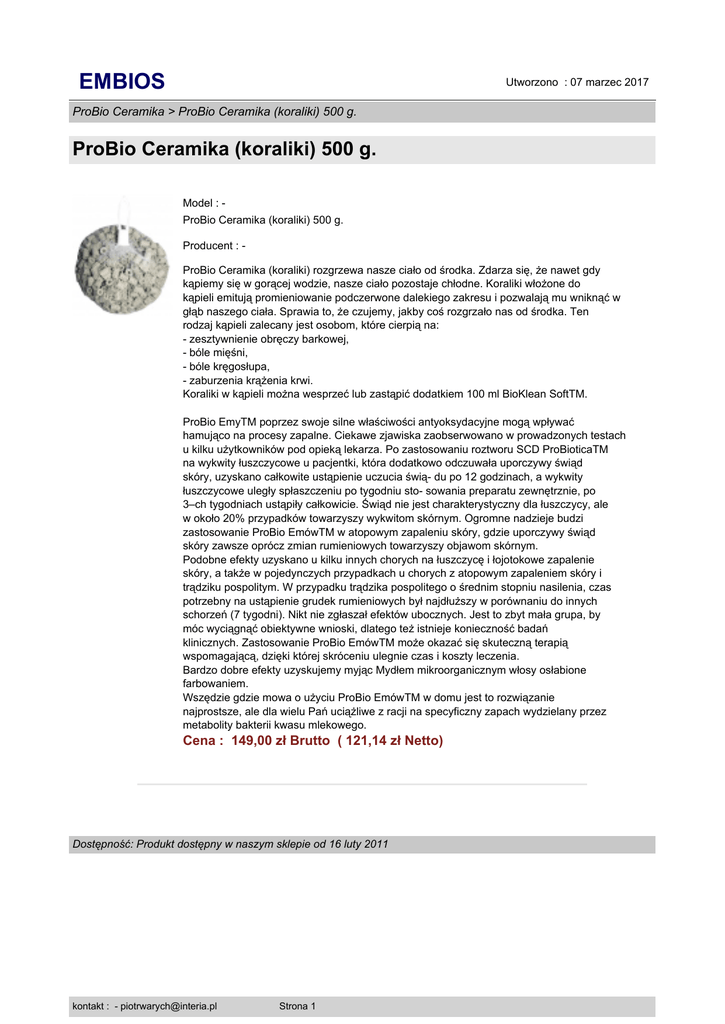 EMBIOS Utworzono : 07 marzec 2017 ProBio Ceramika > ProBio Ceramika (koraliki) 500 g. ProBio Ceramika (koraliki) 500 g. Model : ProBio Ceramika (koraliki) 500 g. Producent : ProBio Ceramika (koraliki) rozgrzewa nasze ciało od środka. Zdarza się, że nawet gdy kąpiemy się w gorącej wodzie, nasze ciało pozostaje chłodne. Koraliki włożone do kąpieli emitują promieniowanie podczerwone dalekiego zakresu i pozwalają mu wniknąć w głąb naszego ciała. Sprawia to, że czujemy, jakby coś rozgrzało nas od środka. Ten rodzaj kąpieli zalecany jest osobom, które cierpią na: - zesztywnienie obręczy barkowej, - bóle mięśni, - bóle kręgosłupa, - zaburzenia krążenia krwi. Koraliki w kąpieli można wesprzeć lub zastąpić dodatkiem 100 ml BioKlean SoftTM. ProBio EmyTM poprzez swoje silne właściwości antyoksydacyjne mogą wpływać hamująco na procesy zapalne. Ciekawe zjawiska zaobserwowano w prowadzonych testach u kilku użytkowników pod opieką lekarza. Po zastosowaniu roztworu SCD ProBioticaTM na wykwity łuszczycowe u pacjentki, która dodatkowo odczuwała uporczywy świąd skóry, uzyskano całkowite ustąpienie uczucia świą- du po 12 godzinach, a wykwity łuszczycowe uległy spłaszczeniu po tygodniu sto- sowania preparatu zewnętrznie, po 3–ch tygodniach ustąpiły całkowicie. Świąd nie jest charakterystyczny dla łuszczycy, ale w około 20% przypadków towarzyszy wykwitom skórnym. Ogromne nadzieje budzi zastosowanie ProBio EmówTM w atopowym zapaleniu skóry, gdzie uporczywy świąd skóry zawsze oprócz zmian rumieniowych towarzyszy objawom skórnym. Podobne efekty uzyskano u kilku innych chorych na łuszczycę i łojotokowe zapalenie skóry, a także w pojedynczych przypadkach u chorych z atopowym zapaleniem skóry i trądziku pospolitym. W przypadku trądzika pospolitego o średnim stopniu nasilenia, czas potrzebny na ustąpienie grudek rumieniowych był najdłuższy w porównaniu do innych schorzeń (7 tygodni). Nikt nie zgłaszał efektów ubocznych. Jest to zbyt mała grupa, by móc wyciągnąć obiektywne wnioski, dlatego też istnieje konieczność badań klinicznych. Zastosowanie ProBio EmówTM może okazać się skuteczną terapią wspomagającą, dzięki której skróceniu ulegnie czas i koszty leczenia. Bardzo dobre efekty uzyskujemy myjąc Mydłem mikroorganicznym włosy osłabione farbowaniem. Wszędzie gdzie mowa o użyciu ProBio EmówTM w domu jest to rozwiązanie najprostsze, ale dla wielu Pań uciążliwe z racji na specyficzny zapach wydzielany przez metabolity bakterii kwasu mlekowego. Cena : 149,00 zł Brutto ( 121,14 zł Netto) Dostępność: Produkt dostępny w naszym sklepie od 16 luty 2011 kontakt : - [email protected] Strona 1