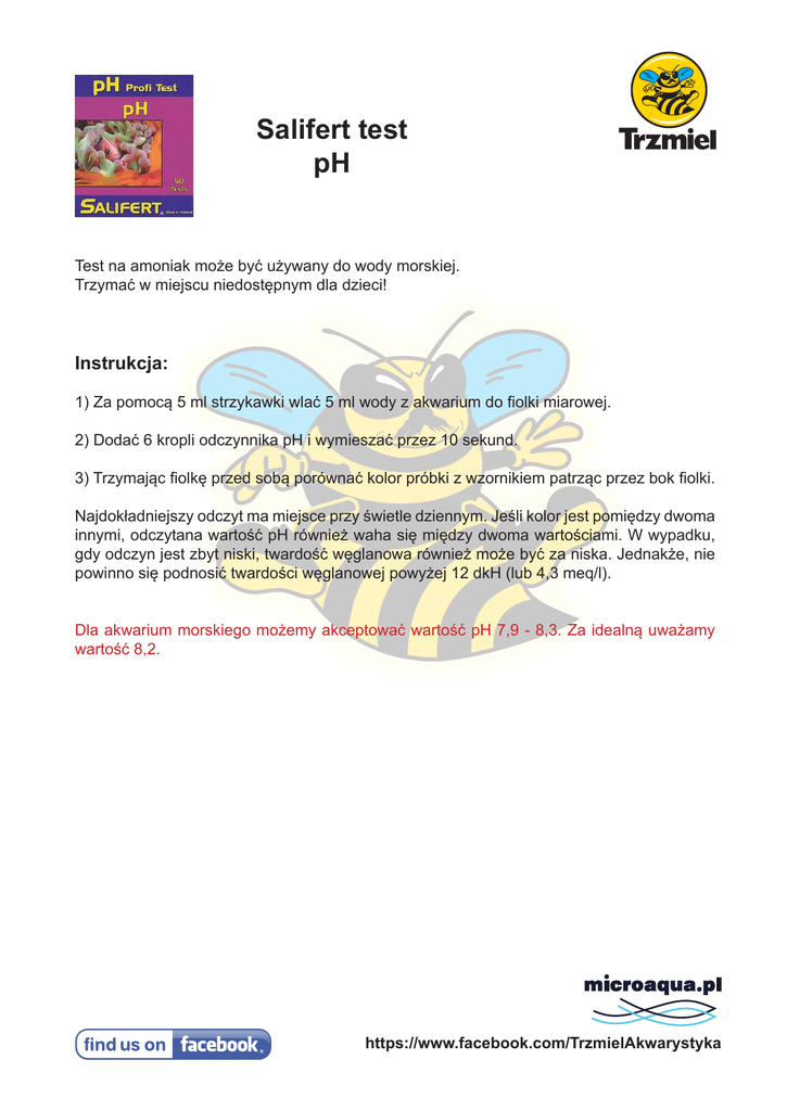 Salifert test pH Test na amoniak może być używany do wody morskiej. Trzymać w miejscu niedostępnym dla dzieci! Instrukcja: 1) Za pomocą 5 ml strzykawki wlać 5 ml wody z akwarium do fiolki miarowej. 2) Dodać 6 kropli odczynnika pH i wymieszać przez 10 sekund. 3) Trzymając fiolkę przed sobą porównać kolor próbki z wzornikiem patrząc przez bok fiolki. Najdokładniejszy odczyt ma miejsce przy świetle dziennym. Jeśli kolor jest pomiędzy dwoma innymi, odczytana wartość pH również waha się między dwoma wartościami. W wypadku, gdy odczyn jest zbyt niski, twardość węglanowa również może być za niska. Jednakże, nie powinno się podnosić twardości węglanowej powyżej 12 dkH (lub 4,3 meq/l). Dla akwarium morskiego możemy akceptować wartość pH 7,9 - 8,3. Za idealną uważamy wartość 8,2. https://www.facebook.com/TrzmielAkwarystyka