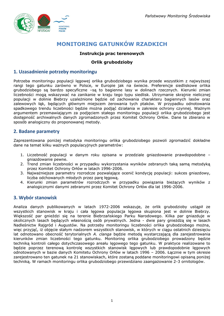 Państwowy Monitoring Środowiska MONITORING GATUNKÓW RZADKICH Instrukcja prac terenowych Orlik grubodzioby 1. Uzasadnienie potrzeby monitoringu Potrzeba monitoringu populacji lęgowej orlika grubodziobego wynika przede wszystkim z najwyższej rangi tego gatunku zarówno w Polsce, w Europie jak na świecie. Preferencje siedliskowe orlika grubodziobego są bardzo specyficzne –są to bagienne lasy w dolinach rzecznych. Kierunki zmian liczebności mogą wskazywać na zanikanie w kraju tego typu siedlisk. Utrzymanie skrajnie nielicznej populacji w dolinie Biebrzy uzależnione będzie od zachowania charakteru bagiennych lasów oraz zalewowych łąk, będących głównym miejscem żerowania tych ptaków. W przypadku odnotowania spadkowego trendu liczebności będzie można podjąć działania w zakresie ochrony czynnej. Ważnym argumentem przemawiającym za podjęciem stałego monitoringu populacji orlika grubodziobego jest dostępność archiwalnych danych zgromadzonych przez Komitet Ochrony Orłów. Dane te zbierano w sposób analogiczny do proponowanej metody. 2. Badane parametry Zaprezentowana poniżej metodyka monitoringu orlika grubodziobego pozwoli zgromadzić dokładne dane na temat kilku ważnych populacyjnych parametrów: 1. Liczebność populacji w danym roku opisana w przedziale gniazdowanie prawdopodobne – gniazdowanie pewne. 2. Trend zmian liczebności w przypadku wykorzystania wyników zebranych taką samą metodyką przez Komitet Ochrony Orłów w latach 1996-2006. 3. Najważniejsze parametry rozrodcze pozwalające ocenić kondycję populacji: sukces gniazdowy, liczba odchowanych młodych przez parę łęgową. 4. Kierunki zmian parametrów rozrodczych w przypadku powiązania bieżących wyników z analogicznymi danymi zebranymi przez Komitet Ochrony Orłów dla lat 1996-2006. 3. Wybór stanowisk Analiza danych publikowanych w latach 1972-2006 wskazuje, że orlik grubodzioby ustąpił ze wszystkich stanowisk w kraju i cała lęgowa populacja lęgowa skupiona jest w dolinie Biebrzy. Większość par gnieździ się na terenie Biebrzańskiego Parku Narodowego. Kilka par gniazduje w okolicznych lasach będących własnością osób prywatnych. Jedna - dwie pary gnieżdżą się w lasach Nadleśnictw Rajgród i Augustów. Na potrzeby monitoringu liczebności orlika grubodziobego można, więc przyjąć, iż objęcie stałym nadzorem wszystkich stanowisk, w których w ciągu ostatnich dziesięciu lat odnotowano obecność terytorialnych A. clanga będzie metodą wystarczającą dla zarejestrowania kierunków zmian liczebności tego gatunku. Monitoring orlika grubodziobego prowadzony będzie techniką kontroli całego dotychczasowego areału lęgowego tego gatunku. W praktyce realizowane to będzie poprzez terenową kontrolę wszystkich stanowisk lęgowych lub prawdopodobnie lęgowych odnotowanych w bazie danych Komitetu Ochrony Orłów w latach 1996 – 2006. Łącznie w tym okresie zarejestrowano ten gatunek na 21 stanowiskach, które zostaną poddane monitoringowi opisaną poniżej techniką. W ramach monitoringu orlika grubodziobego przewidziano zaangażowanie 2-3 ornitologów. 1 4. Terminy kontroli Monitoring orlika grubodziobego realizowany będzie w dwóch etapach. 1. etap – wiosenny. Obejmuje okres od 1 kwietnia do 10 maja. Jest to okres szczytowej aktywności terytorialnej i tokowej, a zatem najwyższej wykrywalności orlika grubodziobego. Celem działań podejmowanych w pierwszym etapie jest kontrola zasiedlenia gniazd i rewirów, ewentualnie wykrycie nowych stanowisk lęgowych i poszukiwanie gniazd. 2. etap – letni. Obejmuje okres od 15 do 31 lipca. Jest to końcowa faza sezonu lęgowego. Celem działań podejmowanych w drugim etapie jest kontrola efektu lęgów, oraz potwierdzeniu stanu zasiedlenia rewirów. W przypadku znanych, zasiedlonych gniazd obserwatorzy odnotowują ponadto liczbę piskląt. Poza dwoma zasadniczymi kontrolami rewiru – stanowiącymi warunek konieczny metodyki, zalecane jest wykonanie dodatkowych obserwacji, które wzbogacą zasób wiedzy Np. w zakresie przyczyn strat w lęgach oraz stopnia zagrożenia lęgu przez aktywność ludzką. Kontrola ta powinna być przeprowadzona w czerwcu do połowy lipca 5. Szczegółowe zalecenia dla obserwatorów Każdy obserwator uczestniczący w monitoringu orlika grubodziobego otrzyma szczegółowy wykaz stanowisk lęgowych wraz z historią. Czasochłonność i technika kontroli dostosowana będzie do aktualnej sytuacji na poszczególnych stanowiskach. Obserwatorzy będą wykorzystywali dwie podstawowe metody badawcze – bezpośrednią kontrolę gniazd oraz obserwacje z punktów widokowych. Obowiązkiem uczestników monitoringu orlika grubodziobego jest dobór odpowiedniej techniki postępowania i właściwej metody zebrania informacji na temat stanowiska. Można wyróżnić trzy alternatywne sytuacje: 1. Rewir ze znanym położeniem zasiedlonego w ostatnich latach gniazda Obserwator dokonuje kontroli gniazda i jego otoczenia celem zebrania wymaganych informacji. Jeśli gniazdo podczas pierwszej wizyty jest zasiedlone, następna kontrola może być dokonana dopiero w drugim etapie monitoringu. Podczas drugiej kontroli obserwator określa na podstawie oględzin gniazda i jego okolic końcowy efekt lęgu i okoliczności ewentualnych strat. Jeśli podczas wiosennej kontroli gniazdo nie jest zasiedlone, a w rewirze obserwowane są terytorialne ptaki należy odszukać aktualnie zajęte gniazdo. W przypadku, kiedy nie uda się wykryć zasiedlonego gniazda, obserwator powinien wykorzystać jeszcze w pierwszym etapie monitoringu drugą z opisanych technik kontroli. 2. Rewiry w których stwierdzono porzucenie zasiedlanego dotychczas gniazda, a poszukiwanie nowego nie dało rezultatów. Kontrolę wiosenną rozpoczynamy od sprawdzenia stanu zasiedlenia gniazda. Jeśli stwierdzimy, że w bieżącym roku nie zostało zajęte, a próby odszukania nowego gniazda nie dały rezultatów należy wyszukać punkt widokowy, z 
