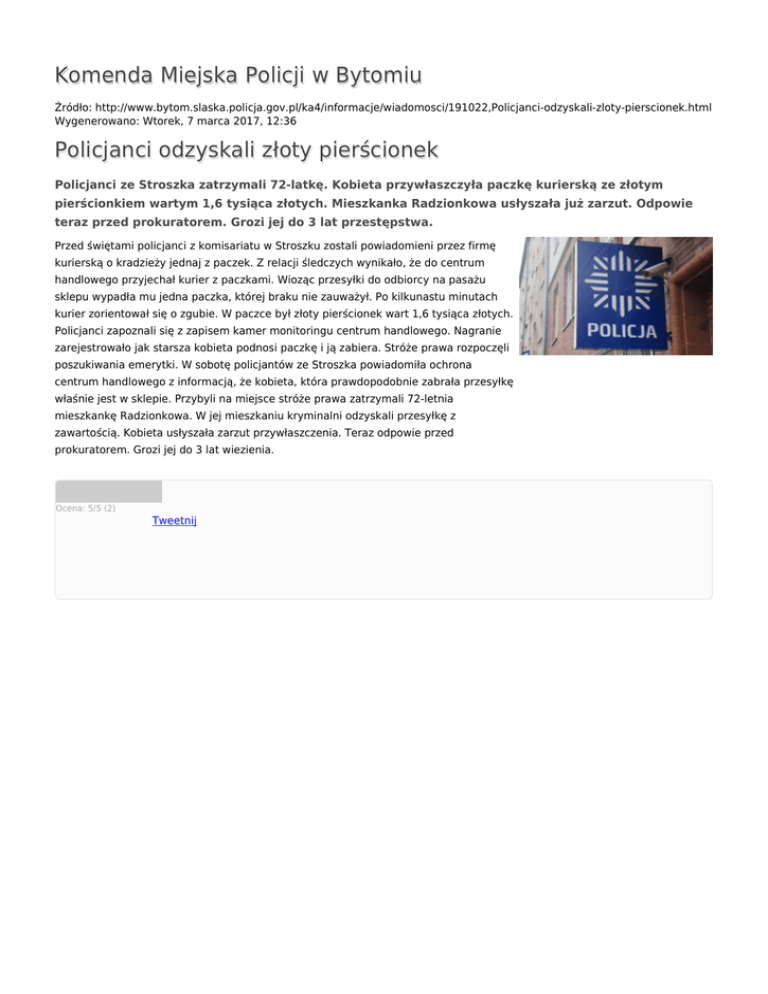 Komenda Miejska Policji w Bytomiu Źródło: http://www.bytom.slaska.policja.gov.pl/ka4/informacje/wiadomosci/191022,Policjanci-odzyskali-zloty-pierscionek.html Wygenerowano: Wtorek, 7 marca 2017, 12:36 Policjanci odzyskali złoty pierścionek Policjanci ze Stroszka zatrzymali 72-latkę. Kobieta przywłaszczyła paczkę kurierską ze złotym pierścionkiem wartym 1,6 tysiąca złotych. Mieszkanka Radzionkowa usłyszała już zarzut. Odpowie teraz przed prokuratorem. Grozi jej do 3 lat przestępstwa. Przed świętami policjanci z komisariatu w Stroszku zostali powiadomieni przez firmę kurierską o kradzieży jednaj z paczek. Z relacji śledczych wynikało, że do centrum handlowego przyjechał kurier z paczkami. Wioząc przesyłki do odbiorcy na pasażu sklepu wypadła mu jedna paczka, której braku nie zauważył. Po kilkunastu minutach kurier zorientował się o zgubie. W paczce był złoty pierścionek wart 1,6 tysiąca złotych. Policjanci zapoznali się z zapisem kamer monitoringu centrum handlowego. Nagranie zarejestrowało jak starsza kobieta podnosi paczkę i ją zabiera. Stróże prawa rozpoczęli poszukiwania emerytki. W sobotę policjantów ze Stroszka powiadomiła ochrona centrum handlowego z informacją, że kobieta, która prawdopodobnie zabrała przesyłkę właśnie jest w sklepie. Przybyli na miejsce stróże prawa zatrzymali 72-letnia mieszkankę Radzionkowa. W jej mieszkaniu kryminalni odzyskali przesyłkę z zawartością. Kobieta usłyszała zarzut przywłaszczenia. Teraz odpowie przed prokuratorem. Grozi jej do 3 lat wiezienia. Ocena: 5/5 (2) Tweetnij