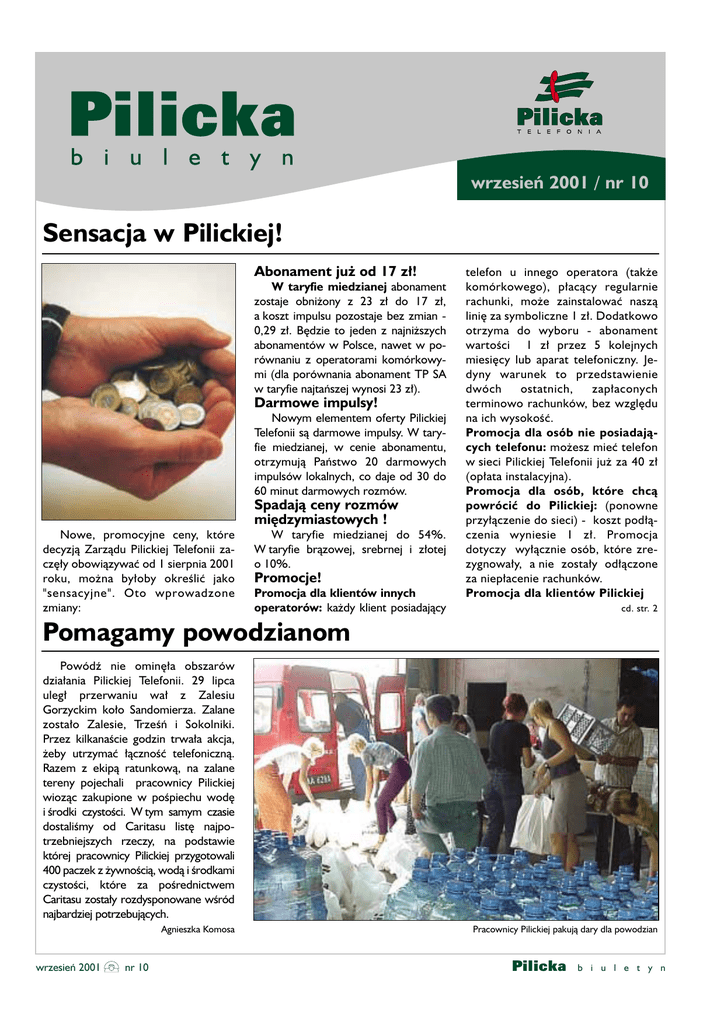 wrzesieñ 2001 / nr 10 Sensacja w Pilickiej! Abonament ju¿ od 17 z³! W taryfie miedzianej abonament zostaje obni¿ony z 23 z³ do 17 z³, a koszt impulsu pozostaje bez zmian 0,29 z³. Bêdzie to jeden z najni¿szych abonamentów w Polsce, nawet w porównaniu z operatorami komórkowymi (dla porównania abonament TP SA w taryfie najtañszej wynosi 23 z³). Darmowe impulsy! Nowym elementem oferty Pilickiej Telefonii s¹ darmowe impulsy. W taryfie miedzianej, w cenie abonamentu, otrzymuj¹ Pañstwo 20 darmowych impulsów lokalnych, co daje od 30 do 60 minut darmowych rozmów. Spadaj¹ ceny rozmów miêdzymiastowych ! Nowe, promocyjne ceny, które decyzj¹ Zarz¹du Pilickiej Telefonii zaczê³y obowi¹zywaæ od 1 sierpnia 2001 roku, mo¿na by³oby okreœliæ jako "sensacyjne". Oto wprowadzone zmiany: W taryfie miedzianej do 54%. W taryfie br¹zowej, srebrnej i z³otej o 10%. Promocje! Promocja dla klientów innych operatorów: ka¿dy klient posiadaj¹cy telefon u innego operatora (tak¿e komórkowego), p³ac¹cy regularnie rachunki, mo¿e zainstalowaæ nasz¹ liniê za symboliczne 1 z³. Dodatkowo otrzyma do wyboru - abonament wartoœci 1 z³ przez 5 kolejnych miesiêcy lub aparat telefoniczny. Jedyny warunek to przedstawienie dwóch ostatnich, zap³aconych terminowo rachunków, bez wzglêdu na ich wysokoœæ. Promocja dla osób nie posiadaj¹cych telefonu: mo¿esz mieæ telefon w sieci Pilickiej Telefonii ju¿ za 40 z³ (op³ata instalacyjna). Promocja dla osób, które chc¹ powróciæ do Pilickiej: (ponowne przy³¹czenie do sieci) - koszt pod³¹czenia wyniesie 1 z³. Promocja dotyczy wy³¹cznie osób, które zrezygnowa³y, a nie zosta³y od³¹czone za niep³acenie rachunków. Promocja dla klientów Pilickiej cd. str. 2 Pomagamy powodzianom PowódŸ nie ominê³a obszarów dzia³ania Pilickiej Telefonii. 29 lipca uleg³ przerwaniu wa³ z Zalesiu Gorzyckim ko³o Sandomierza. Zalane zosta³o Zalesie, Trzeœñ i Sokolniki. Przez kilkanaœcie godzin trwa³a akcja, ¿eby utrzymaæ ³¹cznoœæ telefoniczn¹. Razem z ekip¹ ratunkow¹, na zalane tereny pojechali pracownicy Pilickiej wioz¹c zakupione w poœpiechu wodê i œrodki czystoœci. W tym samym czasie dostaliœmy od Caritasu listê najpotrzebniejszych rzeczy, na podstawie której pracownicy Pilickiej przygotowali 400 paczek z ¿ywnoœci¹, wod¹ i œrodkami czystoœci, które za poœrednictwem Caritasu zosta³y rozdysponowane wœród najbardziej potrzebuj¹cych. Agnieszka Komosa wrzesieñ 2001 nr 10 Pracownicy Pilickiej pakuj¹ dary dla powodzian Pilicka b i u l e t y n 2 Stymulowanie Piotrkowa Sensacja w Pilickiej! cd. ze str. 1 Telefonii: ka¿dy klient Pilickiej Telefonii, który op³aca terminowo rachunki telefoniczne mo¿e zainstalowaæ sobie drug¹ liniê telefoniczn¹ za 1z³. Gwarancja abonamentu! Ostatnia rewelacja dotyczy osób, które skorzystaj¹ z promocji i zainstaluj¹ nasz telefon w taryfie miedzianej: Gwarantujemy im cenê abonamentu nie wy¿sz¹ ni¿ 17z³, do koñca 2002 roku! Któr¹ taryfê wybraæ? Razem z Zarz¹dem Miasta Piotrkowa Trybunalskiego Pilicka Telefonia zorganizowa³a spotkanie poœwiêcone "Mechanizmom stymuluj¹cym rozwój regionów s³abo rozwiniêtych". By³o to pierwsze spotkanie Pilickiej Telefonii z najwiêkszymi firmami regionu piotrkowskiego. Honorowymi prelegentami zaproszonymi na spotkanie byli Prezydent Miasta Piotrkowa Trybunalskiego - Andrzej Pol, przedstawiciel Zarz¹du Business Centre Club oraz przedstawiciel Ministerstwa £¹cznoœci z Warszawy. Celem konferencji by³o przedstawienie sytuacji gospodarczej w regionie piotrkowskim, szukanie nowych rozwi¹zañ, które pozwol¹ na szybszy rozwój regionu oraz porównanie szans i zagro¿eñ maj¹cych wp³yw na kondycjê podmiotów gospodarczych. Spotkanie pozwoli³o przedstawiæ ofertê Pilickiej skierowan¹ do firm i instytucji. Pilicka Telefonia jest obecna na rynku w tym regionie od ponad trzech lat. Istnieje tu dobrze rozwiniêta sieæ telekomunikacyjna, przygotowywane s¹ nowe inwestycje i trwaj¹ prace nad wdro¿eniem nowoczesnych produktów. Ju¿ za kilka miesiêcy bêdziemy mogli zapropontowaæ naszym klientom sta³y dostêp do Internetu. Pilicka Telefonia planuje kolejne spotkania poœwiêcone problemom regionów, w których œwiadczy us³ugi. Nastêpne odbêdzie siê na pocz¹tku paŸdziernika w regionie tarnobrzeskim. Piotr Kolasiñski Pilicka b i u l e t y n Taryfa miedziana - abonament tylko 17 z³. Cena impulsu wynosi 0,29 z³. Koszt rozmów z numerami komórkowymi lub miêdzynarodowymi jest wiêkszy w porównaniu z taryf¹ br¹zow¹, ale bior¹c pod uwagê zarówno wysokoœæ abonamentu, darmowe minuty, jak i koszt rozmów miêdzymiastowych, taryfa miedziana staje siê atrakcyjn¹ dla osób dzwoni¹cych do 50 z³ miesiêcznie. Taryfa br¹zowa - przeznaczona dla klientów dzwoni¹cych od 50 z³ do 85 z³ miesiêcznie. Abonament pozostaje bez zmian - 35 z³, cena impulsu 0,29 z³. Taryfa srebrna - najlepsza dla klientów p³ac¹cych rachunki telefoniczne od 85 z³ do 250 z³ miesiêcznie. Jest tañ- sza od standardowej taryfy TP SA o 6,7%. Abonament wynosi 38 z³ lub 30 z³. Co to oznacza? Otó¿, ka¿demu abonentowi posiadaj¹cemu taryfê srebrn¹, którego rachunek za us³ugi obrotowe wyniesie przynajmniej 85 z³, odliczymy w nastêpnym rachunku 8 z³ od abonamentu, czyli ostatecznie zap³aci on abonament równy 30 z³. Cena impulsu pozostaje bez zmian 0,27 z³. Taryfa z³ota - skierowana do klientów dzwoni¹cych od 250 z³ miesiêcznie. Tañsza od standardowej taryfy TP SA o 10,3 %. Abonament wynosi 45 z³ lub 30 z³. Klient, który wydzwoni³ powy¿ej 250 z³ miesiêcznie (us³ugi obrotowe), w nastêpnym rachunku dostanie odliczenie od abonamentu w wysokoœci 15 z³, czyli ostatecznie zap³aci abonament równy 30 z³. Cena impulsu nie zmieni siê - 0,26 z³. Uwaga! Szczegó³owe warunki promocji dostêpne w Biurach Obs³ugi Klienta lub pod bezp³atnym numerem informacyjnym (048) 384-06-16. Numer jest bezp³atny dla wszys