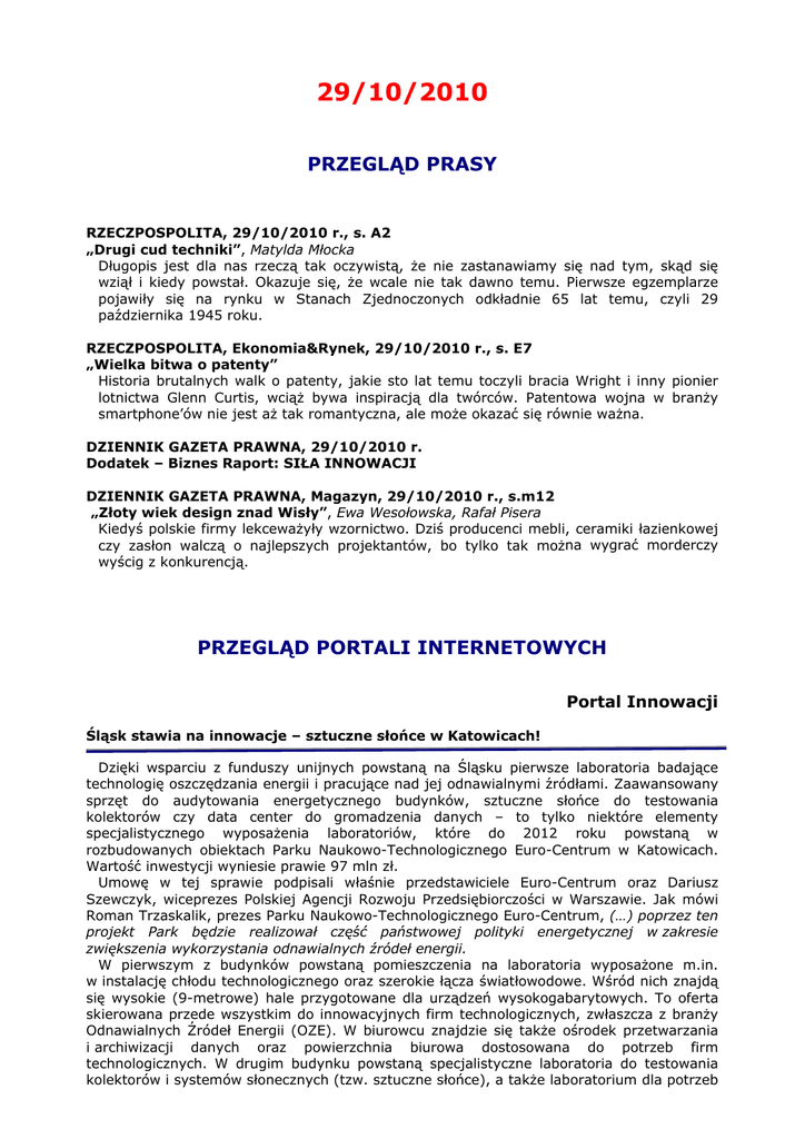 29/10/2010 PRZEGLĄD PRASY RZECZPOSPOLITA, 29/10/2010 r., s. A2 „Drugi cud techniki”, Matylda Młocka Długopis jest dla nas rzeczą tak oczywistą, że nie zastanawiamy się nad tym, skąd się wziął i kiedy powstał. Okazuje się, że wcale nie tak dawno temu. Pierwsze egzemplarze pojawiły się na rynku w Stanach Zjednoczonych odkładnie 65 lat temu, czyli 29 października 1945 roku. RZECZPOSPOLITA, Ekonomia&Rynek, 29/10/2010 r., s. E7 „Wielka bitwa o patenty” Historia brutalnych walk o patenty, jakie sto lat temu toczyli bracia Wright i inny pionier lotnictwa Glenn Curtis, wciąż bywa inspiracją dla twórców. Patentowa wojna w branży smartphone’ów nie jest aż tak romantyczna, ale może okazać się równie ważna. DZIENNIK GAZETA PRAWNA, 29/10/2010 r. Dodatek – Biznes Raport: SIŁA INNOWACJI DZIENNIK GAZETA PRAWNA, Magazyn, 29/10/2010 r., s.m12 „Złoty wiek design znad Wisły”, Ewa Wesołowska, Rafał Pisera Kiedyś polskie firmy lekceważyły wzornictwo. Dziś producenci mebli, ceramiki łazienkowej czy zasłon walczą o najlepszych projektantów, bo tylko tak można wygrać morderczy wyścig z konkurencją. PRZEGLĄD PORTALI INTERNETOWYCH Portal Innowacji Śląsk stawia na innowacje – sztuczne słońce w Katowicach! Dzięki wsparciu z funduszy unijnych powstaną na Śląsku pierwsze laboratoria badające technologię oszczędzania energii i pracujące nad jej odnawialnymi źródłami. Zaawansowany sprzęt do audytowania energetycznego budynków, sztuczne słońce do testowania kolektorów czy data center do gromadzenia danych – to tylko niektóre elementy specjalistycznego wyposażenia laboratoriów, które do 2012 roku powstaną w rozbudowanych obiektach Parku Naukowo-Technologicznego Euro-Centrum w Katowicach. Wartość inwestycji wyniesie prawie 97 mln zł. Umowę w tej sprawie podpisali właśnie przedstawiciele Euro-Centrum oraz Dariusz Szewczyk, wiceprezes Polskiej Agencji Rozwoju Przedsiębiorczości w Warszawie. Jak mówi Roman Trzaskalik, prezes Parku Naukowo-Technologicznego Euro-Centrum, (…) poprzez ten projekt Park będzie realizował część państwowej polityki energetycznej w zakresie zwiększenia wykorzystania odnawialnych źródeł energii. W pierwszym z budynków powstaną pomieszczenia na laboratoria wyposażone m.in. w instalację chłodu technologicznego oraz szerokie łącza światłowodowe. Wśród nich znajdą się wysokie (9-metrowe) hale przygotowane dla urządzeń wysokogabarytowych. To oferta skierowana przede wszystkim do innowacyjnych firm technologicznych, zwłaszcza z branży Odnawialnych Źródeł Energii (OZE). W biurowcu znajdzie się także ośrodek przetwarzania i archiwizacji danych oraz powierzchnia biurowa dostosowana do potrzeb firm technologicznych. W drugim budynku powstaną specjalistyczne laboratoria do testowania kolektorów i systemów słonecznych (tzw. sztuczne słońce), a także laboratorium dla potrzeb prowadzenia audytu energetycznego budynków. Obiekt będzie również siedzibą Centrum Szkoleniowego Nowoczesnych Technik Grzewczych oraz Centrum Testowania Systemów Solarnych. Z jego usług będą mogli korzystać instalatorzy pomp ciepła, kolektorów słonecznych, systemów wentylacji i kotłów na paliwa stałe. Park Naukowo-Technologiczny Euro-Centrum świadczyć będzie także specjalistyczne usługi badawczo-rozwojowe, doradcze i szkoleniowe. Odbiorcami oferty mają być firmy technologiczne działające w branży poszanowania energii i OZE. Przedsięwzięcie finansowane będzie w ramach projektu Utworzenie Parku Naukowo– Technologicznego Euro – Centrum – rozwój i zastosowanie nowych technologii w obszarze poszanowania energii i jej odnawialnych źródeł, realizowanego w ramach Działania 5.3 Programu Operacyjnego Innowacyjna Gospodarka. Głównym celem inicjatywy jest stymulowanie rozwoju firm działających w sektorze poszanowania energii w budynkach. Podejmowane działania dotyczą rozbudowy infrastruktury technicznej Parku Naukowo–Technologicznego Euro–Centrum w Katowicach i stworzenia na Śląsku pierwszych laboratoriów do rozwoju technologii energooszczędnych i odnawialnych źródeł energii. Inwestycja zakłada budowę biurowca pasywnego o powierzchni przeszło 6 335 m2oraz rewitalizację kolejnego budynku o powierzchni przeszło 738 m2. Stworzenie infrastruktury technicznej pozwoli przedsiębiorstwom i zespołom naukowym prowadzić działalność badawczo-rozwojową, ukierunkowaną na rozwój technologii energooszczędnych w budownictwie. Park będzie też koordynował współpracę firm tego sektora w ramach Klastra Technologii Energooszczędnych. Park Naukowo-Technologiczny Euro-Centrum realizuje swoje cele poprzez zróżnicowane działania: oferuje infrastrukturę, wsparcie finansowe, usługi szkoleniowe i doradcze. Ułatwia także dostęp do wiedzy i wyników najnowszych badań z branży oraz tworzy sprzyjające warunki lokalizacji dla firm z sektora zaawansowanych technologii. Zaplecze naukowe parku zapewnia współpraca z ośrodkami badawczymi, m.in. Akademią Górniczo-Hutniczą, Politechniką Śląską, Politechnika Częstochowską oraz Uniwersytetem Śląskim. Instytucje te mają szansę komercjalizować swoje osiągnięcia dzięki współpracy z biznesem, którą umożliwia funkcjonowanie na na terenie parku. Pośredniczy on również w poszukiwaniu partnerów i animuje wspólne przedsięwzięcia biznesowe podmiotów skupionych w ramach Euro-Centrum Klastra Technologii Energooszczędnych. Jest także członkiem konsorcjów naukowo-przemysłowych, które od maja 2010 roku realizują ogólnopolskie projekty badawcze na zlecenie NCBiR: Zoptymalizowanie zużycie energii elektrycznej w budynkach i Zwiększenie wykorzystania energii z OZE w budownictwie. Park Naukowo-Technologiczny Euro-Centrum jest podmiotem działającym w grupie EuroCentrum, która koncentruje się na rozwoju technologii energooszczędnych i poszanowaniu energii w budynkach. W jej skład wchodzą t