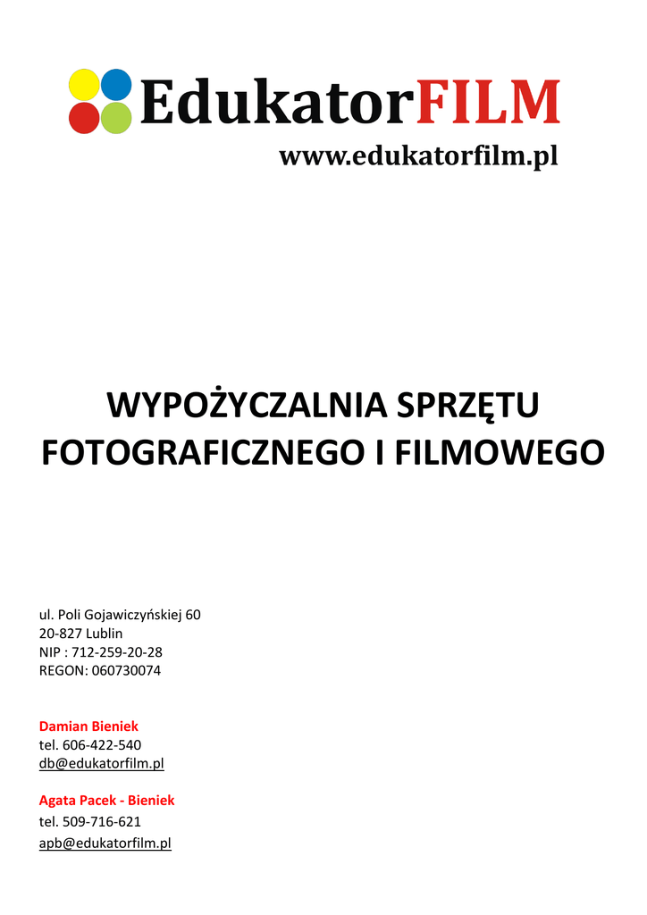 WYPOŻYCZALNIA SPRZĘTU FOTOGRAFICZNEGO I FILMOWEGO ul. Poli Gojawiczyńskiej 60 20-827 Lublin NIP : 712-259-20-28 REGON: 060730074 Damian Bieniek tel. 606-422-540 [email protected] Agata Pacek - Bieniek tel. 509-716-621 [email protected] Canon EOS 5D Mark II body - rozdzielczość Full HD, 1920 x 1080 px, 21,1 mln px, 14 bitowa głębia kolorów - podgląd kadru na LCD, matryca CMOS - filmy w trybie Live View, (16:9) do 12 min, 640 x 480 (4:3) do 24 min - prędkość zapisu 24-25kl./s - zakres czułości matrycy 100 - 6400 ISO - czas otwarcia migawki: od 30s do 1/8000s - zdjęcia seryjne z prędkością 3.9 kl./s - gniazdo do podłączenia zewnętrznego mikrofonu, złącze HDMI - akumulator litowo jonowy i ładowarka - dodatkowa bateria - karta pamięci 32GB San Disk Extreme 250 zł brutto/doba Obiektyw Canon EF 24-105mm f/4 L IS USM - ogniskowa 24 mm, ogniskowanie zmiennoogniskowe zoom - max. przysłona 4, a min. przysłona 22 - kąt widzenia 23,3-84°, dystans min. 25 cm - 8 listków przysłony - powiększenie do 4,3 - filtr UV Hoya 77 mm 100 zł brutto/doba Obiektyw Canon EF 70-300 mm f/4-5.6 IS USM - ogniskowa 70-300 mm - max. przysłona 4, min. przysłona 32 - kąt widzenia 8,2-34,3°, dystans min. 1,5 m - powiększenie 0,26-3,85 - średnica filtra 58 mm - 8 listków przysłony 60 zł brutto/doba DSLR Kit3 Statyw, Follow Focus, Rail System - statyw pasujący do aparatów fotograficznych i kamer - regulowany statyw z podpórką oraz podwójnym uchwytem - follow focus z 6 pierścieniami i pokrętłem - matte box z maskami 12:8 lub 16:9 - mocowanie rod suport z szybkozłączką 120 zł brutto/doba Uchwyt samochodowy CAMTREE-1 2-punktowy typu VACUM - aluminiowy uchwyt podciśnieniowy typu Vacum, samochodowy 2 –punktowy - dla kamer i aparatów do 2.5 kg - do zastosowań wewnętrznych i zewnętrznych - Vacum pozwala na zamocowanie uchwytu na elementach ze szkła lub karoserii samochodu - nastawna regulowana głowica kulowa z hamulcem - po odłączeniu uchwytu aluminiowego dwie przyssawki na dwa aparaty 50 zł brutto/ doba Jazda kamerowa Camera dolly track - jazda kamerowa z torami - regulowana bazooka 90 -120 cm, max obciążenie bazooki 20 kg - regulowane siedzisko góra-dół, płynny obrót siedziskiem - regulowany dyszel dla asystenta wózkarza - system 16-to kołowy skrętny, max załadunek zestawu 180 kg - do prac plenerowych oraz studyjnych - umożliwia konfigurację w system statywowy trzyramienny - składane torowisko x2, długość 600 cm i szerokość 78 cm 300 zł brutto/doba Głowica Manfrotto 504HD - olejowa głowica do aparatów i kamer - perfekcyjnie wybalansowana - zapewnia płynne, lekkie ruchy - obciążenie do 7,5 kg - średnica 75 mm 30 zł brutto/doba; gratis przy wypożyczeniu jazdy kamerowej Zestaw oświetleniowy Red Head - 3 lampy halogenowe ze statywami - moc 3 x 800 W - temperatura barwowa 3200 K, - przy każdej lampie filtr konwertujący temperaturę barwową na 5500 K - waga 2,3 kg (3 x 50 zł) 150 zł brutto/doba Mikrofon Audio Technica ATR-6550 Video Camera Condenser Shotgun Microphone Canon - nasadka do aparatów i kamer - dodatkowa nasadka - pianka na mikrofon - bateria AA 30 zł brutto/doba Laptop Sony VAIO VPC-F13M1E/H - procesor Intel Core i5-560M - przekątna ekranu 16,4 cala - rozdzielczość Full HD: 1920 x 1080 px - pamięć RAM 4 GB - pojemność dysku 500 GB - karta graficzna: GeForce GT 425M z pamięcią 1GB - system operacyjny: Windows 7 Home Premium 64bit - napęd optyczny: Blu-ray Combo 150 zł brutto/doba Klaps filmowy - klaps suchościeralny - nadruk na obydwu stronach - pisak - gąbka 15 zł brutto/doba Megafon - moc 10W - nagrywanie/odtwarzanie 10s - syrena - regulacja głośności - max zasięg 100m w zależności od warunków - zasilanie 4x1.5V D (LR20) - waga 0.6kg - średnica 155mm, długość 245mm gratis powyżej 200 zł brutto /doba