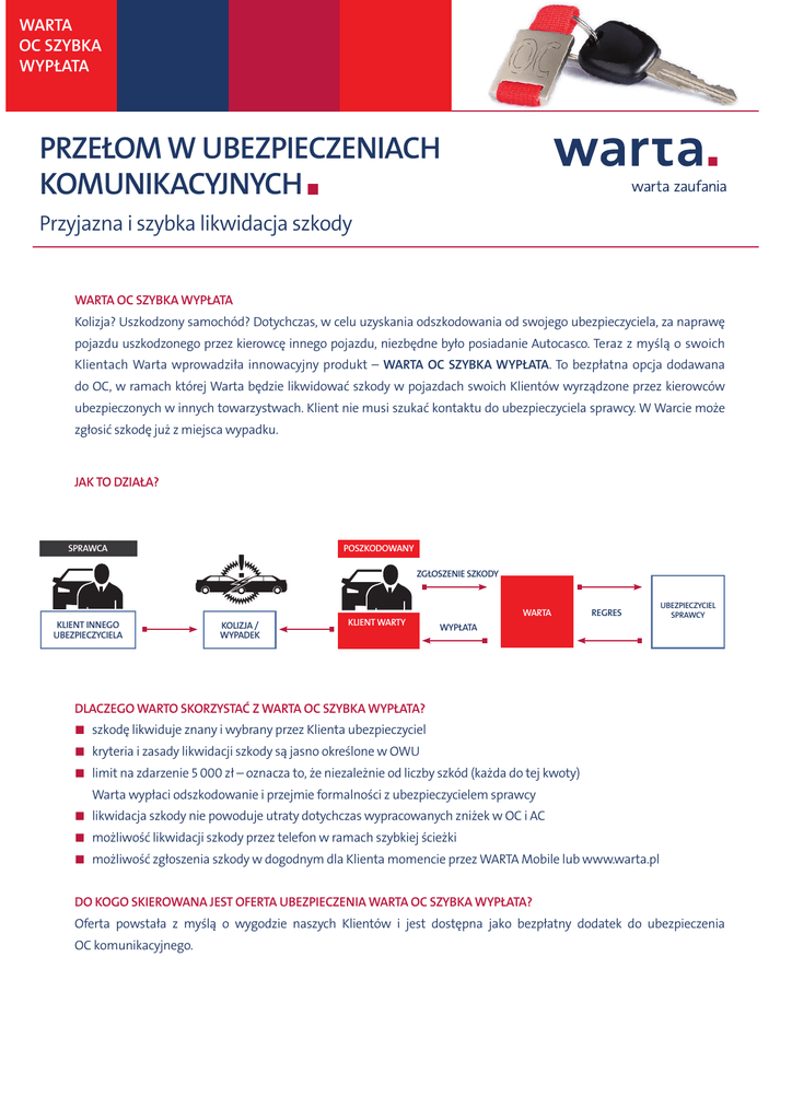WARTA OC SZYBKA WYPŁATA PRZEŁOM W UBEZPIECZENIACH KOMUNIKACYJNYCH Przyjazna i szybka likwidacja szkody WARTA OC SZYBKA WYPŁATA Kolizja? Uszkodzony samochód? Dotychczas, w celu uzyskania odszkodowania od swojego ubezpieczyciela, za naprawę pojazdu uszkodzonego przez kierowcę innego pojazdu, niezbędne było posiadanie Autocasco. Teraz z myślą o swoich Klientach Warta wprowadziła innowacyjny produkt – WARTA OC SZYBKA WYPŁATA. To bezpłatna opcja dodawana do OC, w ramach której Warta będzie likwidować szkody w pojazdach swoich Klientów wyrządzone przez kierowców ubezpieczonych w innych towarzystwach. Klient nie musi szukać kontaktu do ubezpieczyciela sprawcy. W Warcie może zgłosić szkodę już z miejsca wypadku. JAK TO DZIAŁA? SPRAWCA POSZKODOWANY ZGŁOSZENIE SZKODY WARTA KLIENT INNEGO UBEZPIECZYCIELA KOLIZJA / WYPADEK KLIENT WARTY REGRES UBEZPIECZYCIEL SPRAWCY WYPŁATA DLACZEGO WARTO SKORZYSTAĆ Z WARTA OC SZYBKA WYPŁATA? ◼ szkodę likwiduje znany i wybrany przez Klienta ubezpieczyciel ◼ kryteria i zasady likwidacji szkody są jasno określone w OWU ◼ limit na zdarzenie 5 000 zł – oznacza to, że niezależnie od liczby szkód (każda do tej kwoty) Warta wypłaci odszkodowanie i przejmie formalności z ubezpieczycielem sprawcy ◼ likwidacja szkody nie powoduje utraty dotychczas wypracowanych zniżek w OC i AC ◼ możliwość likwidacji szkody przez telefon w ramach szybkiej ścieżki ◼ możliwość zgłoszenia szkody w dogodnym dla Klienta momencie przez WARTA Mobile lub www.warta.pl DO KOGO SKIEROWANA JEST OFERTA UBEZPIECZENIA WARTA OC SZYBKA WYPŁATA? Oferta powstała z myślą o wygodzie naszych Klientów i jest dostępna jako bezpłatny dodatek do ubezpieczenia OC komunikacyjnego.