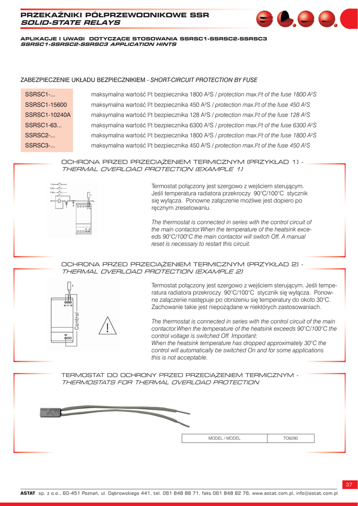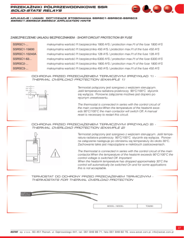 PRZEKAŹNIKI PÓŁPRZEWODNIKOWE SSR SOLID-STATE RELAYS APLIKACJE I UWAGI DOTYCZĄCE STOSOWANIA SSRSC1-SSRSC2-SSRSC3 SSRSC1-SSRSC2-SSRSC3 APPLICATION HINTS ZABEZPIECZENIE UKŁADU BEZPIECZNIKIEM - SHORT-CIRCUIT PROTECTION BY FUSE SSRSC1-... maksymalna wartość I²t bezpiecznika 1800 A²S / protection max.I²t of the fuse 1800 A²S SSRSC1-15600 maksymalna wartość I²t bezpiecznika 450 A²S / protection max.I²t of the fuse 450 A²S SSRSC1-10240A maksymalna wartość I²t bezpiecznika 128 A²S / protection max.I²t of the fuse 128 A²S SSRSC1-63... maksymalna wartość I²t bezpiecznika 6300 A²S / protection max.I²t of the fuse 6300 A²S SSRSC2-... maksymalna wartość I²t bezpiecznika 1800 A²S / protection max.I²t of the fuse 1800 A²S SSRSC3-... maksymalna wartość I²t bezpiecznika 450 A²S / protection max.I²t of the fuse 450 A²S OCHRONA PRZED PRZECIĄŻENIEM TERMICZNYM (PRZYKŁAD 1) - THERMAL OVERLOAD PROTECTION (EXAMPLE 1) Termostat połączony jest szergowo z wejściem sterującym. Jeśli temperatura radiatora przekroczy 90°C/100°C stycznik się wyłącza. Ponowne załączenie możliwe jest dopiero po ręcznym zresetowaniu. The thermostat is connected in series with the control circuit of the main contactor.When the temperature of the heatsink exceeds 90°C/100°C the main contactor will switch Off. A manual reset is necessary to restart this circuit. OCHRONA PRZED PRZECIĄŻENIEM TERMICZNYM (PRZYKŁAD 2) - THERMAL OVERLOAD PROTECTION (EXAMPLE 2) Termostat połączony jest szergowo z wejściem sterującym. Jeśli temperatura radiatora przekroczy 90°C/100°C stycznik się wyłącza. Ponowne załączenie następuje po obniżeniu się temperatury do około 30°C. Zachowanie takie jest niepożądane w niektórych zastosowaniach. The thermostat is connected in series with the control circuit of the main contactor.When the temperature of the heatsink exceeds 90°C/100°C the control voltage is switched Off. Important: When the heatsink temperature has dropped approximately 30°C the control will automatically be switched On and for some applications this is not acceptable. TERMOSTAT DO OCHRONY PRZED PRZECIĄŻENIEM TERMICZNYM - THERMOSTATS FOR THERMAL OVERLOAD PROTECTION MODEL / MODEL TO6290 37 ASTAT sp. z o.o., 60-451 Poznań, ul. Dąbrowskiego 441, tel. 061 848 88 71, faks 061 848 82 76, www.astat.com.pl, [email protected] PRZEKAŹNIKI PÓŁPRZEWODNIKOWE SSR SOLID-STATE RELAYS APLIKACJE I UWAGI DOTYCZĄCE STOSOWANIA SSRSC1-SSRSC2-SSRSC3 SSRSC1-SSRSC2-SSRSC3 APPLICATION HINTS 3 fazy z zerem 400/690 V AC 3 Ph with Neutral 400/690 V Pojedyncza faza 400 VAC Single Phase 400 VAC 3 fazy z zerem 230/400 V AC 3 Ph with Neutral 230/400 V 3 fazy z zerem 400/690 V AC 3 Ph with Neutral 400/690 V 3 fazy bez zera 230 V AC 3 Ph without Neutral 230 V 3 fazy bez zera 230 V AC 3 Ph without Neutral 230 V 3 fazy bez zera 230 V AC 3 Ph without Neutral 230 V 3 fazy bez zera 230 V AC 3 Ph without Neutral 230 V 3 fazy bez zera 400/480 V AC 3Ph without Neutral 400/480 V 3 fazy bez zera 400/480 V AC 3Ph without Neutral 400/480 V 3 fazy bez zera 400/480 V AC 3Ph without Neutral 400/480 V 3 fazy bez zera 400/480 V AC 3Ph without Neutral 400/480 V Ekonomiczne połączenie układu w gwiazdę Ekonomiczne połączenie układu w trójkąt 38 ASTAT sp. z o.o., 60-451 Poznań, ul. Dąbrowskiego 441, tel. 061 848 88 71, faks 061 848 82 76, www.astat.com.pl, [email protected]