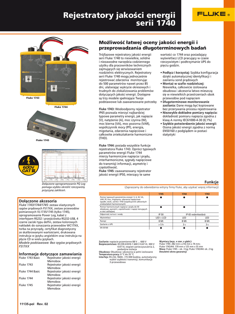 Rejestratory jakości energii serii 1740 Możliwość łatwej oceny jakości energii i przeprowadzania długoterminowych badań Trójfazowe rejestratory jakości energii serii Fluke 1740 to niewielkie, solidne i niezawodne narzędzia codziennego użytku dla pracowników technicznych zajmujących się serwisowaniem rozdzielnic elektrycznych. Rejestratory serii Fluke 1740 mogą jednocześnie rejestrować zdarzenia monitorując do 500 parametrów nawet przez 85 dni, ułatwiając wykrycie okresowych i trudnych do zlokalizowania problemów dotyczących jakości energii. Dostępne są trzy modele spełniające Twoje podstawowe lub zaawansowane potrzeby Fluke 1743 Fluke 1744 Fluke 1745 Fluke 1743: Wodoodporny rejestrator IP65 pozwala mierzyć najbardziej typowe parametry energii, jak napięcie (V), natężenie (A), moc czynna (W), moc bierna (VA), moc pozorna (VAR), współczynnik mocy (PF), energia, migotania, zdarzenia napięciowe i całkowite zniekształcenie harmoniczne (THD). wartości co 1744 oraz posiadający wyświetlacz LCD pracujący w czasie rzeczywistym i podtrzymanie UPS do pięciu godzin. •Podłącz i korzystaj: Szybka konfiguracja dzięki automatycznej identyfikacji i zasilaniu sond prądowych •Montaż w szafie rozdzielczej: Niewielka, całkowicie izolowana obudowa i akcesoria łatwo mieszczą się w niewielkich przestrzeniach obok przewodów pod napięciem •Długoterminowe monitorowanie zasilania: Dane mogą być kopiowane bez przerywania procesu rejestrowania •Niezwykle dokładne pomiary napięcia: dokładność pomiaru napięcia zgodna z klasą A normy IEC61000-4-30 (0,1%) •Szybkie potwierdzenie jakości energii: Ocena jakości energii zgodna z normą EN50160 z podglądem w postaci statystyki Fluke 1744: posiada wszystkie funkcje rejestratora Fluke 1743. Oprócz typowych parametrów energii Fluke 1744 mierzy harmoniczne napięcia i prądu, interharmoniczne, sygnały napięciowe do transmisji informacji, asymetrię i częstotliwość. Fluke 1745: zaawansowany rejestrator jakości energii IP50, mierzący te same Funkcje Dołączone oprogramowanie PQ Log pomaga szybko określić rzeczywistą przyczynę zakłóceń. Dołączone akcesoria Fluke 1743/1744/1745: zestaw elastycznych cęgów prądowych FS17XX, zestaw przewodów pomiarowych VL1735/1745 (tylko 1745), oprogramowanie Power Log, kabel z interfejsem RS232 i przejściówka RS232-USB, 4 czarne zaciski typu delfin, zestaw kolorowych nakładek do oznaczania przewodów WC17XX, torba na przyrządy, certyfikat diagnostyczny ze skalibrowanymi wartościami, drukowana instrukcja w języku angielskim oraz instrukcja na płycie CD w wielu językach. Modele podstawowe: Bez cęgów prądowych FS17XX Informacje dotyczące zamawiania Fluke 1743 Basic Fluke 1743 Fluke 1744 Basic Fluke 1744 Fluke 1745 Rejestrator jakości energii Memobox Rejestrator jakości energii Memobox Rejestrator jakości energii Memobox Rejestrator jakości energii Memobox Rejestrator jakości energii Memobox 11135-pol Rev. 02 (Zapraszamy do odwiedzenia witryny firmy Fluke, aby uzyskać więcej informacji) Pomiar typowych parametrów energii: V, A, W, VA, VAR, PF, moc, migotanie, zdarzenia napięciowe (spadki, skoki, zaniki) i THD (współczynnik całkowitych zniekształceń harmonicznych) Pomiar harmonicznych napięcia i prądu do 50 składowej, asymetrii, częstotliwości i napięć sterujących w sieci zasilającej Odporność na kurz i wodę Wyświetlacz Pamięć Zasilanie z UPS EN 50160 1745 ● 1744 ● ● ● IP 50 LED + LCD 8 Mt >5h ● Zasilanie: napięcie przemienne 88 V … 660 V Bezpieczeństwo: IEC/EN 61010-1 600 V KAT III, 300 V KAT IV, stopień zanieczyszczenia 2, podwójna izolacja Obudowa: Obudowa i akcesoria w pełni izolowane Temperatura pracy: 0 °C do 35 °C Interfejs: RS 232, 9600...115 000 bodów, automatyczny wybór szybkości transmisji, komunikacja 3-przewodowa 1743 ● IP 65 vedenkestävä LED LED 8 Mt 8 Mt 3s 3s ● ● Wymiary (wys. x szer. x głęb.): Fluke 1745: 282 mm x 216 mm x 74 mm; Fluke 1743/44: 170 mm x 125 mm x 55 mm Masa: Fluke 1745 – ok. 3 kg; Fluke 1743/44: ok. 2 kg Dwuletni okres gwarancji