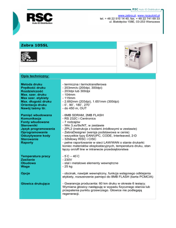 www.zebra.pl, www.rscautoid.pl tel. + 48 22 510 14 40, fax. + 48 22 741 69 33 ul. Białołęcka 158E, 03-253 Warszawa Zebra 105SL Opis techniczny: Metoda druku Prędkość druku Rozdzielczość Max. szer. druku Max szer. etykiety Max. długość druku Orientacja druku Nawój taśmy ttr. - termiczna i termotransferowa - 203mm/s (200dpi, 300dpi) - 203dpi lub 300dpi - 104mm - 115mm - 2.692mm (203dpi), 1.651mm (300dpi) - 0˚, 90˚, 180˚, 270˚ - do 450 m, OUT Pamięć wbudowana Komunikacja Fonty wbudowane Sterowniki Język programowania Oprogramowanie Odczytywane kody Sterowanie Raporty - 6MB SDRAM, 2MB FLASH - RS 232C i Centronics - 7 rodzajów - Win 3.xx/9x/NT, w zestawie - ZPL2 (instrukcja z kodami źródłowymi w zestawie) - ZebraDesigner (wersja podstawowa w cenie) - wszystkie typy EAN/UPC, CODE, Interleaved, 2-D - 32bitowy RISC i CISC - pełne raportowanie w sieci LAW/WAN o stanie drukarki: koniec materiałów eksploatacyjnych, temperatura druku, stan łączy on/off line w intranecie przedsiębiorstwa Temperatura pracy Zasilanie Obudowa Waga - 5˚C – 40˚C - 230V - stal i metalowe elementy wewnętrzne - 25 kg Opcje - obcinak, nawijak wewnętrzny, funkcja wstępnego odklejania etykiety, rozszerzenie pamięci do 8MB FLASH (karta PCMCIA) Głowica drukująca - Gwarancja producenta: 60 km druku w okresie 6 iesięcy. Wymiana głowicy następuję w wypadu fizycznego starcia lub przepalenia punktu grzewczego. Głowice nie podlegają regeneracji.