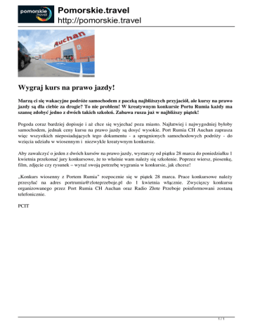 Pomorskie.travel http://pomorskie.travel Wygraj kurs na prawo jazdy! Marzą ci się wakacyjne podróże samochodem z paczką najbliższych przyjaciół, ale kursy na prawo jazdy są dla ciebie za drogie? To nie problem! W kreatywnym konkursie Portu Rumia każdy ma szansę zdobyć jedno z dwóch takich szkoleń. Zabawa rusza już w najbliższy piątek! Pogoda coraz bardziej dopisuje i aż chce się wyjechać poza miasto. Najłatwiej i najwygodniej byłoby samochodem, jednak ceny kursu na prawo jazdy są dosyć wysokie. Port Rumia CH Auchan zaprasza więc wszystkich nieposiadających tego dokumentu - a spragnionych samochodowych podróży - do wzięcia udziału w wiosennym i niezwykle kreatywnym konkursie. Aby zawalczyć o jeden z dwóch kursów na prawo jazdy, wystarczy od piątku 28 marca do poniedziałku 1 kwietnia przekonać jury konkursowe, że to właśnie wam należy się szkolenie. Poprzez wiersz, piosenkę, film, zdjęcie czy rysunek – wyraź swoją potrzebę wygrania w konkursie, jak chcesz! „Konkurs wiosenny z Portem Rumia” rozpocznie się w piątek 28 marca. Prace konkursowe należy przesyłać na adres [email protected] do 1 kwietnia włącznie. Zwycięzcy konkursu organizowanego przez Port Rumia CH Auchan oraz Radio Złote Przeboje poinformowani zostaną telefonicznie. PCIT 1/1 Powered by TCPDF (www.tcpdf.org)