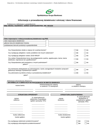 Załącznik nr ..5 do Instrukcji udzielania i monitoringu kredytów konsumenckich w Banku Spółdzielczym w Skórczu. Informacja o prowadzonej działalności rolniczej i dane finansowe Podstawowe informacje o gospodarstwie IMIĘ/ IMIONA, NAZWISKO, ADRES GOSPODARSTWA, NIP, REGON Data rozpoczęcia i rodzaj prowadzonej działalności wg PKD data rozpoczęcia działalności główne kierunki działalności/ branża podstawowe kierunki produkcji w gospodarstwie Czy Gospodarstwo działa w więcej niż w jednej branży? tak nie Czy występują zaległości z tytułu podatków lub innych należności? tak nie Czy występują zaległości wobec ZUS/ KRUS? tak nie Czy wobec Gospodarstwa toczy się postępowanie cywilne, egzekucyjne, karne, karne skarbowe, naprawcze lub upadłościowe? tak nie tak nie Czy terminowo obsługiwane są zobowiązania z tytułu zaciągniętych kredytów/ poręczeń/ gwarancji/ leasingu/ wystawionych weksli? tak nie Czy planowane są istotne zmiany w prowadzonej działalności? tak nie Czy Gospodarstwo jest powiązana z innymi podmiotami? jakimi?: jakie?: Informacje ekonomiczno-finansowe INFORMACJA O OBROTACH NA RACHUNKACH W INNYCH BANKACH średniomiesięczne wpływy nazwa banku w ostatnich 12 miesiącach STRUKTURA SPRZEDAŻY nazwa odbiorcy ......................... ......................... ......................... ......................... ......................... liczba odbiorców: kwota ogółem: % udział głównych odbiorców w sprzedaży ogółem (powyżej 10%) ......................... ......................... ......................... ......................... ......................... ......................... ......................... wpływy w ostatnim miesiącu STRUKTURA ZAOPATRZENIA nazwa dostawcy ......................... ......................... ......................... ......................... ......................... liczba dostawców: kwota ogółem: % udział głównych dostawców w zaopatrzeniu ogółem (powyżej 10%) ......................... ......................... ......................... ......................... ......................... ......................... ......................... Czy występują należności przeterminowane? tak nie Czy występują zobowiązania przeterminowane? tak nie Załącznik nr ..5 do Instrukcji udzielania i monitoringu kredytów konsumenckich w Banku Spółdzielczym w Skórczu. NALEŻNOŚCI I ZOBOWIĄZANIA OGÓŁEM należności na dzień: zobowiązania na dzień: ogółem W TYM NALEŻNOŚCI I ZOBOWIĄZANIA PRZETERMINOWANE okres należności przeterminowane (w dniach) na dzień……………….kwota nazwa podmiotu zobowiązania przeterminowane dzień………………… nazwa na podmiotu kwota <30 30-60 60-90 90-180 >180 razem Zobowiązania z tytułu kredytów, pożyczek, poręczeń, inne nazwa instytucji finansującej rodzaj kredytu i przeznaczenie razem kredyty razem poręczenia kwota i waluta udzielonego kredytu /zł/ zadłużenie na dzień /zł/ spłata kapitału spłata odsetek oprocentowanie zabezpieczenie okres kredytowania Zobowiązania z tytułu leasingu, kredytu kupieckiego/ pożyczki od udziałowców, podmiotów powiązanych gwarancji, faktoringu kwota ogółem nazwa instytucji rodzaj zobowiązania kwota i waluta wg umowy kwota pozostająca do spłaty termin wygaśnięcia/ spłaty uwagi: inne istotne warunki umowy Świadom(i) odpowiedzialności karnej, wynikającej m.in. z art. 297 § 1 ustawy z dn. 6.06.1997 r. – Kodeks karny (Dz. U. nr 88 poz. 553 z późn. zm.), oświadczam(y), że wszystkie informacje podane we wniosku o przyznanie kredytu/ pożyczki i załączonych do niego dokumentach są prawdziwe. miejscowość, data pieczęć i podpis Kredytobiorcy/ów Załącznik nr ..5 do Instrukcji udzielania i monitoringu kredytów konsumenckich w Banku Spółdzielczym w Skórczu. Rachunek wyników imię i nazwisko: w okresie ostatnich 12 miesięcy analizowane okresy A. Przychody ogółem (A=1+2+3+4) 1. przychody z tyt. produkcji zwierzęcej 2. przychody z tyt. produkcji roślinnej 3. dopłaty bezpośrednie 4. inne przychody B. Koszty ogółem (B=1+2) 1. Koszty produkcji zwierzęcej (1=a+b+c) a. zakup pasz b. zakup zwierząt c. inne koszty 2. Koszty produkcji roślinnej (2=a+b+c+d+e) a. materiał siewny b. nawozy mineralne c. pestycydy d. usługi e. inne koszty C. Koszty pośrednie D. Koszty obsługi kredytów, w tym Długoterminowych Krótkoterminowych E. Razem koszty (E=B+C+D) F. Dochód z gospodarstwa (F=A-E) G. Spłata kredytów długoterminowych H. Dochód po spłacie kredytów (H=F-G) I. Przychody spoza gospodarstwa J. Koszty przychodów spoza gospodarstwa K. Dochód spoza gospodarstwa (K=I-J) L. Koszty utrzymania rodziny M. Dochód dyspozycyjny (M=H+K-L) Zyskowność z gospodarstwa [%] (F/A x 100%) komentarz: miejscowość, data pieczęć i podpis Kredytobiorcy/ów