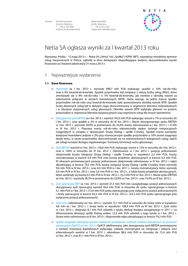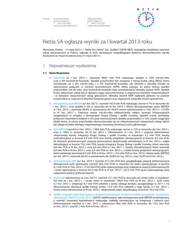 Kontakt: Andrzej Kondracki (Investor Relations) T +48 22 352 4060 [email protected] Małgorzata Babik (Public Relations) T +48 22 352 2520 [email protected] Netia SA ogłasza wyniki za I kwartał 2013 roku Warszawa, Polska – 15 maja 2013 r. – Netia SA („Netia” lub „Spółka”) (GPW: NET), największy niezależny operator usług stacjonarnych w Polsce, ogłosiła w dniu dzisiejszym niepodlegające badaniu skonsolidowane wyniki finansowe za I kwartał zakończony 31 marca 2013 r. 1 Najważniejsze wydarzenia 1.1 Dane finansowe • Przychody za I kw. 2013 r. wyniosły 490,7 mln PLN wykazując spadek o 10% rok-do-roku oraz o 6% kwartał-do-kwartału. Spadek przychodów był związany z niższą liczbą usług (RGU), które zmniejszyły się o 8% rok-do-roku i o 3% kwartał-do-kwartału, jak również z obniżką stawek za zakończenie połączeń w sieciach komórkowych (MTR). Netia szacuje, że jedna trzecia spadku przychodów rok-do-roku oraz kwartał-do-kwartału była spowodowana obniżką stawek MTR. Spadek liczby aktywnych usług był w dalszym ciągu skoncentrowany w segmencie klientów indywidualnych i w obszarze stacjonarnych usług głosowych. Obniżka stawek MTR wpłynęła głównie na poziom przychodów w segmencie klientów korporacyjnych oraz segmencie usług dla innych operatorów. • Skorygowany zysk EBITDA za I kw. 2013 r. wyniósł 142,0 mln PLN wykazując wzrost o 7% w stosunku do I kw. 2012 r. oraz spadek o 2% w stosunku do IV kw. 2012 r. Marża skorygowanego zysku EBITDA w I kw. 2013 r. wyniosła 28,9% w porównaniu do 24,4% marży odnotowanej w I kw. 2012 r. i 27,8% w IV kw. 2012 r. Poprawa marży rok-do-roku odzwierciedla wpływ synergii integracyjnych osiągniętych w związku z akwizycjami Grupy Dialog i spółki Crowley. Spadek marży pomiędzy kolejnymi kwartałami jedynie o 2% przy równoczesnym spadku przychodów o 10% został osiągnięty dzięki temu, iż utrata przychodów skoncentrowała się na niskomarżowych kategoriach usług, takich jak usługi na bazie dostępu regulowanego i hurtowej terminacji ruchu głosowego. • Zysk EBITDA wyniósł w I kw. 2013 r. 138,6 mln PLN, wykazując wzrost o 12% w stosunku do I kw. 2012 r. oraz o 156% w stosunku do IV kw. 2012 r. Odnotowane w I kw. 2013 r. pozycje jednorazowe obejmowały koszty integracji Grupy Dialog i spółki Crowley w wysokości 2,2 mln PLN, koszty restrukturyzacji w kwocie 0,9 mln PLN oraz koszty projektów akwizycyjnych w kwocie 0,3 mln PLN. W okresach porównawczych pozycje jednorazowe obejmowały odnotowany w IV kw. 2012 r. odpis aktualizujący w kwocie 79,2 mln PLN, koszty integracji Grupy Dialog i spółki Crowley, które wyniosły 9,8 mln PLN w IV kw. 2012 r. oraz 6,0 mln PLN w I kw. 2011 r., koszty restrukturyzacji, które wyniosły 0,9 mln PLN w IV kw. 2012 r. oraz 2,6 mln PLN w I kw. 2012 r., a także koszty projektów akwizycyjnych, które zamknęły się kwotą 0,5 mln PLN w IV kw. 2012 r. i 0,2 mln PLN w I kw. 2012 r. Marża zysku EBITDA za I kw. 2013 r. wyniosła 28,3% w porównaniu do 22,8% za I kw. 2012 r. oraz 10,4% za IV kw. 2012 r. • Zysk operacyjny EBIT za I kw. 2013 r. wyniósł 27,3 mln PLN (nie uwzględniając pozycji jednorazowych skorygowany zysk operacyjny wyniósł 30,6 mln PLN) w stosunku do zysku operacyjnego w kwocie 4,1 mln PLN w I kw. 2012 r. (13,0 mln PLN zysku operacyjnego przy wyłączeniu pozycji jednorazowych) i straty operacyjnej w kwocie 65,2 mln PLN w IV kw. 2012 r. (25,2 mln PLN zysku operacyjnego przy wyłączeniu pozycji jednorazowych). • Zysk netto odnotowany za I kw. 2013 r. wyniósł 13,1 mln PLN w stosunku do straty netto w wysokości 9,8 mln za I kw. 2012 r. i straty netto w wysokości 108,9 mln PLN za IV kw. 2012 r. Zysk netto w I kw. 2013 r. obejmuje 8,7 mln PLN odsetek z tytułu obsługi kredytu zaciągniętego w 2011 r. na sfinansowanie akwizycji spółki Dialog wobec 13,3 mln PLN odsetek z tego tytułu w I kw. 2012 r. Strata netto odnotowana za IV kw. 2012 r. obejmowała odpis aktualizujący w kwocie 79,2 mln PLN. • Spółka osiągnęła rekordowy poziom dodatnich przepływów wolnych środków pieniężnych na poziomie operacyjnym (OpFCF) w I kw. 2013 r. OpFCF zdefiniowany jako skorygowany zysk EBITDA pomniejszony o wartość inwestycji kapitałowych wyłączając nakłady inwestycyjne na integrację i nabycia sieci ethernetowych wyniósł w I kw. 2013 r. rekordowe 98,6 mln PLN w stosunku do 73,4 mln PLN w I kw. 2012 r. oraz 81,1 mln PLN w IV kw. 2012 r. 1 • Środki pieniężne i depozyty krótkoterminowe na dzień 31 marca 2013 r. wyniosły 98,3 mln PLN, co stanowiło spadek o 44,4 mln PLN w stosunku do ich poziomu z dnia 31 grudnia 2012 r., natomiast całkowite zadłużenie wyniosło 562,5 mln PLN, co stanowiło wzrost o 11,9 mln PLN w stosunku do poziomu zadłużenia z dnia 31 grudnia 2012 r. Dług netto wyniósł zatem 464,2 mln PLN, co stanowiło wzrost o 56,3 mln PLN w porównaniu do 407,9 mln PLN na dzień 31 grudnia 2012 r., a dźwignia finansowa stanowiła wielokrotność 0,88x skorygowanego zysku EBITDA prognozowanego na 2013 r. w wysokości 525 mln PLN. Ponadto, na dzień 31 marca 2013 r. Netia posiadała na rachunku powierniczym kwotę 129,0 mln PLN, oczekującą na zakończenie oferty nabycia przez Netię 16,0 mln akcji własnych, która jest otwarta do dnia 22 maja 2013 r. Uwzględniając wyżej wspomniane środki na rachunku powierniczym, dług netto pro forma na dzień 31 marca 2013 r. zmniejszył się o 18% kwartał-do-kwartału do 335,2 mln PLN, a dźwignia finansowa pro forma stanowiła wielokrotność 0,64x prognozy skorygowanego zysku EBITDA na 2013 r. • Netia ogłosiła w marcu 2013 r. ofertę zakupu akcji własnych („Oferta”), w ramach której zamierza nabyć nie więcej niż 16,0 mln akcji własnych stanowiących nie więcej niż 4,15% kapitału zakładowego Spółki i nie więcej niż 4,15% ogólnej liczby głosów na walnym zgromadzeniu, przeznaczając na ten cel kwotę 128,1 mln PLN. Oferowana cen