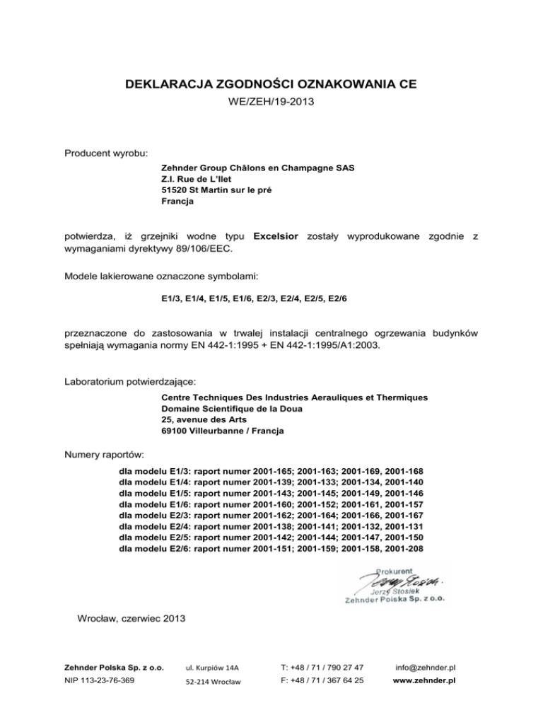 DEKLARACJA ZGODNOŚCI OZNAKOWANIA CE WE/ZEH/19-2013 Producent wyrobu: Zehnder Group Châlons en Champagne SAS Z.I. Rue de L’llet 51520 St Martin sur le pré Francja potwierdza, iż grzejniki wodne typu Excelsior zostały wyprodukowane zgodnie z wymaganiami dyrektywy 89/106/EEC. Modele lakierowane oznaczone symbolami: E1/3, E1/4, E1/5, E1/6, E2/3, E2/4, E2/5, E2/6 przeznaczone do zastosowania w trwalej instalacji centralnego ogrzewania budynków spełniają wymagania normy EN 442-1:1995 + EN 442-1:1995/A1:2003. Laboratorium potwierdzające: Centre Techniques Des Industries Aerauliques et Thermiques Domaine Scientifique de la Doua 25, avenue des Arts 69100 Villeurbanne / Francja Numery raportów: dla modelu E1/3: raport numer 2001-165; 2001-163; 2001-169, 2001-168 dla modelu E1/4: raport numer 2001-139; 2001-133; 2001-134, 2001-140 dla modelu E1/5: raport numer 2001-143; 2001-145; 2001-149, 2001-146 dla modelu E1/6: raport numer 2001-160; 2001-152; 2001-161, 2001-157 dla modelu E2/3: raport numer 2001-162; 2001-164; 2001-166, 2001-167 dla modelu E2/4: raport numer 2001-138; 2001-141; 2001-132, 2001-131 dla modelu E2/5: raport numer 2001-142; 2001-144; 2001-147, 2001-150 dla modelu E2/6: raport numer 2001-151; 2001-159; 2001-158, 2001-208 Wrocław, czerwiec 2013 Zehnder Polska Sp. z o.o. ul. Kurpiów 14A T: +48 / 71 / 790 27 47 [email protected] NIP 113-23-76-369 52-214 Wrocław F: +48 / 71 / 367 64 25 www.zehnder.pl