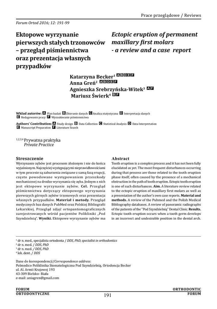 Prace przeglądowe / Reviews Forum Ortod 2016; 12: 191-99 Ektopowe wyrzynanie pierwszych stałych trzonowców – przegląd piśmiennictwa oraz prezentacja własnych przypadków Ectopic eruption of permanent maxillary first molars - a review and a case report Katarzyna Becker1 A B D E F Anna Greń2 A B D E F Agnieszka Srebrzyńska-Witek3 Mariusz Świerk4 B F A F Wkład autorów: A Plan badań B Zbieranie danych C Analiza statystyczna D Interpretacja danych E Redagowanie pracy F Wyszukiwanie piśmiennictwa Authors’ Contribution: A Study design B Data Collection C Statistical Analysis D Data Interpretation E Manuscript Preparation F Literature Search 1,2,3,4 Prywatna praktyka Private Practice Streszczenie Wyrzynanie zębów jest procesem złożonym i nie do końca wyjaśnionym. Najczęściej występującymi nieprawidłowościami w tym procesie są zaburzenia związane z samą fazą erupcji, często powodowane występowaniem przeszkody mechanicznej na drodze wyrzynania się zęba. Jednym z nich jest ektopowe wyrzynanie zębów. Cel. Przegląd piśmiennictwa dotyczący ektopowego wyrzynania pierwszych górnych zębów trzonowych oraz prezentacja własnych przypadków. Materiał i metody. Przegląd medycznych baz danych PubMed oraz Polskiej Bibliografii Lekarskiej. Przegląd zdjęć ortopantomograficznych zarejestrowanych wśród pacjentów Polikliniki „Pod Szyndzielnią”. Wyniki. Ektopowe wyrzynanie zębów ma Abstract Tooth eruption is a complex process and it has not been fully elucidated as yet. The most frequent disturbances occurring during that process are those related to the tooth eruption phase itself, often caused by the presence of a mechanical obstruction in the path of tooth eruption. Ectopic tooth eruption is one of such disturbances. Aim. A literature review related to the ectopic eruption of maxillary first molars as well as a presentation of the author’s own case reports. Material and methods. A review of the Pubmed and the Polish Medical Bibliography databases. A review of panoramic radiographs of the patients of the "Pod Szyndzielnią" Dental Clinic. Results. Ectopic tooth eruption occurs when a tooth germ develops in an incorrect and undesirable position in the dental arch. dr n. med., specjalista ortodonta / DDS, PhD, specialist in orthodontics dr n. med. / DDS, PhD 3 dr n. med. / DDS, PhD 4 lek. dent. / DDS 1 2 Dane do korespondencji/correspondence address: Polmedico Poliklinika Stomatologiczna Pod Szyndzielnią, Ortodoncja Becker ul. Al. Armii Krajowej 193 43-309 Bielsko- Biała e-mail: [email protected] ForumOrthodontic Ortodontyczneforum 191 Prace przeglądowe / Reviews K. Becker et al. miejsce wówczas, gdy zawiązek zęba stałego rozwija się w złej i niepożądanej pozycji w łuku zębowym. Ten problem najczęściej dotyczy górnych pierwszych zębów trzonowych stałych oraz kłów, a w dalszej kolejności – kłów dolnych, dolnych drugich przedtrzonowców oraz bocznych siekaczy szczęki. Polska literatura używa dwóch określeń na opisanie tego samego zaburzenia. Częściej używana, wywodząca się z języka angielskiego, to ektopowe wyrzynanie zębów trzonowych (ectopic eruption of the maxillary first molar, EEM) oraz rzadziej używana – resorpcja podminowująca, której źródłosłów pochodzi z języka niemieckiego (Unterminierende Resorption). Defincja ektopowego wyrzynania pierwszych trzonowych zębów według Auychai to nieprawidłowa erupcja zębowa prowadząca do resorpcji korzenia sąsiedniego zęba mleczego. Częstość występowania ektopowego wyrzynania pierwszych zębów trzonowych górnych odnotowuje się w literaturze na 2–6% osób w populacji. Wnioski. Wczesna diagnoza i leczenie ektopowego wyrzynania trzonowców przy udziale naturalnych sił erupcji i prostych aparatów ortodontycznych pozwala zapobiec skomplikowanym wadom zgryzu, dlatego tak ważny jest monitoring procesu wyrzynania się zębów w I fazie wymiany uzębienia. (Becker K, Greń A, Srebrzyńska-Witek A, Świerk M. Ektopowe wyrzynanie pierwszych stałych trzonowców – przegląd piśmiennictwa oraz prezentacja własnych przypadków. Forum Ortod 2016; 12: 191-99). The problem affects, most frequently, permanent maxillary first molars and canines, followed by mandibular canines and mandibular permanent second premolars as well as lateral maxillary incisors. The Polish literature uses two terms to describe the same disturbance. Ectopic eruption of the permanent maxillary first molar(EEM), derived from the English language is the one more commonly used and the other one, less common, derived from the German language the undermining resorption, with its origin in the German language (Unterminierende Resorption). According to Auychai, ectopic eruption of the maxillary first molar can be defined as abnormal eruption of a tooth that causes root resorption of an adjacent primary tooth. Ectopic eruption of first maxillary molars is reported in the literature to range from 2 to 6% in the population. Conclusions. An early diagnosis and treatment of ectopic eruption of molars using the natural forces of eruption and simple orthodontic appliances allows preventing formation of complicated malocclusions; therefore it is of utmost importance to monitor the permanent tooth eruption process during the mixed dentition stage. (Becker K, Greń A, Srebrzyńska-Witek A, Świerk M. Ectopic eruption of permanent maxillary first molars - a review and a case report. Orthod Forum 2016; 12: 191-99). Nadesłano: 14.05.2016 Przyjęto do druku: 24.08.2016 Keywords: ectopic eruption of teeth, undermining resorption, tooth eruption disturbances Słowa kluczowe: ektopowe wyrzynanie zębów, resorpcja podminowująca, zaburzenia wyrzynania zębów Wstęp Proces wyrzynania zębów jest zjawiskiem złożonym i nie do końca wyjaśnionym. Aby erupcja zęba przebiegała prawidłowo, ważne jest jednoczasowe występowanie wielu czynników. Na ten proces mają wpływ zarówno czynniki genetyczne, moleku