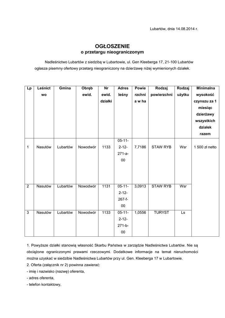 Lubartów, dnia 14.08.2014 r. OGŁOSZENIE o przetargu nieograniczonym Nadleśnictwo Lubartów z siedzibą w Lubartowie, ul. Gen Kleeberga 17, 21-100 Lubartów ogłasza pisemny ofertowy przetarg nieograniczony na dzierżawę niżej wymienionych działek. Lp Leśnict Gmina wo Obręb Nr Adres Powie Rodzaj Rodzaj Minimalna ewid. ewid. leśny rzchni powierzchni użytku wysokość działki a w ha czynszu za 1 miesiąc dzierżawy wszystkich działek razem 05-111 Nasutów Lubartów Nowodwór 1133 2-12- 7,7186 STAW RYB Wsr 3,0913 STAW RYB Wsr 1,0556 TURYST Ls 1 500 zł netto 271-a00 2 Nasutów Lubartów Nowodwór 1131 05-112-12267-f00 3 Nasutów Lubartów Nowodwór 1133 05-112-12271-b00 1. Powyższe działki stanowią własność Skarbu Państwa w zarządzie Nadleśnictwa Lubartów. Nie są obciążone ograniczonymi prawami rzeczowymi. Dodatkowe informacje na temat nieruchomości można uzyskać w siedzibie Nadleśnictwa Lubartów przy ul. Gen. Kleeberga 17 w Lubartowie. 2. Oferta (załącznik nr 2) powinna zawierać: - imię i nazwisko (nazwę) oferenta, - adres oferenta, - telefon kontaktowy, - oferowaną wysokość czynszu netto za jeden miesiąc dzierżawy, - podpis oferenta, Oferty nie spełniające powyższych warunków zostaną odrzucone ze względów formalnych. 3. Kryteria oceny ofert: a) cena ofertowa brutto - waga 60% W kryterium cena zostanie zastosowany następujący wzór: P= [(Cb * 100) / Cn] * Wk Gdzie : P – otrzymane punkty Cn – cena najwyższa z otrzymanych ofert Cb – cena badanej oferty Wk – waga kryterium b) potencjał kadrowy z wykształceniem ichtiologicznym lub rybackim - waga 20% - Jeżeli oferent posiada takie wykształcenie lub dysponuje osobą posiadającą takie wykształcenie otrzymuje 20 pkt Przez dysponowanie osobą rozumie się zatrudnienie na podstawie umowy o pracę lub na podstawie umowy cywilnoprawnej. W celu oceny spełniania przez oferenta powyższego kryterium do oferty należy dołączyć ksero dyplomu w zakresie ichtiologii lub rybactwa, potwierdzone za zgodność z oryginałem przez oferenta lub osoby pozostającej w dyspozycji oferenta. Nadleśnictwo Lubartów może na każdym etapie trwania umowy kontrolować czy dzierżawca dysponuje osobą z wykształceniem ichtiologicznym lub rybackim. c) doświadczenie zawodowe w prowadzeniu gospodarki rybacko-wędkarskiej - waga 20% - poniżej 3 lat – 0 pkt - 3 lata – 10 pkt - za każdy kolejny rok 5 pkt Maksymalnie do oceny przyjmowany będzie 5 letni okres prowadzenia gospodarki rybackowędkarskiej. Ewentualna wyższa liczba lat nie będzie miała wpływu na ocenę punktową. 4. Oferenta, który podał nieprawdziwe informacje w zakresie określonym w pkt 3 wyklucza się z postępowania. 5. Oferowana wysokość czynszu nie może być niższa od wywoławczej wysokości czynszu czyli 1500 zł netto za miesiąc dzierżawy. 6. Celem dzierżawy jest komercyjne udostepnienie łowiska dla wędkarzy oraz prowadzenie gospodarki rybackiej. 7. Okres dzierżawy od dnia 01.12.2014 roku do dnia 30.11.2019 roku z możliwością przedłużenia na kolejne 5 lat.. 8. Oferent może złożyć tylko jedną ofertę. Złożenie większej liczby ofert przez jednego oferenta spowoduje wykluczenie go z postępowania. 9. Warunki dzierżawy przedmiotowego obiektu zostały zawarte w „Umowie dzierżawy” stanowiącej załącznik nr 1. Należność z tytułu podatku od nieruchomości (grunt, budynki i budowle) dzierżawca będzie płacił bezpośrednio do Urzędu Gminy Lubartów. 10. Ofertę należy składać wyłącznie na formularzu ofertowym stanowiącym załącznik nr 2 do niniejszego ogłoszenia. Informacje dotyczące wadium: 11. Oferta powinna być zabezpieczona wadium w wysokości 1000 zł. 12. Wadium powinno być wniesione przed upływem terminu składani ofert. 13. Wadium może być wniesione w następujących formach: - pieniądzu; - poręczeniach bankowych lub poręczeniach spółdzielczej kasy oszczędnościowo – kredytowej, z tym że poręczenie kasy jest zawsze poręczeniem pieniężnym, - gwarancjach bankowych; - gwarancjach ubezpieczeniowych; - poręczeniach udzielanych przez podmioty, o których mowa w art. 6b ust. 5 pkt 2 ustawy z dnia 9 listopada 2000 r. o utworzeniu Polskiej Agencji Rozwoju Przedsiębiorczości (Dz. U. z 2007 r nr 42, poz. 275, z 2008 r. nr 116 poz.730 i 732, nr 227 poz. 1505 oraz z 2010 nr 96 poz.620 ). 14. Wadium wnoszone w pieniądzu należy wpłacić przelewem na rachunek bankowy Nadleśnictwa Lubartów w PKO BP Oddział Lubartów nr: 69 1020 3206 0000 8202 0031 6901 z dopiskiem na blankiecie przelewu – Wadium na dzierżawę stawów Wzory 15. Za termin wniesienia wadium w formie pieniężnej przyjmuje się termin uznania na rachunku bankowym Nadleśnictwa. 16. Wadium wniesione w pozostałych formach, należy w oryginale załączyć do oferty. Z treści gwarancji (poręczenia) musi jednoznacznie wynikać, jaki jest sposób reprezentacji gwaranta. Gwarancja musi być podpisana przez upoważnionego (upełnomocnionego) przedstawiciela gwaranta. Podpis winien być sporządzony w sposób czytelny umożliwiający jego identyfikację (np. złożony wraz z imienną pieczątką lub czytelny z podaniem imienia i nazwiska). Z treści gwarancji winno wynikać bezwarunkowe, na każde pisemne żądanie zgłoszone przez Nadleśnictwo Lubartów w terminie związania ofertą, zobowiązanie gwaranta do wypłaty Nadleśnictwu Lubartów pełnej kwoty wadium. 17. Oferta niezabezpieczona akceptowaną formą wadium zostanie odrzucona. 18. Nadleśnictwo zwróci wadium wszystkim oferentom niezwłocznie po wyborze najkorzystniejszej oferty lub unieważnieniu postępowania z wyjątkiem oferenta, którego oferta została wybrana jako najkorzystniejsza. Oferentowi, którego oferta została wybrana jako najkorzystniejsza, zamawiający zwraca wadium niezwłocznie po zawarciu umowy dzierżawy. 19. Nadleśnictwo zatrzyma wadium wraz z odsetkami, jeżeli oferent, którego oferta została wybrana: 1) odmówi podpisania u