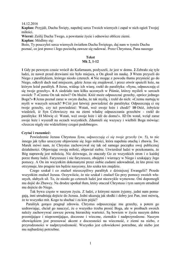14.12.2016 Kapłan: Przyjdź, Duchu Święty, napełnij serca Twoich wiernych i zapal w nich ogień Twojej miłości. Wierni: Ześlij Ducha Twego, a powstanie życie i odnowisz oblicze ziemi. Kapłan: Módlmy się: Boże, Ty pouczyłeś serca wiernych światłem Ducha Świętego, daj nam w tymże Duchu poznać, co jest prawe i Jego pociechą zawsze się radować. Przez Chrystusa, Pana naszego Tekst Mk 2, 1-12 1 Gdy po pewnym czasie wrócił do Kafarnaum, posłyszeli, że jest w domu. 2 Zebrało się tyle ludzi, że nawet przed drzwiami nie było miejsca, a On głosił im naukę. 3 Wtem przyszli do Niego z paralitykiem, którego niosło czterech. 4 Nie mogąc z powodu tłumu przynieść go do Niego, odkryli dach nad miejscem, gdzie Jezus się znajdował, i przez otwór spuścili łoże, na którym leżał paralityk. 5 Jezus, widząc ich wiarę, rzekł do paralityka: «Synu, odpuszczają ci się twoje grzechy». 6 A siedziało tam kilku uczonych w Piśmie, którzy myśleli w sercach swoich: 7 «Czemu On tak mówi? On bluźni. Któż może odpuszczać grzechy, oprócz jednego Boga?» 8 Jezus poznał zaraz w swym duchu, że tak myślą, i rzekł do nich: «Czemu nurtują te myśli w waszych sercach? 9 Cóż jest łatwiej: powiedzieć do paralityka: Odpuszczają ci się twoje grzechy, czy też powiedzieć: Wstań, weź swoje łoże i chodź? 10 Otóż, żebyście wiedzieli, iż Syn Człowieczy ma na ziemi władzę odpuszczania grzechów - rzekł do paralityka: 11 Mówię ci: Wstań, weź swoje łoże i idź do domu!». 12 On wstał, wziął zaraz swoje łoże i wyszedł na oczach wszystkich. Zdumieli się wszyscy i wielbili Boga mówiąc: «Jeszcze nigdy nie widzieliśmy czegoś podobnego». Czytać i rozumieć: Powiedzenie Jezusa Chrystusa Synu, odpuszczają ci się twoje grzechy (w. 5), to nic innego jak tylko uroczyste objawienie się Jego miłości, która napełnia otuchą i zbawia. Św. Marek mówi nam, że Chrystus zachowywał się tak od samego początku swej publicznej działalności. Objawiając swoją miłość, objawiał siebie. Utwierdzał ludzi w przekonaniu, że Bóg naprawdę jest miłością. Nic dziwnego, że otaczały Go ze wszystkich stron i o każdej porze tłumy ludzi. Faryzeusze i nie faryzeusze, obojętni i wierzący w Niego i szukający Jego pomocy. A On im wszystkim dokonanymi przez siebie cudami udowadniał, że kto prosi ten otrzymuje, kto pragnie ten będzie nasycony, kto szuka ten znajdzie. Czego szukał i co znalazł nieszczęśliwy paralityk z dzisiejszej Ewangelii? Przede wszystkim znalazł Jezusa. Oczywiście, że nie szukał i znalazł Go przy pomocy swoich własnych, słabych sił. To, że niosło go czterech ludzi jest niezwykle wymowne. Oni dopomogli mu dojść do Zbawcy. Na drodze spotkał tłum, który otaczał Chrystusa i tym samym utrudniał mu dojście do Niego. Tak bywa często w naszym życiu. Z ludzi, z którymi razem żyjemy, jedni nam pomagają, inni utrudniają dojście do Jezusa. Jedni ukazują jak słodki i dobry jest Pan, inni mówią, że to wszystko mit. Kogo tu słuchać i za kim pójść? Paralityk gorąco pragnął zdrowia. Chrystus odpuszczając mu grzechy, a potem go uzdrawiając, chciał go nauczyć, że o wszystko trzeba prosić Boga, ale w prośbach swoich należy zachowywać zawsze pewną hierarchię wartości. Są bowiem w życiu naszym dobra przemijające i nieprzemijające, doczesne i wieczne, ziemskie i nadprzyrodzone. Naszym obowiązkiem jest przesuwać akcent z doczesności na wieczność, z ziemi na niebo, z przyrodzoności w nadprzyrodzoność. Wszystko jest człowiekowi potrzebne, ale niebo jest mu najbardziej potrzebne. 1 W dojściu do Chrystusa należy pokonywać wszystkie przeszkody i być wytrwałym. Przeszkód tych jest wiele. Paralityk miał je w osobach faryzeuszy, w szarym tłumie a nawet i w ścianach domu, które go odgradzały od jego dobroczyńcy. Ale wszystko jakoś pokonał. Wydaje się, że najwięcej w tym pokonywaniu przeszkód dopomógł mu sam Chrystus. Jego dyskusja z faryzeuszami na temat odpuszczania grzechów, przełamała największą barierę i utwierdziła go ostatecznie w przekonaniu, że ma do czynienia z samym Bogiem. W rozważanej Ewangelii paralityk jest niewątpliwie osobą pierwszoplanową, ale w scenerii każdej sztuki ważne są także osoby drugoplanowe. Kogo do nich zaliczyć? Wydaje się, że tych którzy nieśli i przynieśli chorego do Chrystusa. Słuchając słów Ewangelii muszę zapytać siebie szczerze, czy w moim otoczeniu nie dostrzegam przypadkiem kogoś, kogo trzeba by podnieść i zanieść do Chrystusa? Zanieść go na ramionach swojej wiary i swojej miłości? Ułatwić mu spotkanie z Bogiem? Podprowadzić go do konfesjonału? Podsunąć mu dobrą książkę do ręki, otworzyć Ewangelię na przypowieści o miłosiernym samarytaninie, o zgubionej owcy? Jakże to zaszczytna i wspaniała misja chrześcijanina. Za wszelką cenę chcę być dla drugich chrześcijaninem. Chrystus odpuściwszy paralitykowi grzechy, uzdrowił go z ciężkiej i przykrej choroby paraliżu. Uzdrowienie było dla chorego wielkim dobrodziejstwem, ale dla otoczenia jeszcze większym darem: przekonało ich niezbicie, że Syn Człowieczy ma na ziemi władzę odpuszczanie grzechów (w. 10). Czy my słuchając Ewangelii jesteśmy także o tym mocno przekonam? Jak często chodzimy do Niego, aby uzdrowił nasze dusze? Aby nam odpuścił nasze grzechy? Aby nas pojednał z sobą? Być chrześcijaninem, znaczy być zawsze zjednoczonym z Bogiem. Sugestie do kontemplacji: Razem z uczonymi w Piśmie zadajmy pytanie o sens deklaracji odpuszczania grzechów, kiedy należałoby oczekiwać raczej uzdrowienia sparaliżowanego. Wystąpienia przeciwników Jezusa mogą wydawać się przeszkodą dla głoszenia prawdy o Jezusie. Paradoksalnie prowadzą one do lepszego poznania tej prawdy. W tym przypadku należy docenić teologiczną argumentację uczonych w Piśmie i jej oparcie na najważniejszych prawdach wiary Izraela.