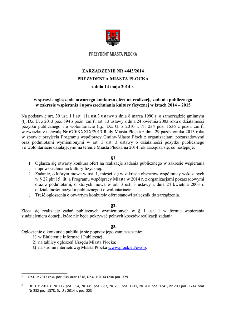 ZARZĄDZENIE NR 4443/2014 PREZYDENTA MIASTA PŁOCKA z