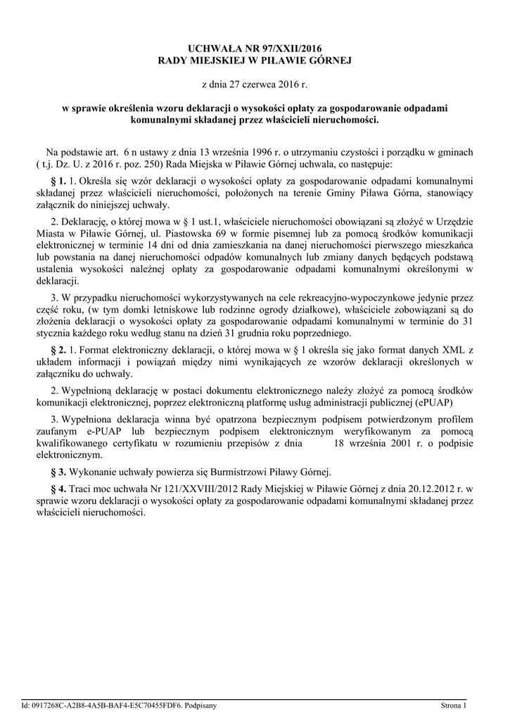 UCHWAŁA NR 97/XXII/2016 RADY MIEJSKIEJ W PIŁAWIE GÓRNEJ z dnia 27 czerwca 2016 r. w sprawie określenia wzoru deklaracji o wysokości opłaty za gospodarowanie odpadami komunalnymi składanej przez właścicieli nieruchomości. Na podstawie art. 6 n ustawy z dnia 13 września 1996 r. o utrzymaniu czystości i porządku w gminach ( t.j. Dz. U. z 2016 r. poz. 250) Rada Miejska w Piławie Górnej uchwala, co następuje: § 1. 1. Określa się wzór deklaracji o wysokości opłaty za gospodarowanie odpadami komunalnymi składanej przez właścicieli nieruchomości, położonych na terenie Gminy Piława Górna, stanowiący załącznik do niniejszej uchwały. 2. Deklarację, o której mowa w § 1 ust.1, właściciele nieruchomości obowiązani są złożyć w Urzędzie Miasta w Piławie Górnej, ul. Piastowska 69 w formie pisemnej lub za pomocą środków komunikacji elektronicznej w terminie 14 dni od dnia zamieszkania na danej nieruchomości pierwszego mieszkańca lub powstania na danej nieruchomości odpadów komunalnych lub zmiany danych będących podstawą ustalenia wysokości należnej opłaty za gospodarowanie odpadami komunalnymi określonymi w deklaracji. 3. W przypadku nieruchomości wykorzystywanych na cele rekreacyjno-wypoczynkowe jedynie przez część roku, (w tym domki letniskowe lub rodzinne ogrody działkowe), właściciele zobowiązani są do złożenia deklaracji o wysokości opłaty za gospodarowanie odpadami komunalnymi w terminie do 31 stycznia każdego roku według stanu na dzień 31 grudnia roku poprzedniego. § 2. 1. Format elektroniczny deklaracji, o której mowa w § 1 określa się jako format danych XML z układem informacji i powiązań między nimi wynikających ze wzorów deklaracji określonych w załączniku do uchwały. 2. Wypełnioną deklarację w postaci dokumentu elektronicznego należy złożyć za pomocą środków komunikacji elektronicznej, poprzez elektroniczną platformę usług administracji publicznej (ePUAP) 3. Wypełniona deklaracja winna być opatrzona bezpiecznym podpisem potwierdzonym profilem zaufanym e-PUAP lub bezpiecznym podpisem elektronicznym weryfikowanym za pomocą kwalifikowanego certyfikatu w rozumieniu przepisów z dnia 18 września 2001 r. o podpisie elektronicznym. § 3. Wykonanie uchwały powierza się Burmistrzowi Piławy Górnej. § 4. Traci moc uchwała Nr 121/XXVIII/2012 Rady Miejskiej w Piławie Górnej z dnia 20.12.2012 r. w sprawie wzoru deklaracji o wysokości opłaty za gospodarowanie odpadami komunalnymi składanej przez właścicieli nieruchomości. Id: 0917268C-A2B8-4A5B-BAF4-E5C70455FDF6. Podpisany Strona 1 § 5. Uchwała wchodzi w życie po upływie 14 dni od dnia jej ogłoszenia w Dzienniku Urzędowym Województwa Dolnośląskiego z mocą obowiązującą od dnia 1 sierpnia 2016 r. z wyjątkiem § 1 ust. 3, który wchodzi w życie z dniem 1 stycznia 2017 r. Przewodniczący Rady Miejskiej Dariusz Madejski Id: 0917268C-A2B8-4A5B-BAF4-E5C70455FDF6. Podpisany Strona 2 DEKLARACJA O WYSOKOŚCI OPŁATY ZA GOSPODAROWANIE ODPADAMI KOMUNLNYMI SKŁADANA PRZEZ WŁAŚCICIELI NIERUCHOMOŚCI POŁOŻONYCH NA OBSZARZE GMINY PIŁAWA GÓRNA Podstawa prawna Ustawa z dnia 13 września 1996r. o utrzymaniu czystości i porządku w gminach. (Dz.U. z 2016 r. poz. 250 ze zm.) Składający Właściciele nieruchomości znajdujących się w granicach administracyjnych Gminy Piława Górna, przez których rozumie się także współwłaścicieli, użytkowników wieczystych oraz jednostki organizacyjne i osoby posiadające nieruchomości w zarządzie lub użytkowaniu, a także inne podmioty władające nieruchomością. Termin składania : W terminie 14 dni od zaistnienia okoliczności mających wpływ na powstanie, bądź wygaśnięcie obowiązku uiszczania opłaty lub zaistnienia zdarzeń mających wpływ na wysokość opłaty Termin płatności: W terminie do 30 dnia każdego miesiąca za dany miesiąc za wyjątkiem miesiąca lutego dla którego termin płatności ustala się na dzień 28, począwszy od 1 maja 2015r. Opłata zryczałtowana w terminie do 31 lipca danego roku począwszy od 2017 r. Organ właściwy do złożenia deklaracji Nazwa i adres siedziby organu właściwego do złożenia deklaracji Burmistrz Piławy Górnej Urząd Miasta w Piławie Górnej ul. Piastowska 69, 58-240 Piława Górna (proszę zaznaczyć właściwy kwadrat) A. OBOWIĄZEK ZŁOŻENIA DEKLARACJI □ pierwsza deklaracja (data powstania obowiązku, zaistnienia zmiany lub wygaśnięcia obowiązku) □ zmiana danych będących podstawą ustalenia __ __ - __ __ -__ __ __ __ wysokości opłaty □ ustania obowiązku uiszczania opłaty □ korekta deklaracji B. PRZYCZYNY ZŁOŻENIA NOWEJ DEKLARACJI (proszę zaznaczyć właściwy kwadrat) □ zmiana ilości osób □ zmiana danych □ zmiana sposobu postępowania z odpadami □ zbycie nieruchomości □ zmiana miejsca zamieszkania: w tej samej gminie/poza gminą (niewłaściwe skreślić) □ inne (jakie?)…………………… C. SKŁADAJĄCY DEKLARACJĘ (proszę zaznaczyć właściwy kwadrat) □ 1. właściciel (w przypadku wspólności majątkowej wypełnia jeden ze współmałżonków) □ 2. współwłaściciel (podać udział w lokalu mieszkalnym) □ 3. użytkownik wieczysty □ 4. posiadacz zależny (najem. dzierżawa) □ 5. jednostka organizacyjna i osoba posiadająca nieruchomość w zarządzie lub użytkowaniu □ 6. inny podmiot władający nieruchomością………………………………………………(określić) D. DANE SKŁADAJĄCEGO DEKLARACJĘ (proszę zaznaczyć właściwy kwadrat) □ osoba fizyczna □ osoba prawna □ jednostka organizacyjna nieposiadająca osobowości prawnej Id: 0917268C-A2B8-4A5B-BAF4-E5C70455FDF6. Podpisany Strona 1 Imię i nazwisko (dot. osób fizycznych) / pełna nazwa (dot. osób prawnych i jednostek organizacyjnych nieposiadających osobowości prawnej) PESEL (dot. osób fizycznych) Imię ojca __ __ __ __ __ __ __ __ __ __ __ Imię matki (dot. osób prawnych)
