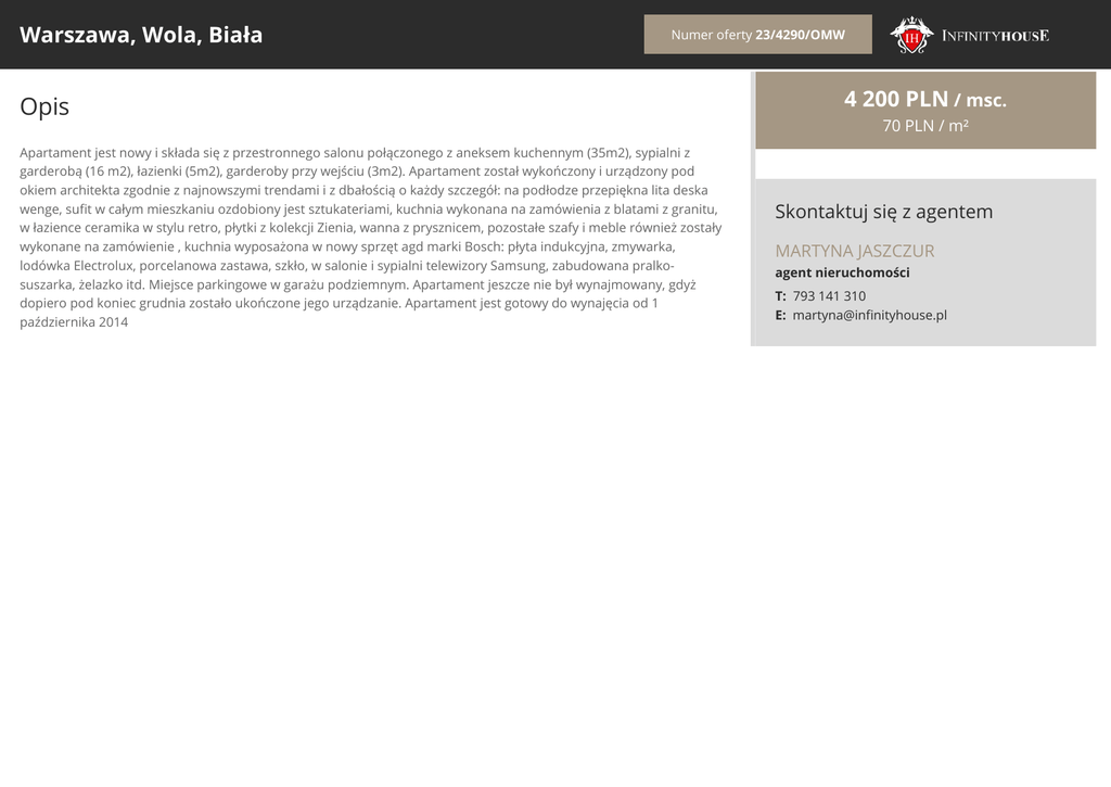 Warszawa, Wola, Biała Numer oferty 23/4290/OMW Opis Apartament jest nowy i składa się z przestronnego salonu połączonego z aneksem kuchennym (35m2), sypialni z garderobą (16 m2), łazienki (5m2), garderoby przy wejściu (3m2). Apartament został wykończony i urządzony pod okiem architekta zgodnie z najnowszymi trendami i z dbałością o każdy szczegół: na podłodze przepiękna lita deska wenge, sufit w całym mieszkaniu ozdobiony jest sztukateriami, kuchnia wykonana na zamówienia z blatami z granitu, w łazience ceramika w stylu retro, płytki z kolekcji Zienia, wanna z prysznicem, pozostałe szafy i meble również zostały wykonane na zamówienie , kuchnia wyposażona w nowy sprzęt agd marki Bosch: płyta indukcyjna, zmywarka, lodówka Electrolux, porcelanowa zastawa, szkło, w salonie i sypialni telewizory Samsung, zabudowana pralkosuszarka, żelazko itd. Miejsce parkingowe w garażu podziemnym. Apartament jeszcze nie był wynajmowany, gdyż dopiero pod koniec grudnia zostało ukończone jego urządzanie. Apartament jest gotowy do wynajęcia od 1 października 2014 4 200 PLN / msc. 70 PLN / m² Skontaktuj się z agentem MARTYNA JASZCZUR agent nieruchomości T: 793 141 310 E: martyna@infinityhouse.pl Warszawa, Wola, Biała Zdjęcia Numer oferty 23/4290/OMW Warszawa, Wola, Biała Numer oferty 23/4290/OMW Warszawa, Wola, Biała Numer oferty 23/4290/OMW Warszawa, Wola, Biała Numer oferty 23/4290/OMW Warszawa, Wola, Biała Numer oferty 23/4290/OMW Warszawa, Wola, Biała Numer oferty 23/4290/OMW Warszawa, Wola, Biała Numer oferty 23/4290/OMW Warszawa, Wola, Biała Numer oferty 23/4290/OMW Warszawa, Wola, Biała Numer oferty 23/4290/OMW Warszawa, Wola, Biała Numer oferty 23/4290/OMW Warszawa, Wola, Biała Mapa Numer oferty 23/4290/OMW