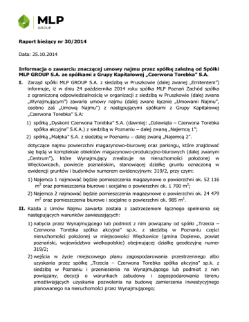 Raport bieżący nr 30/2014 Data: 25.10.2014 Informacja o zawarciu znaczącej umowy najmu przez spółkę zależną od Spółki MLP GROUP S.A. ze spółkami z Grupy Kapitałowej „Czerwona Torebka” S.A. I. Zarząd spółki MLP GROUP S.A. z siedzibą w Pruszkowie (dalej zwanej „Emitentem”) informuje, iż w dniu 24 października 2014 roku spółka MLP Poznań Zachód spółka z ograniczoną odpowiedzialnością w organizacji z siedzibą w Pruszkowie (dalej zwana „Wynajmującym”) zawarła umowy najmu (dalej zwane łącznie „Umowami Najmu”, osobno zaś „Umową Najmu”) z następującymi spółkami z Grupy Kapitałowej „Czerwona Torebka” S.A: 1) spółką „Dyskont Czerwona Torebka” S.A. (dawniej: „Dziewiąta – Czerwona Torebka spółka akcyjna” S.K.A.) z siedzibą w Poznaniu – dalej zwaną „Najemcą 1”; 2) spółką „Małpka” S.A. z siedzibą w Poznaniu – dalej zwaną „Najemcą 2”. dotyczące najmu powierzchni magazynowo-biurowej oraz parkingu, które znajdować się będą w kompleksie obiektów magazynowo-produkcyjno-biurowych (dalej zwanym „Centrum”), które Wynajmujący zrealizuje na nieruchomości położonej w Więckowicach, powiecie poznańskim, stanowiącej działkę gruntu oznaczoną w ewidencji gruntów i budynków numerem ewidencyjnym: 319/2, przy czym: 1) Najemca 1 najmować będzie pomieszczenia magazynowe o powierzchni ok. 52 116 m2 oraz pomieszczenia biurowe i socjalne o powierzchni ok. 1 700 m2; 2) Najemca 2 najmować będzie pomieszczenia magazynowe o powierzchni ok. 24 479 m2 oraz pomieszczenia biurowe i socjalne o powierzchni ok. 985 m2. II. Każda z Umów Najmu zawarta została z zastrzeżeniem łącznego spełnienia się następujących warunków zawieszających: 1) nabycia przez Wynajmującego lub podmiot z nim powiązany od spółki „Trzecia – Czerwona Torebka spółka akcyjna” sp.k. z siedzibą w Poznaniu części nieruchomości położonej w miejscowości Więckowice (gmina Dopiewo, powiat poznański, województwo wielkopolskie) obejmującej działkę geodezyjną numer 319/2; 2) wejścia w życie miejscowego planu zagospodarowania przestrzennego albo uzyskania przez spółkę „Trzecia – Czerwona Torebka spółka akcyjna” sp.k. z siedzibą w Poznaniu i przeniesienia na Wynajmującego lub podmiot z nim powiązany, decyzji o warunkach zabudowy i zagospodarowania terenu umożliwiających uzyskanie pozwolenia na budowę zamierzenia inwestycyjnego planowanego na nieruchomości przez Wynajmującego; III.W treści Umów Najmu określono terminy przekazania Najemcom przedmiotów najmu, które są następujące: 1) 31 grudnia 2016 r. w odniesieniu do Umowy Najmu zawartej z Najemcą 1; 2) 31 grudnia 2015 r. w odniesieniu do Umowy Najmu zawartej z Najemcą 2. Każda z Umów Najmu zawarta została na czas oznaczony piętnastu lat od dnia wydania przedmiotu najmu Najemcom. IV. Emitent szacuje, iż łączna wartość świadczeń wynikających z obu Umów Najmu za cały okres ich obowiązywania wyniesie 50.124.587,40 EUR, co stanowi równowartość kwoty 211.751.319,47 PLN, i odpowiednio dla każdej z Umów Najmu: 1) w przypadku Umowy Najmu zawartej przez Najemcę 1: 33.782.448,60 EUR, co stanowi równowartość kwoty 142.713.954,11 PLN; 2) w przypadku Umowy Najmu zawartej przez Najemcę 2: 16.342.138,80 EUR, co stanowi równowartość kwoty 69.037.365,36 PLN. V. W treści każdej z Umów Najmu zawarto postanowienia dotyczące następujących kar umownych, które spełniają kryteria określone w § 9 pkt 5 rozporządzenia Ministra Finansów w sprawie informacji bieżących i okresowych przekazywanych przez emitentów papierów wartościowych oraz warunków uznawania za równoważne informacji wymaganych przepisami prawa państwa niebędącego państwem członkowskim: 1) kara umowna za opóźnienie w wydaniu Najemcy przedmiotu najmu po dniu wydania określonym w Umowie Najmu w wysokości: (i) 50% (pięćdziesiąt procent) dziennego czynszu netto obliczonego dla przedmiotu najmu, za jedenasty i następne dni opóźnienia, (ii) 100% (sto procent) dziennego czynszu netto obliczonego na podstawie stawek określonych w Umowie Najmu, jeżeli opóźnienie będzie dłuższe niż miesiąc, jednak nie więcej niż wysokość czteromiesięcznego czynszu. Powyższa kara umowna przysługuje Najemcy, gdy najem dojdzie do skutku, tj. przedmiot najmu zostanie wydany Najemcy na podstawie protokołu wydania; 2) kara umowna z tytułu odstąpienia przez Najemcę od Umowy Wynajmującego, w wysokości czteromiesięcznego czynszu netto podstawie stawek określonych w Umowie Najmu. Powyższa przysługuje Najemcy, gdy umowa ulegnie rozwiązaniu i najem skutku; Najmu, z winy obliczonego na kara umowna nie dojdzie do 3) kara umowna w wysokości 2.000.000 zł, na wypadek naruszenia zobowiązania do niezbywania nieruchomości, na której zrealizowane zostanie Centrum na rzecz podmiotów prowadzących działalność konkurencyjną w stosunku do Najemców; 4) kara umowna w wysokości 2.000.000 zł na wypadek (i) naruszenia zobowiązania do niezbywania nieruchomości, na której ma zostać zrealizowane Centrum do dnia wydania lub (ii) w przypadku dokonania takiego zbycia, niedopełnienia obowiązku zobligowania nabywcy do złożenia Najemcy oświadczenia, w którym potwierdzi wszelkie postanowienia Umowy Najmu. Zapłata w/w kar umownych wyłącza uprawnienia do dochodzenia roszczeń odszkodowawczych przekraczających wysokość tych kar. VI. Jednym z zabezpieczeń wywiązania się przez każdego z Najemców ze zobowiązań wynikających z Umów Najmu jest wystawiony przez spółkę „Czerwona Torebka” S.A. – jako spółkę dominującą, dokument poręczenia, w którym Spółka „Czerwona Torebka” S.A. zobowiąże się do wykonania wszelkich zobowiązań do zapłaty czynszu oraz kosztów operacyjnych wynikających z określonej Umowy Najmu przez cały okres najmu i 3 miesięcy po wygaśnięciu lub rozwiązaniu Umowy Najmu. W Umowach Najmu okreś