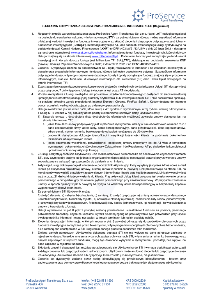 REGULAMIN KORZYSTANIA Z USŁUG SERWISU TRANSAKCYJNO - INFORMACYJNEGO (Regulamin) 1. 2. 3. 4. 5. 6. 7. 8. 9. 10. 11. 12. 13. Regulamin określa warunki świadczenia przez ProService Agent Transferowy Sp. z o.o. (dalej: „AT”) usługi polegającej na dostępie do serwisu transakcyjno – informacyjnego („STI”), za pośrednictwem którego można uzyskiwać informacje o bieżącej wartości inwestycji w fundusze inwestycyjne oraz składać zlecenia i dyspozycje dotyczące uczestnictwa w funduszach inwestycyjnych („Usługa”). Informacje dotyczące AT, jako podmiotu świadczącego usługi dystrybucyjne na podstawie decyzji Komisji Nadzoru Finansowego („KNF”) nr DFI/II/4031/8/21/13/U/KV z dnia 29 lipca 2013 r. dostępne są na stronie internetowej www.psat.com.pl/dystrybutor. Informacje na temat funduszy inwestycyjnych, których dotyczy Usługa znajdują się na stronie internetowej www.millenniumtfi.pl. Podmiotem tworzącym i zarządzającym funduszami inwestycyjnymi, których dotyczy Usługa jest Millennium TFI S.A.(„TFI”), działające na podstawie zezwolenia KNF (dawniej: Komisja Papierów Wartościowych i Giełd) z dnia 20.11.2001 r nr. DFN1-4050/22-24/01. Zlecenia i Dyspozycje złożone za pośrednictwem STI, będą realizowane w terminach i na zasadach określonych w statucie oraz prospekcie informacyjnym funduszu, którego jednostek uczestnictwa dotyczą . Szczegółowe informacje dotyczące funduszy, w tym opis ryzyka inwestycyjnego, koszty i opłaty obciążające fundusz znajdują się w prospekcie informacyjnym, statucie funduszu, kluczowych informacjach dla inwestorów (KII) oraz Tabeli Opłat dostępnych na stronie internetowej TFI. Z zastrzeżeniem czasu niezbędnego na konserwację systemów niezbędnych do świadczenia Usługi, STI dostępny jest przez całą dobę, 7 dni w tygodniu. Usługa świadczona jest przez AT nieodpłatnie. W celu skorzystania z Usługi niezbędne jest posiadanie urządzenia komputerowego z dostępem do sieci internetowej i przeglądarki internetowej obsługującej protokoły szyfrowania TLS w wersji minimum 1.0. Takie oczekiwania spełniają, na przykład, aktualne wersje przeglądarek Internet Explorer, Chrome, FireFox, Safari. i. Koszty dostępu do Internetu ponosi uczestnik według obowiązującej go u danego operatora taryfy. Usługa świadczona jest na rzecz osób, które zawrą z AT zgodnie z wymienionym niżej trybem umowę o korzystanie z Usług STI i wskażą w niej aktualny adres poczty elektronicznej (zwanych dalej; użytkownikami): 1) Zawarcie umowy u dystrybutora (lista dystrybutorów oferujących możliwość zawarcia umowy dostępna jest na stronie internetowej TFI): a. jeżeli formularz umowy podpisywany jest w placówce dystrybutora, należy w nim obowiązkowo wskazać m.in.: dane osobowe/dane firmy, adres stały, adres korespondencyjny, dane przedstawicieli, dane reprezentantów, adres e-mail, numer rachunku bankowego do odkupień należącego do Użytkownika. b. pracownik dystrybutora dokonuje identyfikacji i weryfikacji tożsamości klienta na podstawie dokumentów tożsamości lub rejestrowych klienta. c. jeden egzemplarz wypełnionej, potwierdzonej i podpisanej umowy przesyłany jest do AT wraz z kompletem wymaganych dokumentów, o których mowa w Załączniku nr 1 do Regulaminu. AT po stwierdzeniu kompletności i prawidłowości umowy aktywuje Usługę. Z Usługi korzystają osobiście Użytkownicy - nie można ustanowić pełnomocnika do dokonywania czynności w ramach STI, przy czym osoby prawne lub jednostki organizacyjne nieposiadające osobowości prawnej przy zawieraniu umowy zobowiązane są wskazać reprezentantów do działania w ich imieniu. Aktywacja Usługi dokonywana jest w Internecie poprzez link aktywacyjny, który wysyłany jest przez AT na adres e-mail klienta po otrzymaniu prawidłowej umowy, o której mowa w punkcie 5 powyżej. Link przekierowuje na stronę STI, na której należy wprowadzić prawidłowy zestaw danych (identyfikator i hasło oraz kod jednorazowy). Link aktywacyjny jest ważny przez 21 dni od dnia jego wysłania do klienta. Przy aktywacji Usługi klient proszony jest o ustanowienie pytania pomocniczego w przypadku, gdy nie wskazał pytania pomocniczego przy zawieraniu umowy. W przypadku zawierania umowy w sposób opisany w pkt 5 powyżej AT wysyła na wskazany adres korespondencyjny w bezpiecznej kopercie wygenerowany identyfikator, hasło. Za pośrednictwem STI Użytkownik może: 1) złożyć zlecenie: a) nabycia, b) odkupienia, c) zamiany, 2) złożyć dyspozycję: a) zmiany adresu korespondencyjnego uczestnika/użytkownika, b) blokady rejestru, c) odwołanie blokady rejestru d) zamówienie listy kodów jednorazowych, e) aktywacji listy kodów jednorazowych, f) dezaktywacji listy kodów jednorazowych, g) reklamacji, h) wypowiedzenia umowy o korzystanie z Usługi. Usługi wymienione w pkt 8 ppkt.1 powyżej zostaną potwierdzone uczestnikowi funduszu za pomocą pisemnego potwierdzenia transakcji, chyba że uczestnik wyraził pisemną zgodę na przekazywanie tych potwierdzeń przy użyciu trwałego nośnika informacji innego niż papier, w innych terminach lub na ich osobisty odbiór. Zlecenia, dyspozycje i informacje, o których mowa w pkt. 8 powyżej odnoszą się do produktów oferowanych przez fundusze inwestycyjne zarządzane przez Towarzystwo, w tym programów specjalnych oferowanych na bazie funduszy, o ile zostaną one udostępnione w STI i regulamin danego produktu dopuszcza taką możliwość. Zmiana danych adresowych Użytkownika dokonana poprzez STI nie ma wpływu na dane adresowe zapisane w rejestrze funduszu. Wszelkie inne zmiany danych zapisanych w ramach STI, w tym zmiana rachunku bankowego oraz danych zapisanych w rejestrze funduszu, mogą być dokonane wyłącznie u dystrybutora i pozostają bez wpływu na dane zapisane w rejestrze funduszu. Składanie zleceń i dyspozycji jest możliwe po zalogowaniu się Użytkownika do STI i wymaga dodatkowej autoryzacji ka