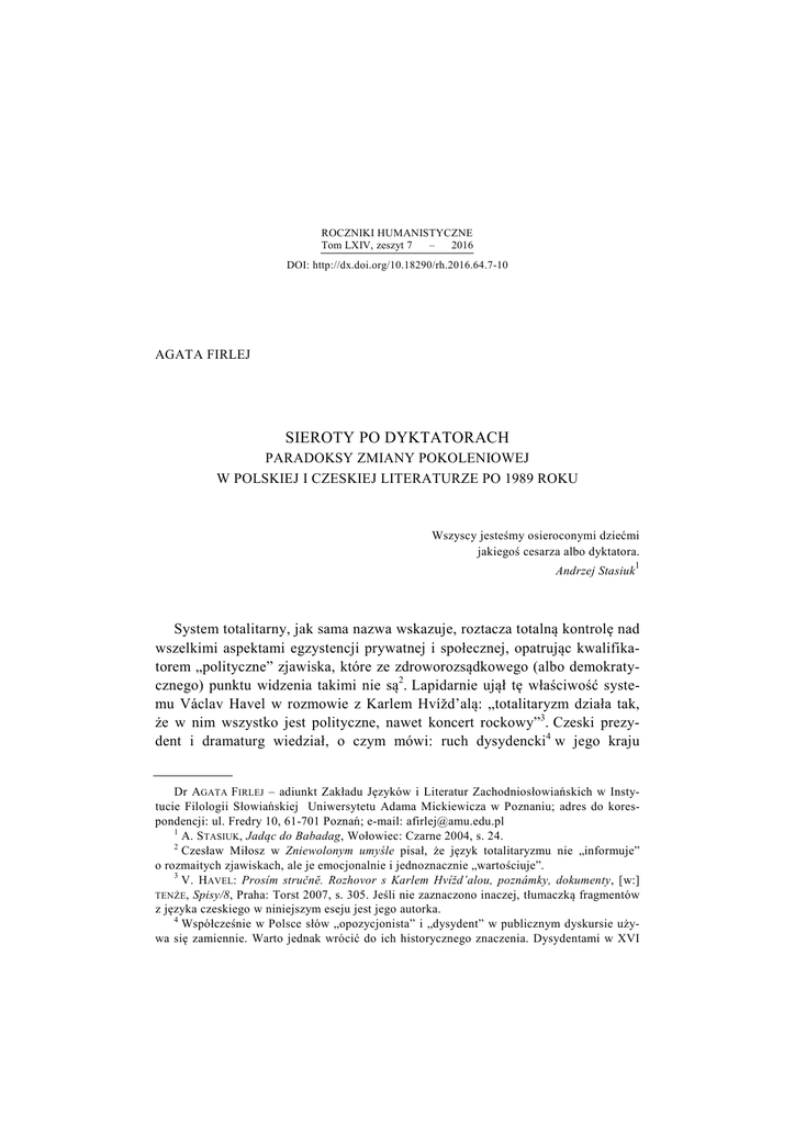 ROCZNIKI HUMANISTYCZNE Tom LXIV, zeszyt 7 – 2016 DOI: http://dx.doi.org/10.18290/rh.2016.64.7-10 AGATA FIRLEJ * SIEROTY PO DYKTATORACH PARADOKSY ZMIANY POKOLENIOWEJ W POLSKIEJ I CZESKIEJ LITERATURZE PO 1989 ROKU Wszyscy jesteśmy osieroconymi dziećmi jakiegoś cesarza albo dyktatora. Andrzej Stasiuk 1 System totalitarny, jak sama nazwa wskazuje, roztacza totalną kontrolę nad wszelkimi aspektami egzystencji prywatnej i społecznej, opatrując kwalifikatorem „polityczne” zjawiska, które ze zdroworozsądkowego (albo demokratycznego) punktu widzenia takimi nie są2. Lapidarnie ujął tę właściwość systemu Václav Havel w rozmowie z Karlem Hvížd’alą: „totalitaryzm działa tak, że w nim wszystko jest polityczne, nawet koncert rockowy”3. Czeski prezydent i dramaturg wiedział, o czym mówi: ruch dysydencki4 w jego kraju Dr AGATA F IRLEJ – adiunkt Zakładu Języków i Literatur Zachodniosłowiańskich w Instytucie Filologii Słowiańskiej Uniwersytetu Adama Mickiewicza w Poznaniu; adres do korespondencji: ul. Fredry 10, 61-701 Poznań; e-mail: [email protected] 1 A. S TASIUK, Jadąc do Babadag, Wołowiec: Czarne 2004, s. 24. 2 Czesław Miłosz w Zniewolonym umyśle pisał, że język totalitaryzmu nie „informuje” o rozmaitych zjawiskach, ale je emocjonalnie i jednoznacznie „wartościuje”. 3 V. HAVEL: Prosím stručnĕ. Rozhovor s Karlem Hvížd’alou, poznámky, dokumenty, [w:] TENŻE, Spisy/8, Praha: Torst 2007, s. 305. Jeśli nie zaznaczono inaczej, tłumaczką fragmentów z języka czeskiego w niniejszym eseju jest jego autorka. 4 Współcześnie w Polsce słów „opozycjonista” i „dysydent” w publicznym dyskursie używa się zamiennie. Warto jednak wrócić do ich historycznego znaczenia. Dysydentami w XVI 150 AGATA FIRLEJ skonsolidował się w połowie lat 70. XX wieku m.in. wokół idei ratowania rockmanów z grupy The Plastic People of the Universe, których trzymano w więzieniu za noszenie długich włosów, anglojęzyczną nazwę i chuligańską muzykę. Teksty Plastyków, dodajmy, na ogół nie miały nic wspólnego z polityką (a w każdym razie nie wprost). Urządzenie ich koncertu we własnym domku letniskowym – czego „dopuścił się” Havel – było aktem politycznej demonstracji, pomimo zachowania wszelkich konspiracyjnych zasad (łącznie z zasłanianiem okien materacami). Hradeček ocalał, choć nie było to tak oczywiste: budynki, w których koncertowali nielegalnie Plastycy i DG 307, bywały palone (Česká Lípa), rozjeżdżane buldożerami lub wysadzane w powietrze (Rychnov)5. Obrona muzyków jako element konsolidujący czeską opozycję: to może brzmieć w polskich uszach dość egzotycznie. Czeskim odpowiednikiem polskiego KOR-u (Komitet Obrony Robotników) byłby zatem Komitet Obrony Rockmanów? Ten punkt oddaje pewną różnicę między statusem czechosłowackich i polskich artystów, literatów, muzyków, filmowców. W Polsce system totalitarny, pomimo funkcjonowania cenzury i jej, niejednokrotnie, spektakularnych interwencji, które do dziś pozostają tematem anegdot, był mniej totalny („miękki totalitaryzm”, jak to określają niektórzy badacze). Działalność artystyczna, zwłaszcza jeśli była „niezrozumiała” (czytaj: eksperymentalna, awangardowa) – albo rozrywkowa – mogła toczyć się w warunkach względnej swobody. Wiele zależało oczywiście również od okresu: Czesi mieli swoje zlatá šedesátá (złote lata 60.), kiedy to artyści mogli korzystać ze względnej swobody, ale już tzw. normalizacja lat 70. ubiegłego wieku oznaczała coś dokładnie odi XVII wieku nazywano protestantów w katolickiej Rzeczypospolitej. Dysydent, wywodząc się z jakiejś doktryny, sprzeciwia się niektórym jej dogmatom, opozycjonista zaś nigdy nie miał nic wspólnego z ideologią, przeciwko której występuje. Dysydentami na polskim gruncie byliby zatem Jacek Kuroń czy Leszek Kołakowski, którzy porzucili PZPR i przeszli do obozu jej przeciwników. Opozycjonistami czeskimi byli Václav Havel czy filozof Jan Patočka, którzy nigdy nie dali się uwieść komunizmowi. Czesi, którzy nie sąsiadowali z Rosją i nie doświadczyli rosyjskiego zaboru, byli bardziej skłonni najpierw do akceptowania idei słowianofilskich (pod auspicjami Moskwy), a następnie komunizmu. Być może słynna czeska „wyrozumiałość” wobec ludzkich słabości, która zachwyca polskich „czechofilów” (Mariusz Szczygieł), wiąże się między innymi z faktem, że czescy twórcy niezależni bywali najczęściej dysydentami: przeżyli wczesną fascynację komunizmem (Pavel Kohout, Jan Skácel, Milan Kundera). Czesi nie mają co prawda swojego odpowiednika „Arcanów”, czasopisma, w którym lustruje się życiorysy pisarzy, wyszukując kompromitujące związki z reżimem, ale spektakularne polowania na czarownice nie są im obce. Ofiarą tychże padli na przykład Ota Filip, Bohumil Hrabal, Egon Bondy i Milan Kundera. 5 Zob. M. SZCZYGIEŁ, Krótka historia czeskiego plastiku, „Gazeta Wyborcza” nr 110 z 12 V 2006 r., s. 21. SIEROTY PO DYKTATORACH 151 wrotnego, niżby wskazywała nazwa: napisanie metafizycznego wiersza, nakręcenie surrealistycznego filmu czy śpiewanie (albo skandowanie, wykrzykiwanie, jak to robili Plastycy) smutnej piosenki oznaczało demonstrację polityczną i spotykało się z agresywną reakcją władzy. Niemniej jednak totalitaryzm, twardy czy miękki, pozostaje systemem zachłannym, niechętnie zachowującym margines apolityczności. Cezury historycznoliterackie po II wojnie światowej (w Polsce: lata 1945, 1956, 1968, 1989; w Czechach: 1948, 1956, 1968, 1989) najczęściej były podyktowane przemianami w polityce. Zarówno codzienne wybory przeciętnego obywatela, jak i gest artysty w ustroju komunistycznym, mogły nabrać posmaku polityczności. Twórca – mniejsza: utalentowany czy słaby – jeśli tylko decydował się pisać, malować czy rzeźbić w sposób niezależny, automatycznie w