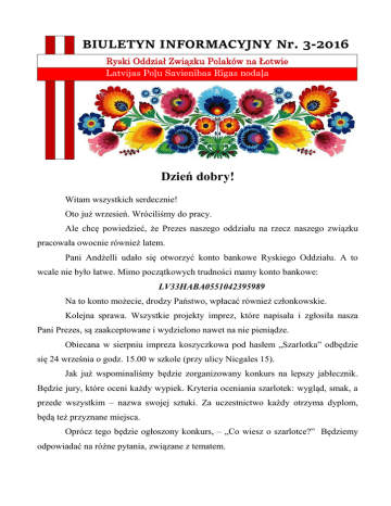BIULETYN INFORMACYJNY Nr. 3-2016 Ryski Oddział Związku Polaków na Łotwie Latvijas Poļu Savienības Rīgas nodaļa Dzień dobry! Witam wszystkich serdecznie! Oto już wrzesień. Wróciliśmy do pracy. Ale chcę powiedzieć, że Prezes naszego oddziału na rzecz naszego związku pracowała owocnie również latem. Pani Andżelli udało się otworzyć konto bankowe Ryskiego Oddziału. A to wcale nie było łatwe. Mimo początkowych trudności mamy konto bankowe: LV33HABA0551042395989 Na to konto możecie, drodzy Państwo, wpłacać również członkowskie. Kolejna sprawa. Wszystkie projekty imprez, które napisała i zgłosiła nasza Pani Prezes, są zaakceptowane i wydzielono nawet na nie pieniądze. Obiecana w sierpniu impreza koszyczkowa pod hasłem „Szarlotka” odbędzie się 24 września o godz. 15.00 w szkole (przy ulicy Nicgales 15). Jak już wspominaliśmy będzie zorganizowany konkurs na lepszy jabłecznik. Będzie jury, które oceni każdy wypiek. Kryteria oceniania szarlotek: wygląd, smak, a przede wszystkim – nazwa swojej sztuki. Za uczestnictwo każdy otrzyma dyplom, będą też przyznane miejsca. Oprócz tego będzie ogłoszony konkurs, – „Co wiesz o szarlotce?” Będziemy odpowiadać na różne pytania, związane z tematem. Proszę się przygotować! Następna impreza – spotkanie – gra w kręgle. Spotkanie odbędzie się 18 października o godz.19. w klubie „MĒNESS” ul.Vaidavas (niedaleko szkoły). Muszą być zorganizowane 6-osobowe drużyny. Każda drużyna będzie miała swój tor. Musimy wiedzieć, ile takich torów zarezerwować. Chętni zgłaszają się do Pani Andżelli do 11 października. Każda drużyna musi mieć swoją nazwę. Każdy uczestnik będzie musiał kupić na miejscu zmienne obuwie. Liczymy na Państwa aktywność! Co nas czeka w bliższej przyszłości? - impreza, związana ze Świętem Niepodległości Polski; - spotkanie integracyjne „Śpiewamy razem” – karaoke; - obchody Świąt Bożego Narodzenia. Ale o tym w następnym numerze! Jeszcze jedna sprawa. Nasza Pani księgowa – Jolanta Jelińska przeprowadza ewidencję członków naszego oddziału. Prosimy o zgłoszenie się do Pani Jolanty z potwierdzeniem swego uczestnictwa w związku. Na razie wszystko! Z wyrazami szacunku, Irena Strautmale Prezes – Andżella Liepa (29299432); Wiceprezes –Irena Strautmale (29575771); Księgowa – Jolanta Jelińska (26838056) Strona internetowa Ryskiego Oddziału ZPŁ – www.ryga.zpl.lv