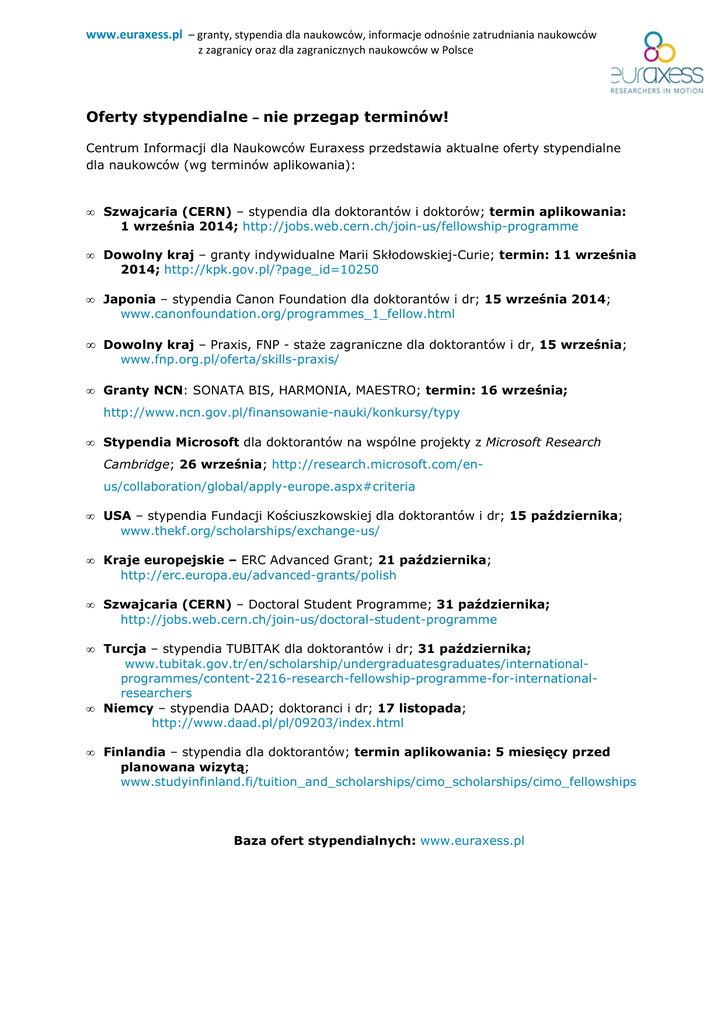 www.euraxess.pl – granty, stypendia dla naukowców, informacje odnośnie zatrudniania naukowców z zagranicy oraz dla zagranicznych naukowców w Polsce Oferty stypendialne – nie przegap terminów! Centrum Informacji dla Naukowców Euraxess przedstawia aktualne oferty stypendialne dla naukowców (wg terminów aplikowania): • Szwajcaria (CERN) – stypendia dla doktorantów i doktorów; termin aplikowania: 1 września 2014; http://jobs.web.cern.ch/join-us/fellowship-programme • Dowolny kraj – granty indywidualne Marii Skłodowskiej-Curie; termin: 11 września 2014; http://kpk.gov.pl/?page_id=10250 • Japonia – stypendia Canon Foundation dla doktorantów i dr; 15 września 2014; www.canonfoundation.org/programmes_1_fellow.html • Dowolny kraj – Praxis, FNP - staże zagraniczne dla doktorantów i dr, 15 września; www.fnp.org.pl/oferta/skills-praxis/ • Granty NCN: SONATA BIS, HARMONIA, MAESTRO; termin: 16 września; http://www.ncn.gov.pl/finansowanie-nauki/konkursy/typy • Stypendia Microsoft dla doktorantów na wspólne projekty z Microsoft Research Cambridge; 26 września; http://research.microsoft.com/enus/collaboration/global/apply-europe.aspx#criteria • USA – stypendia Fundacji Kościuszkowskiej dla doktorantów i dr; 15 października; www.thekf.org/scholarships/exchange-us/ • Kraje europejskie – ERC Advanced Grant; 21 października; http://erc.europa.eu/advanced-grants/polish • Szwajcaria (CERN) – Doctoral Student Programme; 31 października; http://jobs.web.cern.ch/join-us/doctoral-student-programme • Turcja – stypendia TUBITAK dla doktorantów i dr; 31 października; www.tubitak.gov.tr/en/scholarship/undergraduatesgraduates/internationalprogrammes/content-2216-research-fellowship-programme-for-internationalresearchers • Niemcy – stypendia DAAD; doktoranci i dr; 17 listopada; http://www.daad.pl/pl/09203/index.html • Finlandia – stypendia dla doktorantów; termin aplikowania: 5 miesięcy przed planowana wizytą; www.studyinfinland.fi/tuition_and_scholarships/cimo_scholarships/cimo_fellowships Baza ofert stypendialnych: www.euraxess.pl