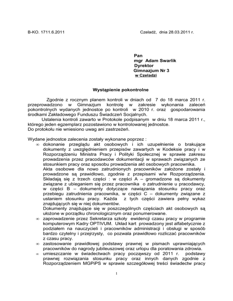 B-KO. 1711.6.2011 Czeladź, dnia 28.03.2011 r. Pan mgr Adam Swarlik Dyrektor Gimnazjum Nr 3 w Czeladzi Wystąpienie pokontrolne Zgodnie z rocznym planem kontroli w dniach od 7 do 18 marca 2011 r. przeprowadzono w Gimnazjum kontrolę w zakresie wykonania zaleceń pokontrolnych wydanych jednostce po kontroli w 2010 r. oraz gospodarowania środkami Zakładowego Funduszu Świadczeń Socjalnych. Ustalenia kontroli zawarto w Protokole podpisanym w dniu 18 marca 2011 r., którego jeden egzemplarz pozostawiono w kontrolowanej jednostce. Do protokołu nie wniesiono uwag ani zastrzeżeń. Wydane jednostce zalecenia zostały wykonane poprzez : • dokonanie przeglądu akt osobowych i ich uzupełnienie o brakujące dokumenty z uwzględnieniem przepisów zawartych w Kodeksie pracy i w Rozporządzeniu Ministra Pracy i Polityki Społecznej w sprawie zakresu prowadzenia przez pracodawców dokumentacji w sprawach związanych ze stosunkiem pracy oraz sposobu prowadzenia akt osobowych pracownika. Akta osobowe dla nowo zatrudnionych pracowników założone zostały i prowadzone są prawidłowo, zgodnie z przepisami w/w Rozporządzenia. Składają się z trzech części : w części A – gromadzone są dokumenty związane z ubieganiem się przez pracownika o zatrudnienie u pracodawcy, w części B – dokumenty dotyczące nawiązania stosunku pracy oraz przebiegu zatrudnienia pracownika, w części C – dokumenty związane z ustaniem stosunku pracy. Każda z tych części zawiera pełny wykaz znajdujących się w niej dokumentów. Dokumenty znajdujące się w poszczególnych częściach akt osobowych są ułożone w porządku chronologicznym oraz ponumerowane. • zaprowadzenie przez Sekretarza szkoły ewidencji czasu pracy w programie komputerowym Kadry OPTIVUM. Układ kart prowadzony jest alfabetycznie z podziałem na nauczycieli i pracowników administracji i obsługi w sposób bardzo czytelny i przejrzysty, co pozwala prawidłowo rozliczać pracowników z czasu pracy. • zastosowanie prawidłowej podstawy prawnej w pismach uprawniających pracowników do nagrody jubileuszowej oraz urlopu dla poratowania zdrowia. • umieszczanie w świadectwach pracy począwszy od 2011 r. podstawy prawnej rozwiązania stosunku pracy oraz innych danych zgodnie z Rozporządzeniem MGPiPS w sprawie szczegółowej treści świadectw pracy 1 oraz sposobu, trybu jego wydawania i prostowania a także zgodnie z art.97 § 2 Kodeksu Pracy. • wprowadzenie do 7 umów na najem pomieszczeń aneksów dotyczących terminów płatności zgodnie z Uchwałą Rady Miejskiej. W odniesieniu do pozostałych umów (14 o charakterze ciągłym i 3 w przypadku korzystania okazjonalnego) określono termin płatności zgodny z obowiązującymi przepisami. W umowach najmu zawartych z firmą Gruburg Vending Sp. z o.o. z Zabrza na okres od 01.01. do 30.06.2010 r. i od 01.09. do 31.12.2010 r. na najem części nieruchomości o pow. 1 m2 zastosowano stawkę 100,00 zł za każdy miesiąc. To samo dotyczy umów zawartych na okres od 03.01. do 22.06.2011 r. Zastosowana w umowach stawka nie została określona w Zarządzeniu Burmistrza Miasta Nr 181/2009 z dnia 31.08.2009 r. w sprawie wprowadzenia cennika opłat za korzystanie pomieszczeń szkół i przedszkoli prowadzonych przez gminę Czeladź. W roku 2010 jednostka nie wystąpiła z wnioskiem do Burmistrza o zatwierdzenie stosowanych stawek. Dopiero w marcu 2011 r. zwrócono się o wprowadzenie do obowiązującego cennika opłat w G3 dodatkowo wynajmu powierzchni 1 m2 pod urządzenia vendingowe ze stawką 100,00 zł/miesiąc. Sprawozdanie roczne z realizacji dochodów RB – 27S wykazało na koniec 2010 r. zaległości z tytułu dochodów na ogólną kwotę 2.252,50 zł, w tym : z tytułu najmu 1.050,00 zł i za żywienie w stołówce szkolnej 1.202,50 zł. Zaległości z tytułu najmu wystąpiły w 2010 r. u najemcy pn. Centrum Szkolenia Kierowców w Sosnowcu. Zaległości w opłatach za żywienie dotyczą czworga dzieci i obejmują w 2008 r. kwotę 50,40 zł, 2009 r. kwotę 173,60 zł i 2010 r. kwotę 215,60 zł. W styczniu 2011 r. uregulowano jedynie kwotę w wysokości 103,20 zł z tytułu żywienia. Pozostała kwota należności nie została wyegzekwowana. Za realizację dochodów w jednostce odpowiada Dyrektor, natomiast bezpośredni nadzór sprawuje Główna księgowa. Windykacja należności została szczegółowo opisana na str. 13 do 15 Protokołu. Podejmowane czynności celem wyegzekwowania zapłaty należności u najemcy (przedsądowe egzekucyjne wezwanie do zapłaty w grudniu 2010 r.) było nieskuteczne. W kolejnych miesiącach styczeń i luty 2011 r. nie wdrożono dalszej procedury windykacyjnej w celu realizacji roszczeń. Do dłużników zalegających w opłatach za żywienie dzieci nie wysyłano zawiadomień o zaleganiu z płatnościami, przeprowadzano jedynie rozmowy telefoniczne bądź ustne z rodzicami uczniów. Działalność socjalna prowadzona była w oparciu o Regulamin ZFŚS, który wszedł w życie 1 grudnia 2004 r. i wymaga dostosowania do obecnie obowiązujących regulacji prawnych. Środki zgromadzone na rachunku funduszu wydatkowane były na obligatoryjne świadczenia urlopowe dla nauczycieli, pożyczki mieszkaniowe, zapomogi, dopłaty do indywidualnego wypoczynku pracowników, dofinansowanie do wypoczynku dzieci, świadczenia świąteczne. 2 Przekazanie środków należnych na cele socjalne na rachunek bankowy funduszu odbywało się z zachowaniem wymaganych terminów ustawowych tj. pierwsza transza do 31 maja, druga do 30 września. Przyznawanie świadczeń w oparciu o przyjęte progi dochodowe odbywało się na podstawie pisemnych wniosków osób uprawnionych w uzgodnieniu z przedstawicielem związku zawodowego działającego w Szkole. Dotychczasowy Regulamin przewiduje udzielanie pożyczek mieszkaniowych w kwocie 3.000 zł, natomiast komisja socjalna i pracodawca akceptował udzielanie pożyczek po 4.000 zł. Na koniec 2010 r. stwierdzono zaległości u dwóch osób w