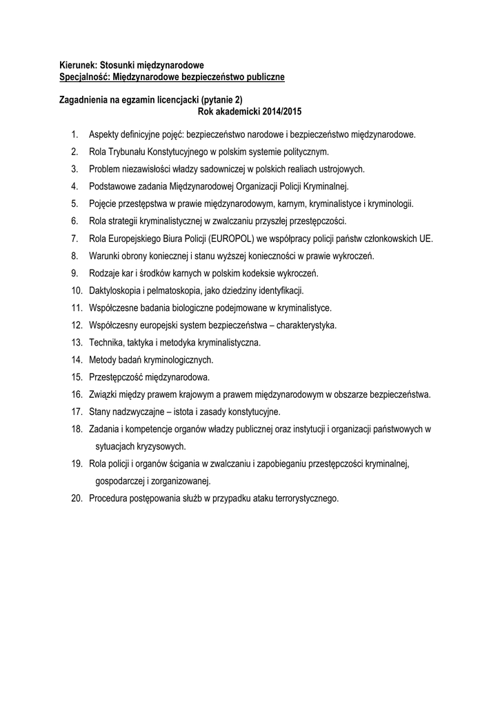 Kierunek: Stosunki międzynarodowe Specjalność: Międzynarodowe bezpieczeństwo publiczne Zagadnienia na egzamin licencjacki (pytanie 2) Rok akademicki 2014/2015 1. Aspekty definicyjne pojęć: bezpieczeństwo narodowe i bezpieczeństwo międzynarodowe. 2. Rola Trybunału Konstytucyjnego w polskim systemie politycznym. 3. Problem niezawisłości władzy sadowniczej w polskich realiach ustrojowych. 4. Podstawowe zadania Międzynarodowej Organizacji Policji Kryminalnej. 5. Pojęcie przestępstwa w prawie międzynarodowym, karnym, kryminalistyce i kryminologii. 6. Rola strategii kryminalistycznej w zwalczaniu przyszłej przestępczości. 7. Rola Europejskiego Biura Policji (EUROPOL) we współpracy policji państw członkowskich UE. 8. Warunki obrony koniecznej i stanu wyższej konieczności w prawie wykroczeń. 9. Rodzaje kar i środków karnych w polskim kodeksie wykroczeń. 10. Daktyloskopia i pelmatoskopia, jako dziedziny identyfikacji. 11. Współczesne badania biologiczne podejmowane w kryminalistyce. 12. Współczesny europejski system bezpieczeństwa – charakterystyka. 13. Technika, taktyka i metodyka kryminalistyczna. 14. Metody badań kryminologicznych. 15. Przestępczość międzynarodowa. 16. Związki między prawem krajowym a prawem międzynarodowym w obszarze bezpieczeństwa. 17. Stany nadzwyczajne – istota i zasady konstytucyjne. 18. Zadania i kompetencje organów władzy publicznej oraz instytucji i organizacji państwowych w sytuacjach kryzysowych. 19. Rola policji i organów ścigania w zwalczaniu i zapobieganiu przestępczości kryminalnej, gospodarczej i zorganizowanej. 20. Procedura postępowania służb w przypadku ataku terrorystycznego.