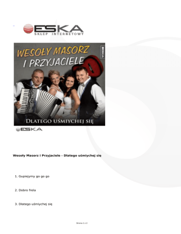 Wesoły Masorz i Przyjaciele - Dlatego uśmiychej się 1. Gupiejymy go go go 2. Dobro frela 3. Dlatego uśmiychej się Strona 1 z 2 4. Całuj zawsze mnie 5. Trudny list 6. Wiecznie zakochany 7. Mały bukiecik 8. Zabawa wele familoka 9. Tęsknota 10. Wszystkim pięknie dziękujemy 11. Taki jest oktoberfest 12. Szczęśliwy synek 13. Viagra 14. Pożegnanie Strona 2 z 2