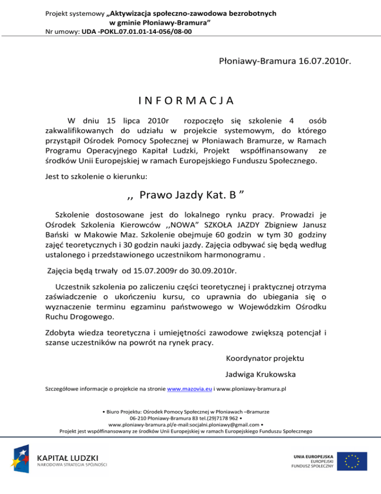 Projekt systemowy „Aktywizacja społeczno-zawodowa bezrobotnych w gminie Płoniawy-Bramura” Nr umowy: UDA -POKL.07.01.01-14-056/08-00 Płoniawy-Bramura 16.07.2010r. INFORMACJA W dniu 15 lipca 2010r rozpoczęło się szkolenie 4 osób zakwalifikowanych do udziału w projekcie systemowym, do którego przystąpił Ośrodek Pomocy Społecznej w Płoniawach Bramurze, w Ramach Programu Operacyjnego Kapitał Ludzki, Projekt współfinansowany ze środków Unii Europejskiej w ramach Europejskiego Funduszu Społecznego. Jest to szkolenie o kierunku: ,, Prawo Jazdy Kat. B ” Szkolenie dostosowane jest do lokalnego rynku pracy. Prowadzi je Ośrodek Szkolenia Kierowców ,,NOWA” SZKOŁA JAZDY Zbigniew Janusz Bański w Makowie Maz. Szkolenie obejmuje 60 godzin w tym 30 godziny zajęć teoretycznych i 30 godzin nauki jazdy. Zajęcia odbywać się będą według ustalonego i przedstawionego uczestnikom harmonogramu . Zajęcia będą trwały od 15.07.2009r do 30.09.2010r. Uczestnik szkolenia po zaliczeniu części teoretycznej i praktycznej otrzyma zaświadczenie o ukończeniu kursu, co uprawnia do ubiegania się o wyznaczenie terminu egzaminu państwowego w Wojewódzkim Ośrodku Ruchu Drogowego. Zdobyta wiedza teoretyczna i umiejętności zawodowe zwiększą potencjał i szanse uczestników na powrót na rynek pracy. Koordynator projektu Jadwiga Krukowska Szczegółowe informacje o projekcie na stronie www.mazovia.eu i www.ploniawy-bramura.pl • Biuro Projektu: Ośrodek Pomocy Społecznej w Płoniawach –Bramurze 06-210 Płoniawy-Bramura 83 tel.(29)7178 962 • www.ploniawy-bramura.pl/e-mail:[email protected] • Projekt jest współfinansowany ze środków Unii Europejskiej w ramach Europejskiego Funduszu Społecznego
