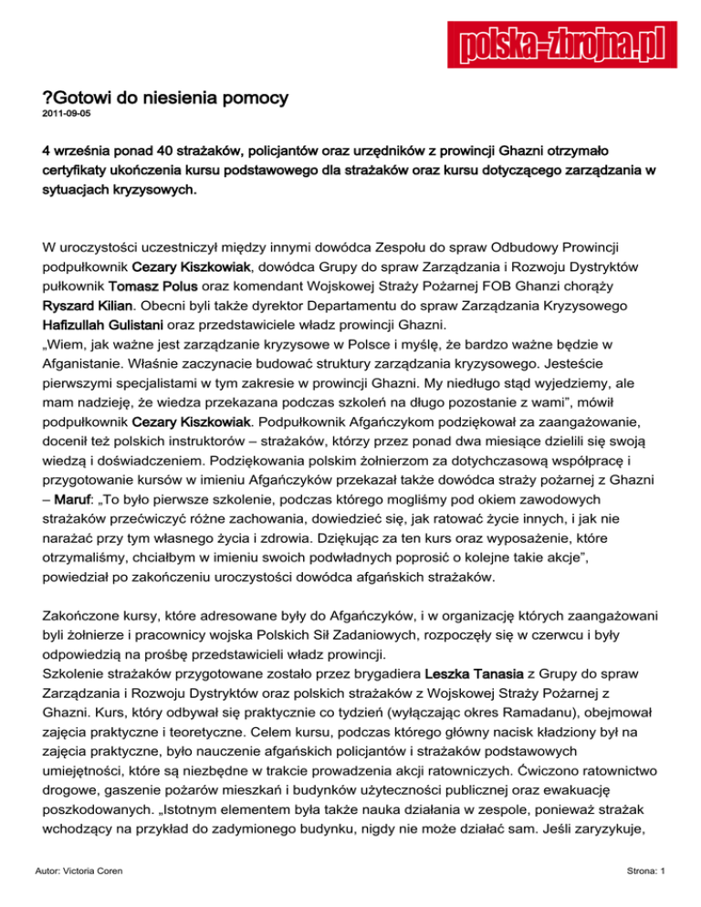 ?Gotowi do niesienia pomocy 2011-09-05 4 września ponad 40 strażaków, policjantów oraz urzędników z prowincji Ghazni otrzymało certyfikaty ukończenia kursu podstawowego dla strażaków oraz kursu dotyczącego zarządzania w sytuacjach kryzysowych. W uroczystości uczestniczył między innymi dowódca Zespołu do spraw Odbudowy Prowincji podpułkownik Cezary Kiszkowiak, dowódca Grupy do spraw Zarządzania i Rozwoju Dystryktów pułkownik Tomasz Polus oraz komendant Wojskowej Straży Pożarnej FOB Ghanzi chorąży Ryszard Kilian. Obecni byli także dyrektor Departamentu do spraw Zarządzania Kryzysowego Hafizullah Gulistani oraz przedstawiciele władz prowincji Ghazni. „Wiem, jak ważne jest zarządzanie kryzysowe w Polsce i myślę, że bardzo ważne będzie w Afganistanie. Właśnie zaczynacie budować struktury zarządzania kryzysowego. Jesteście pierwszymi specjalistami w tym zakresie w prowincji Ghazni. My niedługo stąd wyjedziemy, ale mam nadzieję, że wiedza przekazana podczas szkoleń na długo pozostanie z wami”, mówił podpułkownik Cezary Kiszkowiak. Podpułkownik Afgańczykom podziękował za zaangażowanie, docenił też polskich instruktorów – strażaków, którzy przez ponad dwa miesiące dzielili się swoją wiedzą i doświadczeniem. Podziękowania polskim żołnierzom za dotychczasową współpracę i przygotowanie kursów w imieniu Afgańczyków przekazał także dowódca straży pożarnej z Ghazni – Maruf: „To było pierwsze szkolenie, podczas którego mogliśmy pod okiem zawodowych strażaków przećwiczyć różne zachowania, dowiedzieć się, jak ratować życie innych, i jak nie narażać przy tym własnego życia i zdrowia. Dziękując za ten kurs oraz wyposażenie, które otrzymaliśmy, chciałbym w imieniu swoich podwładnych poprosić o kolejne takie akcje”, powiedział po zakończeniu uroczystości dowódca afgańskich strażaków. Zakończone kursy, które adresowane były do Afgańczyków, i w organizację których zaangażowani byli żołnierze i pracownicy wojska Polskich Sił Zadaniowych, rozpoczęły się w czerwcu i były odpowiedzią na prośbę przedstawicieli władz prowincji. Szkolenie strażaków przygotowane zostało przez brygadiera Leszka Tanasia z Grupy do spraw Zarządzania i Rozwoju Dystryktów oraz polskich strażaków z Wojskowej Straży Pożarnej z Ghazni. Kurs, który odbywał się praktycznie co tydzień (wyłączając okres Ramadanu), obejmował zajęcia praktyczne i teoretyczne. Celem kursu, podczas którego główny nacisk kładziony był na zajęcia praktyczne, było nauczenie afgańskich policjantów i strażaków podstawowych umiejętności, które są niezbędne w trakcie prowadzenia akcji ratowniczych. Ćwiczono ratownictwo drogowe, gaszenie pożarów mieszkań i budynków użyteczności publicznej oraz ewakuację poszkodowanych. „Istotnym elementem była także nauka działania w zespole, ponieważ strażak wchodzący na przykład do zadymionego budynku, nigdy nie może działać sam. Jeśli zaryzykuje, Autor: Victoria Coren Strona: 1 bardzo łatwo może stać się ofiarą”, podsumowuje szkolenie sierżant Grzegorz Kroczak z Wojskowej Straży Pożarnej z Ghazni. Podczas pierwszych treningów polscy żołnierze uczyli Afgańczyków, jak prawidłowo zabezpieczyć miejsce wypadku samochodowego, jak ugasić pożar mieszkania, i jak pomóc ewentualnym ofiarom takich zdarzeń. Afgańscy policjanci podczas ćwiczeń korzystali z własnego sprzętu oraz ze sprzętu, jaki na wyposażeniu mają polscy żołnierze z Wojskowej Ochrony Przeciwpożarowej. Ważnym elementem kursu była nauka udzielania pomocy medycznej ofiarom wypadków drogowych, pożarów czy katastrof. „Chcieliśmy przekazać Afgańczykom podstawową wiedzę, tak aby potrafili zaopatrzyć i przygotować poszkodowanego do ewakuacji medycznej. Na zajęciach uczyliśmy ich między innymi tamowania krwotoków i opatrywania złamanych kończyn. Dowiedzieli się także, jak wykonać prawidłowo resuscytacje krążeniowo oddechową”, mówi starszy szeregowy Grzegorz Szuścicki z Wojskowej Straży Pożarnej, który podczas kursu był odpowiedzialny za szkolenie medyczne. Kurs dotyczący zarządzania kryzysowego, za który odpowiadała Edyta Górlicka z Zespołu do spraw Odbudowy Prowincji adresowany był między innymi do szefa policji drogowej z Ghazni, urzędników z departamentu zdrowia, rolnictwa i dotyczył organizacji systemu ratownictwa, reagowania kryzysowego oraz dystrybucji pomocy humanitarnej w czasie kataklizmów. Oprócz niezbędnej wiedzy, dzięki staraniom PRT, na zakończenie kursu przekazano do Departamentu ds. Zarządzania kryzysowego wyposażenie do samochodów ratowniczych – nosze, środki opatrunkowe, zestawy do udzielania pierwszej pomocy przedmedycznej, kołnierze ortopedyczne oraz szyny Kramera. Podczas uroczystości podpułkownik Cezary Kiszkowiak przekazał dyrektorowi Departamentu do spraw Zarządzania Kryzysowego Hafizullahowi Gulistaniowi komplet map prowincji Ghazni. Szkolenie dotyczące ratownictwa oraz zarządzania kryzysowego z inicjatywy brygadiera Leszka Tanasia przygotowali żołnierze i specjaliści z DDG, PRT oraz Wojskowej Straży Pożarnej z FOB Ghazni. Część praktyczna prowadzona była pod kierunkiem komendanta Wojskowej Straży Pożarnej FOB Ghazni chorążego Ryszarda Kiliana, młodszego chorążego Grzegorza Leszczyńskiego, instruktora i wykładowcy Szkoły Specjalistów Pożarnictwa sierżanta Grzegorza Kroczaka z Wojskowej Straży Pożarnej 17 Brygady Zmechanizowanej w Międzyrzeczu. W przygotowanie i prowadzenie zajęć praktycznych, które odbywały się na terenie szkoły policji w bazie Ghazni (TSS) zaangażowani byli wszyscy strażacy IX zmiany Jednostki RatowniczoGaśniczej FOB Ghazni. Fot.: Bogumiła Piekut Autor: Victoria Coren Strona: 2