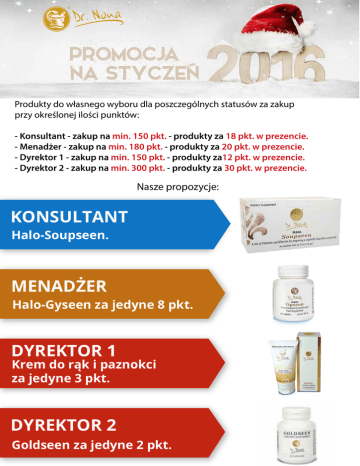 PROMOCJA na Styczeń Produkty do własnego wyboru dla poszczególnych statusów za zakup przy określonej ilości punktów: - Konsultant - zakup na min. 150 pkt. - produkty za 18 pkt. w prezencie. - Menadżer - zakup na min. 180 pkt. - produkty za 20 pkt. w prezencie. - Dyrektor 1 - zakup na min. 150 pkt. - produkty za12 pkt. w prezencie. - Dyrektor 2 - zakup na min. 300 pkt. - produkty za 30 pkt. w prezencie. Nasze propozycje: KONSULTANT Halo-Soupseen. MENADŻER Halo-Gyseen za jedyne 8 pkt. DYREKTOR 1 Krem do rąk i paznokci za jedyne 3 pkt. DYREKTOR 2 Goldseen za jedyne 2 pkt.