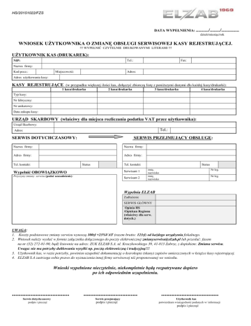 HS/20151022/FZS DATA WYPEŁNIENIA: ........../......../.............. dzień/miesiąc/rok WNIOSEK UŻYTKOWNIKA O ZMIANĘ OBSŁUGI SERWISOWEJ KASY REJESTRUJĄCEJ. !!! WYPEŁNIĆ CZYTELNIE DRUKOWANYMI LITERAMI !!! UŻYTKOWNIK KAS (DRUKAREK): Tel.: NIP: Fax: Nazwa firmy: Kod pocz.: Miejscowość: Adres: Adres użytkowania kasy: KASY REJESTRUJĄCE (w przypadku większej ilości kas, dołączyć zbiorczą listę z poniższymi danymi dla każdej kasy/drukarki): 1 kasa/drukarka 2 kasa/drukarka 3 kasa/drukarka 4 kasa/drukarka Typ kasy: Nr fabryczny: Nr unikatowy: Data zakupu kasy: URZĄD SKARBOWY (właściwy dla miejsca rozliczania podatku VAT przez użytkownika): Urząd Skarbowy: Tel.: Adres: SERWIS DOTYCHCZASOWY: SERWIS PRZEJMUJĄCY OBSŁUGĘ: Nazwa firmy: Nazwa firmy: Adres firmy: Adres firmy: Tel. kontakt: Status Tel. kontakt: Serwisant 1 Wypełnić OBOWIĄZKOWO Przyczyny zmiany serwisu (podać uzasadnienie): Serwisant 2 Status imię, nazwisko imię, nazwisko Nr leg. Nr leg. Wypełnia ELZAB Zadłużenie SERWIS GŁÓWNY Opinia HS /Opiekun Regionu (właściwy dla serw. dotych.) UWAGA: 1. Koszty podstawowe zmiany serwisu wynoszą 100zł +23%VAT (razem brutto: 123zł) od każdego urządzenia fiskalnego. 2. Wniosek należy wysłać w formie załącznika dołączonego do poczty elektronicznej [email protected] lub przesłać: faxem na nr (32) 272-81-90, bądź listownie na adres: ZUK ELZAB S.A. ul. Kruczkowskiego 39, 41-813 Zabrze, z dopiskiem: Zmiana serwisu. Uwaga: nie ma potrzeby dublowania wysyłki np. pocztą elektroniczną i tradycyjną!!! 3. Użytkownik kas, w razie potrzeby, powinien uzupełnić dokumentację o kserokopie (skany) zapisów umieszczonych w książce kasy rejestrującej. 4. ELZAB S.A zastrzega sobie prawo do wyznaczenia innej firmy serwisowej niż proponowanej we wniosku. Wnioski wypełnione nieczytelnie, niekompletnie będą rozpatrywane dopiero po ich odpowiednim uzupełnieniu. .................................. Serwis dotychczasowy podpis i pieczęć ................................ Serwis przejmujący podpis i pieczęć .................................. Użytkownik kas potwierdzam wiarygodność podanych w/ informacji podpis i pieczęć