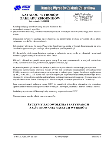KATALOG WYROBÓW ZAKŁADU ZBIORNIKÓW data wydania: 01.02.2012 Zakład Produkcyjny, 35-211 Rzeszów, ul. Reja 9 Tel.: +48 17 852 29 27 Fax: +48 17 852 20 93 Katalog niniejszy przedstawiamy naszym Klientom do: • zamawiania naszych wyrobów, • projektowania instalacji, obiektów technologicznych, w których nasze wyroby mogą mieć zastosowanie. Urządzenia zawarte w katalogu są produkowane na zamówienie. Cechuje je wysoka jakość atrakcyjna cena oraz krótki okres realizacji. Informujemy również, że nasza Pracownia Konstrukcyjna może wykonać dokumentację na urządzenia nie ujęte w naszym katalogu, ale o podobnym profilu produkcji. Użytkowników niniejszego katalogu prosimy o nadsyłanie uwag co do przydatności i rozwiązań konstrukcyjnych naszych urządzeń na adres firmy. Zbiorniki ciśnieniowe produkowane przez naszą firmę mają zastosowanie w stacjach uzdatniania wody, wymiennikowniach, kotłowniach, sprężarkowniach, itp. W procesie produkcji zbiorników jednym z podstawowych zakresów technologii jest spawanie. Stosujemy automatyczne spawanie łukiem krytym pod topnikiem (urządzeniami szwedzkiej firmy ESAB), automatyczne i półautomatyczne spawanie w osłonie gazu (argon, dwutlenek węgla) metodą TIG, MIG, MAG. Do cięcia stali wysoko-stopowych używamy urządzenia plazmowego. Badania spawów prowadzimy metodą radiograficzną izotopami promieniotwórczymi. Dysponujemy własnym Laboratorium Badań Niszczących i Nieniszczących, uznanym przez Dozór Techniczny. Poza uprawnieniami nadanymi przez UDT do produkcji zbiorników ciśnieniowych posiadamy uprawnienia do montażu i napraw kotłów wodnych i parowych, montażu i napraw suwnic i żurawi. Posiadamy wysokokwalifikowaną kadrę spawaczy z uprawnieniami TÜV. Gwarantujemy wysoką jakość naszych wyrobów. ŻYCZYMY ZADOWOLENIA I SATYSFAKCJI Z UŻYTKOWANIA NASZYCH WYROBÓW © INSTAL RZESZÓW Sp. z o.o KZ-00/12 WSTĘP Strona 1 z 3 SPIS KART KATALOGOWYCH I. II. Wstęp. Spis treści Instalacje wodociągowe, stacje uzdatniania wody 1. Hydrofory pionowe typ AI 2. Hydrofory pionowe typ AII 3. Wymienniki jonitowo-sodowe 4. Filtry pośpieszne zamknięte pionowe typ I φ400 ÷ φ800 5. Filtry pośpieszne zamknięte pionowe typ II φ1000 ÷ φ2400 6. Filtry pośpieszne zamknięte pionowe typ III φ2600 ÷ φ3400 7. Mieszaki wodno-powietrzne φ200 ÷ φ700 8. Mieszaki wodno-powietrzne φ800 ÷ φ1600 KZ-01/12 KZ-02/11 KZ-03/98 KZ-04/11 KZ-05/11 KZ-06/11 KZ-15/11 KZ-16/12 Instalacje sprężonego powietrza 1. Zbiorniki sprężonego powietrza 2. Odkraplacze do rurociągów φ15 ÷ φ65 3. Odkraplacze do rurociągów φ80 ÷ φ150 1. Zbiorniki sprężonego powietrza φ315 KZ-17/12 KZ-18/11 KZ-19/12 KZ-50/12 IV. Centralne ogrzewanie, centralna ciepła woda 1. Zbiorniki zasilające poziome typ I, typ II 2. Odgazowywacze termiczne typ I 3. Odgazowywacze termiczne typ II 4. Rozprężacze odmulin i odsolin 5. Zbiorniki do kondensatu typ A-1 6. Zbiorniki do kondensatu typ A-2, A-3 7. Zbiorniki do kondensatu typ B 8. Odmulacze φ150 ÷ φ400 9. Odmulacze φ500 ÷ φ700 10. Odmulacze stojące φ400 ÷ φ1000 .11. Chłodniczki do pobierania próbek 12. Zasobniki ciepła pionowe φ 900 ÷ φ1800 13. Zasobniki ciepła poziome φ900 ÷ φ1800 14. Jednosyfonowe przyrządy bezpieczeństwa 15. Naczynia wzbiorcze przeponowe 16. Sprzęgła hydrauliczne 17. Wymienniki ciepła φ900 ÷ φ1200 18. Podpory pod zbiorniki poziome φ400 ÷ φ2600 19. Rura syfonowa 20. Zbiorniki do wody tryskaczowej 21. Hydrofory poziome 22. Zbiorniki Wody Zimnej KZ-08/12 KZ-09/12 KZ-10/11 KZ-14/11 KZ-20/12 KZ-21/12 KZ-22/12 KZ-27/12 KZ-28/12 KZ-29/12 KZ-30/12 KZ-32/12 KZ-33/12 KZ-34/12 KZ-42/12 KZ-46/12 KZ-47/12 KZ-48/12 KZ-49/12 KZ-50/12 KZ-51/12 KZ-52/12 III. V. Zbiorniki podziemne LPG VI. Zbiorniki magazynowe oleju opałowego V=5÷ ÷100m3, dwupłaszczowe VII. Zbiorniki magazynowe oleju opałowego V=5÷ ÷100m3, jednopłaszczowe © INSTAL RZESZÓW Sp. z o.o KZ-00/12 WSTĘP - KZ-53/97 - KZ-54/97 - KZ-55/97 Strona 2 z 3 INFORMACJE DODATKOWE O PRODUKCJI ZAKŁADU ZBIORNIKÓW Oprócz wyrobów ujętych w kartach katalogowych produkujemy: Kołnierze płaskie na ciśnienie 0,25 ÷ 1,6 MPa wg PN-87/H-74731, Kołnierze szyjkowe na ciśnienie 0,63 ÷ 10,0 MPa wg PN-87/H-74710, Inne zbiorniki, cysterny, tanki z blach stalowych czarnych, kwasoodpornych, ciśnieniowe i bezciśnieniowe wg. dokumentacji klienta, 4. Wężownice do podgrzewaczy pojemnościowych i inne, 5. Hydroelewatory do c.o., 6. Kolana segmentowe i łuki gięte na zimno z rur, 7. Podpory ślizgowe, punkty stałe wg. katalogu KER t. VIII, 8. Kanały i kształtki odpylające i transportowe, 9. Wykonujmy wszelkiego rodzaju konstrukcje estakad, pomostów obsługowych podestów, schodów, platform itp., 10. Tłoczymy dennice wypukłe w zakresie średnic φ50 ÷ φ500 mm - na zimno, 11. Świadczymy usługi tokarskie i frezarskie. 1. 2. 3. © INSTAL RZESZÓW Sp. z o.o KZ-00/12 WSTĘP Strona 3 z 3