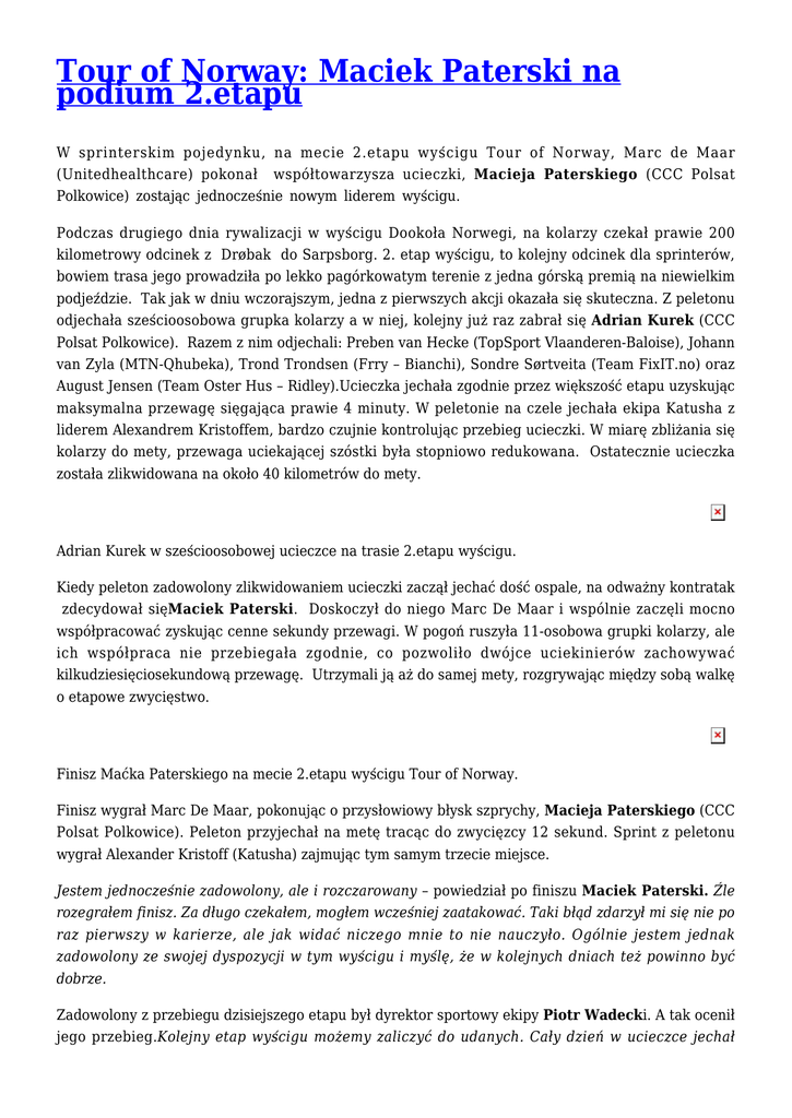 Tour of Norway: Maciek Paterski na podium 2.etapu W sprinterskim pojedynku, na mecie 2.etapu wyścigu Tour of Norway, Marc de Maar (Unitedhealthcare) pokonał współtowarzysza ucieczki, Macieja Paterskiego (CCC Polsat Polkowice) zostając jednocześnie nowym liderem wyścigu. Podczas drugiego dnia rywalizacji w wyścigu Dookoła Norwegi, na kolarzy czekał prawie 200 kilometrowy odcinek z Drøbak do Sarpsborg. 2. etap wyścigu, to kolejny odcinek dla sprinterów, bowiem trasa jego prowadziła po lekko pagórkowatym terenie z jedna górską premią na niewielkim podjeździe. Tak jak w dniu wczorajszym, jedna z pierwszych akcji okazała się skuteczna. Z peletonu odjechała sześcioosobowa grupka kolarzy a w niej, kolejny już raz zabrał się Adrian Kurek (CCC Polsat Polkowice). Razem z nim odjechali: Preben van Hecke (TopSport Vlaanderen-Baloise), Johann van Zyla (MTN-Qhubeka), Trond Trondsen (Frry – Bianchi), Sondre Sørtveita (Team FixIT.no) oraz August Jensen (Team Oster Hus – Ridley).Ucieczka jechała zgodnie przez większość etapu uzyskując maksymalna przewagę sięgająca prawie 4 minuty. W peletonie na czele jechała ekipa Katusha z liderem Alexandrem Kristoffem, bardzo czujnie kontrolując przebieg ucieczki. W miarę zbliżania się kolarzy do mety, przewaga uciekającej szóstki była stopniowo redukowana. Ostatecznie ucieczka została zlikwidowana na około 40 kilometrów do mety. Adrian Kurek w sześcioosobowej ucieczce na trasie 2.etapu wyścigu. Kiedy peleton zadowolony zlikwidowaniem ucieczki zaczął jechać dość ospale, na odważny kontratak zdecydował sięMaciek Paterski. Doskoczył do niego Marc De Maar i wspólnie zaczęli mocno współpracować zyskując cenne sekundy przewagi. W pogoń ruszyła 11-osobowa grupki kolarzy, ale ich współpraca nie przebiegała zgodnie, co pozwoliło dwójce uciekinierów zachowywać kilkudziesięciosekundową przewagę. Utrzymali ją aż do samej mety, rozgrywając między sobą walkę o etapowe zwycięstwo. Finisz Maćka Paterskiego na mecie 2.etapu wyścigu Tour of Norway. Finisz wygrał Marc De Maar, pokonując o przysłowiowy błysk szprychy, Macieja Paterskiego (CCC Polsat Polkowice). Peleton przyjechał na metę tracąc do zwycięzcy 12 sekund. Sprint z peletonu wygrał Alexander Kristoff (Katusha) zajmując tym samym trzecie miejsce. Jestem jednocześnie zadowolony, ale i rozczarowany – powiedział po finiszu Maciek Paterski. Źle rozegrałem finisz. Za długo czekałem, mogłem wcześniej zaatakować. Taki błąd zdarzył mi się nie po raz pierwszy w karierze, ale jak widać niczego mnie to nie nauczyło. Ogólnie jestem jednak zadowolony ze swojej dyspozycji w tym wyścigu i myślę, że w kolejnych dniach też powinno być dobrze. Zadowolony z przebiegu dzisiejszego etapu był dyrektor sportowy ekipy Piotr Wadecki. A tak ocenił jego przebieg.Kolejny etap wyścigu możemy zaliczyć do udanych. Cały dzień w ucieczce jechał niezniszczalny Adrian Kurek, a w ciężkiej końcówce etapu bardzo dobrze jechali też pozostali zawodnicy naszego zespołu. Na szczególną pochwałę zasłużył Maciek Paterski, któremu w trudnym momencie udało się odjechać od czołowej grupy z jednym z zawodników zespołu UnitedHealthcare. Na pewno drugie miejsce na etapie jest dobrym wynikiem i ogólnie cieszy postawa całego zespołu, ale nie ukrywam, czuję też pewien niedosyt, bo zwycięstwo było naprawdę blisko. Maciek dotychczas w swojej karierze głównie pracował na rzecz innych, a sztuki wygrywania też trzeba się nauczyć. Oby lekcja z dzisiejszego etapu przyniosła w przyszłości pozytywne efekty, bo wierzę, że jeszcze niejednokrotnie znajdzie się w takiej sytuacji jak dziś – zakończył Piotr Wadecki. Wyniki 2. etapu Tour of Norway (2.HC), Drøbak – Sarpsborg (194 km): 1. Marc De Maar (UnitedHealthcare Pro) 2. Maciej Paterski (CCC Polsat Polkowice) 3. Alexander Kristoff (Team Katusha) 00:12 11. Bartłomiej Matysiak 20. Jarosław Marycz 28. Marek Rutkiewicz 81. Adrian Kurek 4:23 99. Branislau Samiolau 8:43 info: A.Dyszyński, foto. M.Indzierowski 4:38:38