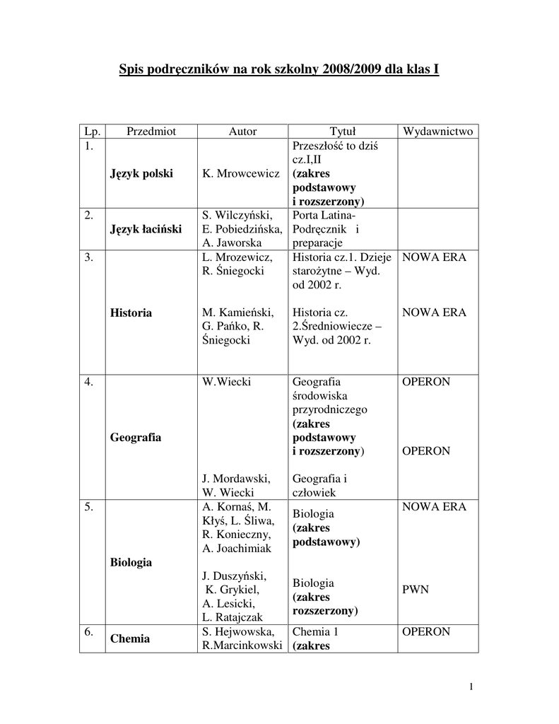 Spis podręczników na rok szkolny 2008/2009 dla klas I