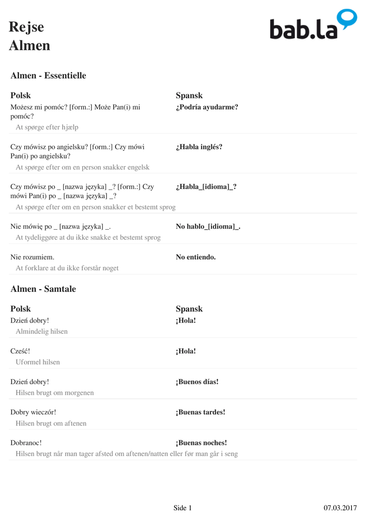 Rejse Almen Almen - Essentielle Polsk Spansk Możesz mi pomóc? [form.:] Może Pan(i) mi pomóc? At spørge efter hjælp ¿Podría ayudarme? Czy mówisz po angielsku? [form.:] Czy mówi Pan(i) po angielsku? At spørge efter om en person snakker engelsk ¿Habla inglés? Czy mówisz po _ [nazwa języka] _? [form.:] Czy ¿Habla_[idioma]_? mówi Pan(i) po _ [nazwa języka] _? At spørge efter om en person snakker et bestemt sprog Nie mówię po _ [nazwa języka] _. At tydeliggøre at du ikke snakke et bestemt sprog No hablo_[idioma]_. Nie rozumiem. At forklare at du ikke forstår noget No entiendo. Almen - Samtale Polsk Spansk Dzień dobry! Almindelig hilsen ¡Hola! Cześć! Uformel hilsen ¡Hola! Dzień dobry! Hilsen brugt om morgenen ¡Buenos días! Dobry wieczór! Hilsen brugt om aftenen ¡Buenas tardes! Dobranoc! ¡Buenas noches! Hilsen brugt når man tager afsted om aftenen/natten eller før man går i seng Side 1 07.03.2017 Rejse Almen Jak się masz? [form.:] Jak się Pan(i) ma? ¿Cómo estás? Venlig småsnak om hvordan den anden person har det Dobrze, dziękuję. Venligt svar til 'Hvordan har du det?' Bien, gracias. Jak się nazywasz? [form.:] Jak się Pan(i) nazywa? At spørge efter den anden persons navn ¿Cómo te llamas? Nazywam się ___. At fortælle en dit navn Me llamo ___. Skąd pochodzisz? [form.:] Skąd Pan(i) pochodzi? At spørge efter nogens oprindelse ¿De qué país vienes? Pochodzę z ___. At svare på din oprindelse Soy de ___. Ile masz lat? [form.:] Ile ma Pan(i) lat? At spørge efter nogens alder ¿Cuántos años tienes? Mam ___ lat(a). At svare på din alder Tengo ___ años. Tak Positivt svar Sí. Nie Negativt svar No Proszę Et fyldeord som tilføjer et positivt præg Por favor Proszę bardzo! Brugt når man giver noget til en ¡Aquí tienes! Dziękuję. At takke nogen Gracias Side 2 07.03.2017 Rejse Almen Dziękuję bardzo. At takke nogen meget med varme Muchas gracias. Proszę bardzo! / Nie ma za co! At svare venligt på et "tak" De nada Przepraszam. At undskylde for noget Lo siento. Przepraszam. At få ens opmærksomhed Disculpe. Nic się nie stało. At svare på en undskyldning hvis du accepterer den Está bien. Nie ma sprawy. At svare på en undskyldning hvis du accepterer den No hay problema. Uwaga! At gøre en opmærksom på fare ¡Cuidado! Jestem głodny/-a. Brugt når du er sulten Tengo hambre. Chce mi się pić. Brugt når du er tørstig Tengo sed. Jestem zmęczony/-a. Brugt når du er træt Estoy cansado/a. Źle się czuję. Brugt når du er syg Estoy enfermo/a. Nie wiem. Du kender ikke svaret på et spørgsmål No sé. Miło było cię poznać. [form.:] Miło było Panią/Pana poznać. Venlig fravel frase efter det første møde Fue un placer conocerte. Side 3 07.03.2017 Rejse Almen Do widzenia! At sige farvel ¡Adiós! Almen - Klager Polsk Spansk Chciał(a)bym złożyć skargę. En venlig måde at starte din klage på Me gustaría realizar una queja. Kto tu rządzi? At finde ud af hvem der er ansvarlig ¿Quién es el encargado? To jest absolutnie niedopuszczalne! At vise din utilfredshed meget stærkt Esto es totalmente inaceptable. Żądam zwrotu pieniędzy! At spørge efter en tilbagebetalelse ¡Quiero mi dinero de vuelta! Czekamy ponad godzinę. At klage over meget lange ventetider Hemos estado esperando por más de una hora. Almen - At bande Polsk Spansk To jedzenie smakuje jak gówno! ¡Ésta comida sabe a mierda! Uhøflig måde at vise man er utilfreds med sit mad på Ten napój/drink smakuje jak szczyny! ¡Ésta bebida está asquerosa! Uhøflig måde at vise man er utilfreds med sin drink på To miejsce to obrzydliwa nora! ¡Éste lugar es horrible! Uhøflig måde at vise man er utilfreds med et sted på Ten samochód to wrak! Uhøflig måde at vise man er utilfreds med en bil på ¡Éste coche es una porquería! Obsługa jest do dupy! ¡El servicio apesta! Uhøflig måde at vise man er utilfreds med servicen på Side 4 07.03.2017 Rejse Almen To jest totalne zdzierstwo! At klage uforskammet over en høj pris ¡Esto es un robo total! Gówno prawda! ¡Eso es una estupidez! Uforskammet måde at vise tvivl over noget en sagde Kretyn/Kretynka! ¡Eres un idiota! At fornærme en person ved at kritisere hans/hendes intelligens Gówno wiesz! ¡No sabes una mierda! At fornærme en person ved at kritisere hans/hendes viden Odwal się! ¡Vete a la mierda! At fortælle en person på en uforskammet måde at han/hun skal gå med det samme Załatwmy to na zewnątrz! At spørge en person om at slås udenfor et sted ¡Arreglemos esto afuera! Side 5 Powered by TCPDF (www.tcpdf.org) 07.03.2017
