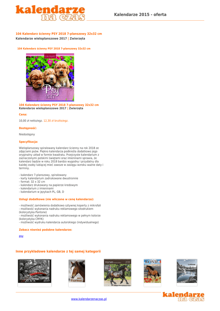 Kalendarze 2015 - oferta 104 Kalendarz ścienny PSY 2018 7-planszowy 32x32 cm Kalendarze wieloplanszowe 2017 | Zwierzęta 104 Kalendarz ścienny PSY 2018 7-planszowy 32x32 cm 104 Kalendarz ścienny PSY 2018 7-planszowy 32x32 cm Kalendarze wieloplanszowe 2017 | Zwierzęta Cena: 10,00 zł netto/egz. 12,30 zł brutto/egz. Dostępność: Niedostępny Specyfikacja: Wieloplanszowy spiralowany kalendarz ścienny na rok 2018 ze zdjęciami psów. Piękno kalendarza podkreśla dodatkowo jego oryginalny układ w formie kwadratu. Przejrzyste kalendarium z zaznaczonymi polskimi świętami oraz imieninami sprawia, że kalendarz będzie w roku 2018 bardzo wygodny i przydatny dla każdej osoby lubiącej mieć zawsze w zasięgu wzroku ważne daty i terminy. - kalendarz 7-planszowy, spiralowany - karty kalendarium zadrukowane dwustronnie - format: 32 x 32 cm - kalendarz drukowany na papierze kredowym - kalendarium z imieninami - kalendarium w językach PL, GB, D Usługi dodatkowe (nie wliczone w cenę kalendarza): - możliwość zamówienia dodatkowo sztywnej koperty z mikrofali - możliwość wykonania nadruku reklamowego sitodrukiem (kolorystyka Pantone) - możliwość wykonania nadruku reklamowego w pełnym kolorze (kolorystyka CMYK) - możliwość wydruku kalendarza autorskiego (indywidualnego) Zobacz również podobne kalendarze: psy Inne przykładowe kalendarze z tej samej kategorii www.kalendarzenaczas.pl Kalendarze 2015 - oferta www.kalendarzenaczas.pl