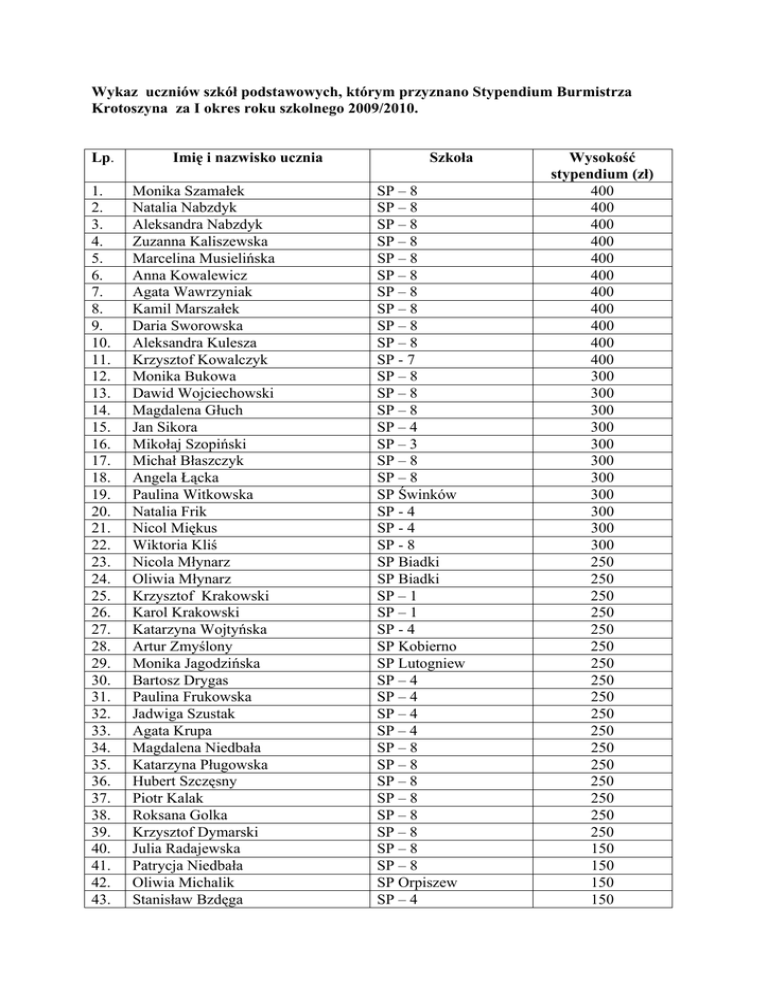 Wykaz uczniów szkół podstawowych, którym przyznano Stypendium Burmistrza Krotoszyna za I okres roku szkolnego 2009/2010. Lp. 1. 2. 3. 4. 5. 6. 7. 8. 9. 10. 11. 12. 13. 14. 15. 16. 17. 18. 19. 20. 21. 22. 23. 24. 25. 26. 27. 28. 29. 30. 31. 32. 33. 34. 35. 36. 37. 38. 39. 40. 41. 42. 43. Imię i nazwisko ucznia Monika Szamałek Natalia Nabzdyk Aleksandra Nabzdyk Zuzanna Kaliszewska Marcelina Musielińska Anna Kowalewicz Agata Wawrzyniak Kamil Marszałek Daria Sworowska Aleksandra Kulesza Krzysztof Kowalczyk Monika Bukowa Dawid Wojciechowski Magdalena Głuch Jan Sikora Mikołaj Szopiński Michał Błaszczyk Angela Łącka Paulina Witkowska Natalia Frik Nicol Miękus Wiktoria Kliś Nicola Młynarz Oliwia Młynarz Krzysztof Krakowski Karol Krakowski Katarzyna Wojtyńska Artur Zmyślony Monika Jagodzińska Bartosz Drygas Paulina Frukowska Jadwiga Szustak Agata Krupa Magdalena Niedbała Katarzyna Pługowska Hubert Szczęsny Piotr Kalak Roksana Golka Krzysztof Dymarski Julia Radajewska Patrycja Niedbała Oliwia Michalik Stanisław Bzdęga Szkoła SP – 8 SP – 8 SP – 8 SP – 8 SP – 8 SP – 8 SP – 8 SP – 8 SP – 8 SP – 8 SP - 7 SP – 8 SP – 8 SP – 8 SP – 4 SP – 3 SP – 8 SP – 8 SP Świnków SP - 4 SP - 4 SP - 8 SP Biadki SP Biadki SP – 1 SP – 1 SP - 4 SP Kobierno SP Lutogniew SP – 4 SP – 4 SP – 4 SP – 4 SP – 8 SP – 8 SP – 8 SP – 8 SP – 8 SP – 8 SP – 8 SP – 8 SP Orpiszew SP – 4 Wysokość stypendium (zł) 400 400 400 400 400 400 400 400 400 400 400 300 300 300 300 300 300 300 300 300 300 300 250 250 250 250 250 250 250 250 250 250 250 250 250 250 250 250 250 150 150 150 150 44. 45. 46. 47. 48. 49. 50. 51. 52. 53. 54. 55. 56. 57. 58. 59. 60. 61. 62. 63. 64. 65. 66. 67. 68. 69. 70. 71. 72. 73. 74. 75. 76. 77. 78. 79. 80. 81. 82. 83. 84. 85. 86. 87. 88. 89. 90. 91. Zuzanna Puśledzka Szymon Gąsiorek Klaudia Biesiadecka Zuzanna Bałoniak Piotr Minta Kamila Szcześniak Izabela Wróbel Marta Brenk Natalia Szymczak Anna Tomczyk Monika Dryjańska Liliana Wielebska Aleksandra Żmuda Oliwia Mielcarek Konrad Rosik Jagoda Kubiak Tobiasz Pauter Dominik Kostka Julia Głowacz Maciej Banaszyński Oliwia Młoda Dawid Gut Agata Walter Aleksandra Walczak Tomasz Kowal Julia Kalak Martyna Kmiecik Krzysztof Pęcak Anna Kaczyńska Anna Witczak Natalia Stefańska Agnieszka Siecla Julia Dzierla Wiktoria Grenda Kornelia Maryniak Dominik Piduch Michał Szaliński Miłosz Kołacki Adam Wierzowiecki Julia Bałoniak Michał Drzewiecki Zuzanna Kozłowska Katarzyna Koczorowska Marcelina Winkowska Paulina Nowak Anna Praczyk Dominika Sobecka Karolina Baran SP – 4 SP – 4 SP – 4 SP – 4 SP – 4 SP Kobierno SP Lutogniew SP - 7 SP - 7 SP - 7 SP - 4 SP - 8 SP - 4 SP - 8 SP - 8 SP - 8 SP - 8 SP - 8 SP - 8 SP - 8 SP Benice SP Benice SP - 8 SP - 3 SP – 8 SP - 4 SP - 4 SP - 8 SP - 8 SP - 4 SP - 1 SP Lutogniew SP – 1 SP – 7 SP – 7 SP – 7 SP – 7 SP – 7 SP – 4 SP – 4 SP – 4 SP – 4 SP – 4 SP – 4 SP Gorzupia SP – 8 SP Świnków SP - 8 150 150 150 150 150 150 150 150 150 150 150 150 150 150 150 150 150 150 150 150 150 150 150 150 150 150 150 150 150 150 150 150 150 150 150 150 150 150 150 150 150 150 150 150 150 150 150 150 92. 93. 94. 95. 96. 97. 98. 99. 100. 101. 102. 103. 104. 105. 106. 107. 108. 109. 110. 111. 112. 113. 114. 115. 116. 117. 118. 119. 120. 121. 122. 123. 124. 125. 126. 127. 128. 129. 130. 131. 132. 133. 134. 135 136. 137. 138. 139. Mikołaj Bielawny Katarzyna Drewniak Mikołaj Młynarczyk Oliwia Ludwiczak Weronika Kolska Magdalena Pabich Maciej Maciejewski Katarzyna Kowalewicz Agnieszka Szeszycka Kacper Kmieciak Oliwia Furman Oskar Machowski Patrycja Kościółek Weronika Mikołajczyk Zuzanna Nabzdyk Natalia Frala Monika Szlachta Luke Slade Agnieszka Stróżyńska Grzegorz Górski Roksana Paterczyk Magdalena Kondrady Martyna Kostka Magdalena Krupa Filip Zybała Dominika Mikołajczyk Wanessa Wasielewska Patrycja Ratajczak Wiktoria Wujczyk Weronika Dutkowiak Dominik Dymarski Karol Szeszycki Aleksandra Zwierz Marlena Bielawska Agata Nowicka Natalia Szymczak Piotr Woźniak Ewa Łączewna Dominika Walczak Magda Ptak Hubert Orpel Katarzyna Szczepańska Chrystian Grzelski Dominika Latusek Sandra Kuśnierz Anna Glinkowska Aleksandra Junik Marcelina Szuniewicz SP - 8 SP - 8 SP - 8 SP - 8 SP - 8 SP - 8 SP - 8 SP - 8 SP - 8 SP - 8 SP - 8 SP - 8 SP Benice SP Benice SP Benice SP Benice SP Roszki SP - Lutogniew SP – 7 SP Chwaliszew SP - 8 SP - 8 SP Benice SP Roszki SP Roszki SP Benice SP Benice SP - 8 SP - 8 SP - 8 SP - 8 SP - 8 SP Biadki SP Gorzupia SP Gorzupia SP Gorzupia SP Gorzupia SP Chwaliszew SP Chwaliszew SP – 3 SP Orpiszew SP – 4 SP – 4 SP – 4 SP - 4 SP - 4 SP - 4 SP - 4 150 150 150 150 150 150 150 150 150 150 150 150 150 150 150 150 150 150 150 150 150 150 150 150 150 150 150 150 150 150 150 150 150 150 150 150 150 150 150 150 150 150 150 150 150 150 150 150 140. 141. 142. 143. 144. 145. 146. 147. 148. 149. 150. Krzysztof Garbarek Jagoda Aleksandrzak Barbara Pypłowska Kacper Grzesiński Marcel Ide Sonia Sikora Zuzanna Czachorek Krzysztof Bzik Szymon Kosakowski Klaudia Wojcieszyńska Olga Szymczak SP - 4 SP - 4 SP - 4 SP - 4 SP – 7 SP – 7 SP – 7 SP – 7 SP – 7 SP - 1 SP – 1 150 150 150 150 150 150 150 150 150 150 150 Wykaz uczniów gimnazjów, którym przyznano Stypendium Burmistrza Krotoszyna za I okres roku szkolnego 2009/2010. Lp. 1. 2. 3. 4. 5. 6. 7. 8. 9. 10. 11. 12. 13. 14. 15. 16. 17. 18. 19. 20. 21. 22. 23. 24. 25. 26. 27. 28. 29. 30. Imię i nazwisko ucznia Maria Graf Bernadetta Szlachta Katarzyna Patryniak Katarzyna Zajączkowska Arkadiusz Brenk Olga Menzel Zuzanna Maciejewska Joanna Nowaczyk Marzena Wojtkowiak Marta Kaczmarek Agnieszka Brodziak Jan Jakubek Karolina Pestka Zofia Mroczek Faustyna Grobelna Natalia Olszewska Magdalena Sobańska Adrianna Kaczmarek Eryk Muszalski Bartosz Gąsiorkiewicz Anna Helińska Paulina Kujawa Piotr Maciejewski Magdalena Stefańska Krystian Binkofski Sylwia Włodarz Ane
