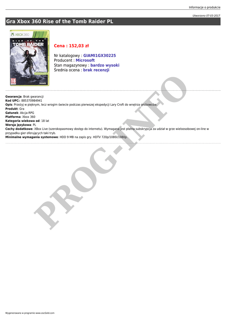 Informacje o produkcie Utworzono 07-03-2017 Gra Xbox 360 Rise of the Tomb Raider PL Cena : 152,03 zł FO Nr katalogowy : GIAMI1GX30225 Producent : Microsoft Stan magazynowy : bardzo wysoki Średnia ocena : brak recenzji PR O G -I N Gwarancja: Brak gwarancji Kod UPC:: 885370984941 Opis: Przeżyj w pięknym, lecz wrogim świecie podczas pierwszej ekspedycji Lary Croft do wnętrza grobowców. Produkt: Gra Gatunek: Akcja-RPG Platforma: Xbox 360 Kategoria wiekowa od: 18 lat Wersja językowa: PL Cechy dodatkowe: XBox Live (szerokopasmowy dostęp do internetu). Wymagana jest płatna subskrypcja za udział w grze wieloosobowej on-line w przypadku gier oferujących taki tryb. Minimalne wymagania systemowe: HDD 9 MB na zapis gry. HDTV 720p/1080i/1080p. Wygenerowano w programie www.oscGold.com