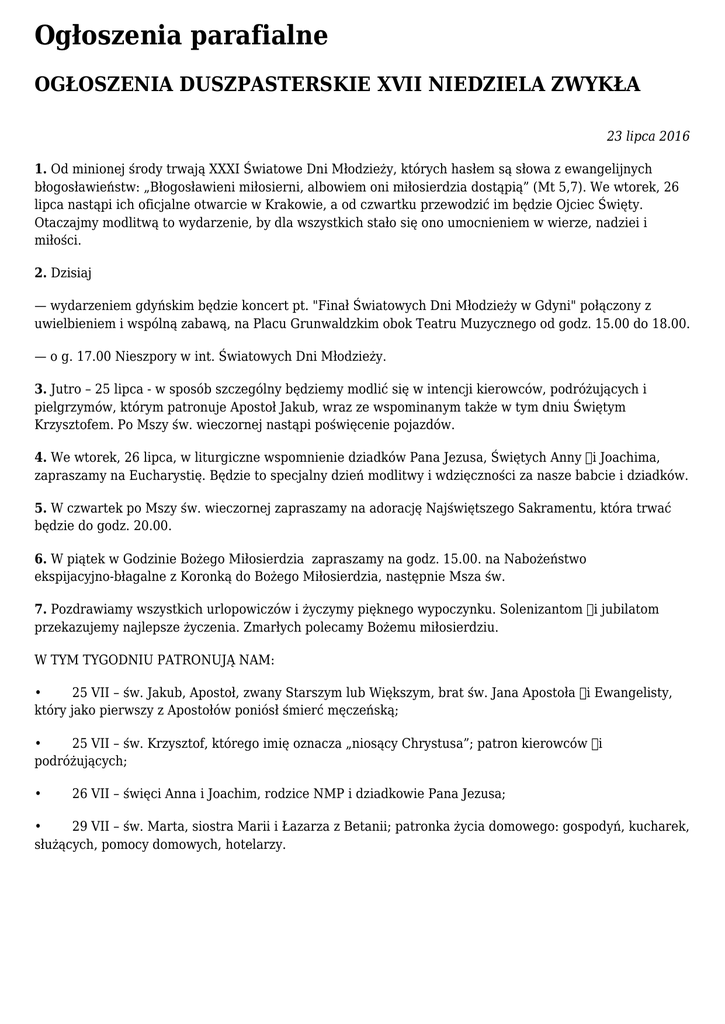 Ogłoszenia parafialne OGŁOSZENIA DUSZPASTERSKIE XVII NIEDZIELA ZWYKŁA 23 lipca 2016 1. Od minionej środy trwają XXXI Światowe Dni Młodzieży, których hasłem są słowa z ewangelijnych błogosławieństw: „Błogosławieni miłosierni, albowiem oni miłosierdzia dostąpią” (Mt 5,7). We wtorek, 26 lipca nastąpi ich oficjalne otwarcie w Krakowie, a od czwartku przewodzić im będzie Ojciec Święty. Otaczajmy modlitwą to wydarzenie, by dla wszystkich stało się ono umocnieniem w wierze, nadziei i miłości. 2. Dzisiaj — wydarzeniem gdyńskim będzie koncert pt. "Finał Światowych Dni Młodzieży w Gdyni" połączony z uwielbieniem i wspólną zabawą, na Placu Grunwaldzkim obok Teatru Muzycznego od godz. 15.00 do 18.00. — o g. 17.00 Nieszpory w int. Światowych Dni Młodzieży. 3. Jutro – 25 lipca - w sposób szczególny będziemy modlić się w intencji kierowców, podróżujących i pielgrzymów, którym patronuje Apostoł Jakub, wraz ze wspominanym także w tym dniu Świętym Krzysztofem. Po Mszy św. wieczornej nastąpi poświęcenie pojazdów. 4. We wtorek, 26 lipca, w liturgiczne wspomnienie dziadków Pana Jezusa, Świętych Anny i Joachima, zapraszamy na Eucharystię. Będzie to specjalny dzień modlitwy i wdzięczności za nasze babcie i dziadków. 5. W czwartek po Mszy św. wieczornej zapraszamy na adorację Najświętszego Sakramentu, która trwać będzie do godz. 20.00. 6. W piątek w Godzinie Bożego Miłosierdzia zapraszamy na godz. 15.00. na Nabożeństwo ekspijacyjno-błagalne z Koronką do Bożego Miłosierdzia, następnie Msza św. 7. Pozdrawiamy wszystkich urlopowiczów i życzymy pięknego wypoczynku. Solenizantom i jubilatom przekazujemy najlepsze życzenia. Zmarłych polecamy Bożemu miłosierdziu. W TYM TYGODNIU PATRONUJĄ NAM: • 25 VII – św. Jakub, Apostoł, zwany Starszym lub Większym, brat św. Jana Apostoła i Ewangelisty, który jako pierwszy z Apostołów poniósł śmierć męczeńską; • 25 VII – św. Krzysztof, którego imię oznacza „niosący Chrystusa”; patron kierowców i podróżujących; • 26 VII – święci Anna i Joachim, rodzice NMP i dziadkowie Pana Jezusa; • 29 VII – św. Marta, siostra Marii i Łazarza z Betanii; patronka życia domowego: gospodyń, kucharek, służących, pomocy domowych, hotelarzy.