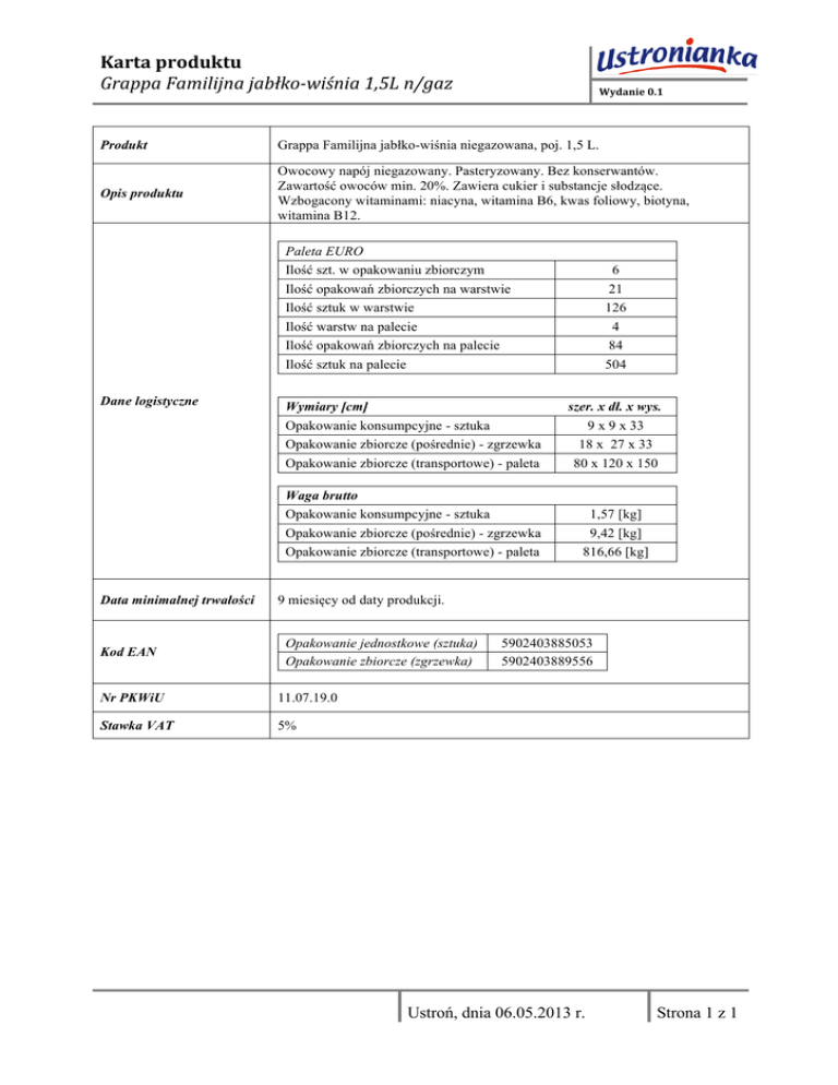 Karta produktu Grappa Familijna jabłko-‐wiśnia 1,5L n/gaz Wydanie 0.1 Produkt Grappa Familijna jabłko-wiśnia niegazowana, poj. 1,5 L. Opis produktu Owocowy napój niegazowany. Pasteryzowany. Bez konserwantów. Zawartość owoców min. 20%. Zawiera cukier i substancje słodzące. Wzbogacony witaminami: niacyna, witamina B6, kwas foliowy, biotyna, witamina B12. Paleta EURO Ilość szt. w opakowaniu zbiorczym Ilość opakowań zbiorczych na warstwie Ilość sztuk w warstwie Ilość warstw na palecie Ilość opakowań zbiorczych na palecie Ilość sztuk na palecie Dane logistyczne Data minimalnej trwałości Kod EAN 6 21 126 4 84 504 Wymiary [cm] Opakowanie konsumpcyjne - sztuka Opakowanie zbiorcze (pośrednie) - zgrzewka Opakowanie zbiorcze (transportowe) - paleta szer. x dł. x wys. 9 x 9 x 33 18 x 27 x 33 80 x 120 x 150 Waga brutto Opakowanie konsumpcyjne - sztuka Opakowanie zbiorcze (pośrednie) - zgrzewka Opakowanie zbiorcze (transportowe) - paleta 1,57 [kg] 9,42 [kg] 816,66 [kg] 9 miesięcy od daty produkcji. Opakowanie jednostkowe (sztuka) Opakowanie zbiorcze (zgrzewka) Nr PKWiU 11.07.19.0 Stawka VAT 5% 5902403885053 5902403889556 Ustroń, dnia 06.05.2013 r. Strona 1 z 1