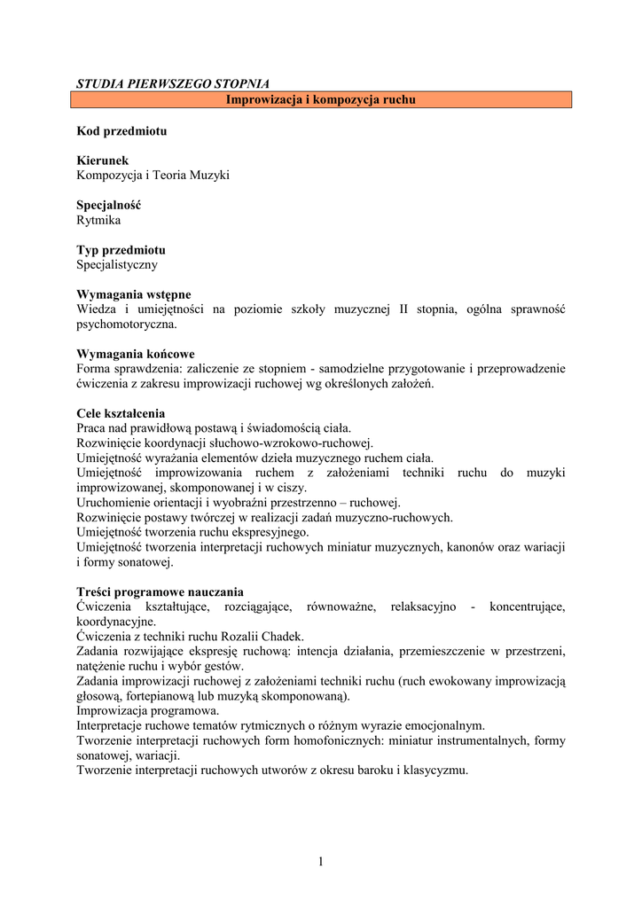STUDIA PIERWSZEGO STOPNIA Improwizacja i kompozycja ruchu Kod przedmiotu Kierunek Kompozycja i Teoria Muzyki Specjalność Rytmika Typ przedmiotu Specjalistyczny Wymagania wstępne Wiedza i umiejętności na poziomie szkoły muzycznej II stopnia, ogólna sprawność psychomotoryczna. Wymagania końcowe Forma sprawdzenia: zaliczenie ze stopniem - samodzielne przygotowanie i przeprowadzenie ćwiczenia z zakresu improwizacji ruchowej wg określonych założeń. Cele kształcenia Praca nad prawidłową postawą i świadomością ciała. Rozwinięcie koordynacji słuchowo-wzrokowo-ruchowej. Umiejętność wyrażania elementów dzieła muzycznego ruchem ciała. Umiejętność improwizowania ruchem z założeniami techniki ruchu do muzyki improwizowanej, skomponowanej i w ciszy. Uruchomienie orientacji i wyobraźni przestrzenno – ruchowej. Rozwinięcie postawy twórczej w realizacji zadań muzyczno-ruchowych. Umiejętność tworzenia ruchu ekspresyjnego. Umiejętność tworzenia interpretacji ruchowych miniatur muzycznych, kanonów oraz wariacji i formy sonatowej. Treści programowe nauczania Ćwiczenia kształtujące, rozciągające, równoważne, relaksacyjno - koncentrujące, koordynacyjne. Ćwiczenia z techniki ruchu Rozalii Chadek. Zadania rozwijające ekspresję ruchową: intencja działania, przemieszczenie w przestrzeni, natężenie ruchu i wybór gestów. Zadania improwizacji ruchowej z założeniami techniki ruchu (ruch ewokowany improwizacją głosową, fortepianową lub muzyką skomponowaną). Improwizacja programowa. Interpretacje ruchowe tematów rytmicznych o różnym wyrazie emocjonalnym. Tworzenie interpretacji ruchowych form homofonicznych: miniatur instrumentalnych, formy sonatowej, wariacji. Tworzenie interpretacji ruchowych utworów z okresu baroku i klasycyzmu. 1 Efekty kształcenia (uczenia się) po ukończeniu przedmiotu - w zakresie wiedzy • Student zna anatomiczne i fizjologiczne podstawy ruchu (K1_W15). • Zna sposoby poszukiwania i komponowania ruchu poprzez improwizację (K1_W17). - w zakresie umiejętności • Student potrafi w kreatywny sposób poszukiwać środków ruchowych (K1_U24). Metody nauczania Ćwiczenia Nakład pracy studenta potrzebny do osiągnięcia efektów uczenia się ROK SEMESTR I Punkty ECTS Ilość godzin w semestrze Rodzaj zaliczenia LEGENDA II III 1 2 3 4 5 6 2 2 2 2 2 5 30 30 30 30 30 30 zs zs zs zs zs zs zal – zaliczony; zs – zaliczenie ze stopniem; egz – egzamin; ed – egzamin dyplomowy Kryteria oceny Stopień realizacji zadań, zaangażowanie i kreatywność w pracach samodzielnych. Estetyka wykonawcza. Znajomość literatury przedmiotu. Literatura (piśmiennictwo) M. Brzozowska-Kuczkiewicz, Emil Jaques - Dalcroze i jego rytmika, WsiP, W-wa, 1991. B. Turska, Muzyczna ekspresja ruchu, AMFC, W-wa 1992. I.Turska, Analiza ruchu tanecznego według metod Labana – Joosa – Leedera, Materiały pomocnicze dla nauczycieli szkół i ognisk artystycznych, Zeszyt 63, C.O.P.S.A., Warszawa 1963. Język wykładowy Polski Imię i nazwisko wykładowcy kw. II st. Elżbieta Aleksandrowicz, prof. AM dr hab. Ewa Wojtyga, prof. AM dr Magdalena Owczarek mgr Aneta Skrzypczak mgr Justyna Sobieraj mgr Iwona Sztucka mgr Barbara Dominiak 2