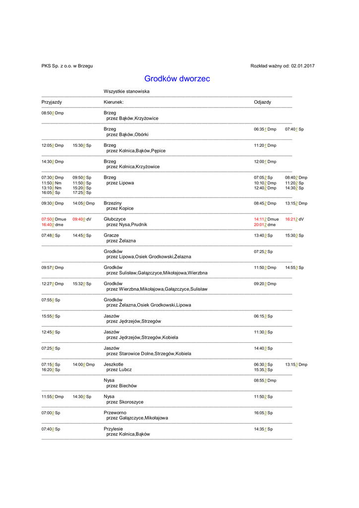 PKS Sp. z o.o. w Brzegu Rozkład ważny od: 02.01.2017 Grodków dworzec Wszystkie stanowiska ————————————————————————————————————————————————————————————————————————————————————————— Przyjazdy Kierunek: Odjazdy ————————————————————————————————————————————————————————————————————————————————————————— 08:500 Dmp Brzeg przez Bąków,Krzyżowice ————————————————————————————————————————————————————————————————————————————————————————— Brzeg 06:351 Dmp 07:401 Sp przez Bąków,Obórki ————————————————————————————————————————————————————————————————————————————————————————— 12:050 Dmp 15:300 Sp Brzeg 11:201 Dmp przez Kolnica,Bąków,Pępice ————————————————————————————————————————————————————————————————————————————————————————— 14:300 Dmp Brzeg 12:001 Dmp przez Kolnica,Krzyżowice ————————————————————————————————————————————————————————————————————————————————————————— 07:300 Dmp 09:500 Sp Brzeg 07:052 Sp 08:402 Dmp 11:500 Nm 11:500 Sp przez Lipowa 10:102 Dmp 11:202 Sp 13:100 Nm 16:050 Sp 15:200 Sp 17:250 Sp 12:402 Dmp 14:302 Sp ————————————————————————————————————————————————————————————————————————————————————————— 09:300 Dmp 14:050 Dmp Brzeziny 08:452 Dmp 13:152 Dmp przez Kopice ————————————————————————————————————————————————————————————————————————————————————————— 07:500 Dmue 09:400 dV Głubczyce 14:112 Dmue 16:212 dV 16:400 dme przez Nysa,Prudnik 20:012 dme ————————————————————————————————————————————————————————————————————————————————————————— 07:480 Sp 14:450 Sp Gracze 13:403 Sp 15:303 Sp przez Żelazna ————————————————————————————————————————————————————————————————————————————————————————— Grodków 07:252 Sp przez Lipowa,Osiek Grodkowski,Żelazna ————————————————————————————————————————————————————————————————————————————————————————— 09:570 Dmp Grodków 11:503 Dmp 14:553 Sp przez Sulisław,Gałązczyce,Mikołajowa,Wierzbna ————————————————————————————————————————————————————————————————————————————————————————— 12:270 Dmp 15:320 Sp Grodków 09:203 Dmp przez Wierzbna,Mikołajowa,Gałązczyce,Sulisław ————————————————————————————————————————————————————————————————————————————————————————— 07:550 Sp Grodków przez Żelazna,Osiek Grodkowski,Lipowa ————————————————————————————————————————————————————————————————————————————————————————— 15:550 Sp Jaszów 06:153 Sp przez Jędrzejów,Strzegów ————————————————————————————————————————————————————————————————————————————————————————— 12:450 Sp Jaszów 11:303 Sp przez Jędrzejów,Strzegów,Kobiela ————————————————————————————————————————————————————————————————————————————————————————— 07:250 Sp Jaszów 14:403 Sp przez Starowice Dolne,Strzegów,Kobiela ————————————————————————————————————————————————————————————————————————————————————————— 07:150 Sp 14:000 Dmp Jeszkotle 06:303 Sp 13:153 Dmp 16:200 Sp przez Lubcz 15:353 Sp ——————————————————————————————————————————————————