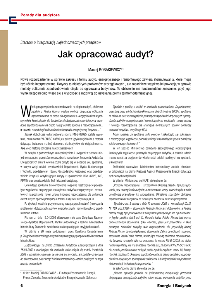 Porady dla audytora Starania o interpretację niejednoznacznych przepisów Jak opracować audyt? Maciej ROBAKIEWICZ*) Nowe rozporządzenie w sprawie zakresu i formy audytu energetycznego i remontowego zawiera sformułowania, które mogą być różnie interpretowane. Dotyczy to niektórych problemów szczegółowych , ale zasadnicze wątpliwości powstają w sprawie metody obliczania zapotrzebowania ciepła do ogrzewania budynków. To obliczenie ma fundamentalne znaczenie, gdyż jego wynik bezpośrednio wiąże się z wysokością możliwej do uzyskania premii termomodernizacyjnej. W edług rozporządzenia zapotrzebowanie na ciepło ma być „obliczone zgodnie z Polską Normą według metody dotyczącej obliczania zapotrzebowania na ciepło do ogrzewania z uwzględnieniem współczynników korekcyjnych; dla budynków nieobjętych zakresem tej normy sezonowe zapotrzebowanie na ciepło należy określić zgodnie z rozporządzeniem... w sprawie metodologii obliczania charakterystyki energetycznej budynku....” Jednak dotychczas wykorzystywana norma PN-B-02025 została wycofana, nowa norma PN-EN ISO 13790 jest tylko w języku angielskim, a metoda dotycząca świadectw ma być stosowana dla budynków nie objętych normą. Jaką więc metodę obliczania należy zastosować? W związku z powszechnym zaniepokojeniem i uwagami w sprawie niejednoznaczności przepisów rozporządzenia na wniosek Zrzeszenia Audytorów Energetycznych dnia 9 kwietnia 2009 odbyło się w siedzibie ZAE spotkanie, w którym wzięli udział: przedstawiciel Departamentu Rynku Budowlanego i Techniki, przedstawiciel Banku Gospodarstwa Krajowego oraz przedstawiciele instytucji weryfikujących audyty z upoważnienia BGK (KAPE, GIG, FEWE) oraz przedstawiciele ZAE i eksperci-audytorzy. Celem tego spotkania było omówienie i wspólne rozstrzygnięcie powstałych wątpliwości dotyczących sporządzania audytów energetycznych i remontowych na podstawie nowej ustawy i nowego rozporządzenia, dla uniknięcia ewentualnych sporów pomiędzy autorami audytów i weryfikacją BGK. Po dyskusji wspólnie przyjęto szereg następujących ustaleń (rozwiązania problemów) dotyczących audytów energetycznych i remontowych co przedstawiono w tabeli. Pismem z dnia 15.04.2009 skierowanym do pana Zbigniewa Radomskiego dyrektora Departamentu Rynku Budowlanego i Techniki Ministerstwa Infrastruktury Zrzeszenie zwróciło się o akceptację tych przyjętych ustaleń. W piśmie z 20 maja podpisanym przez Dyrektora Departamentu p. Zbigniewa Radomskiego otrzymaliśmy następującą odpowiedź Ministerstwa Infrastruktury: „Odpowiadając na pismo Zrzeszenia Audytorów Energetycznych z dnia 15.04.2009 r. nawiązujące do spotkania, które odbyło się w dniu 9 kwietnia 2009 r. uprzejmie informuję, że nie ma ani zwyczaju, ani podstaw prawnych do akceptowania przez Urząd Ministra Infrastruktury ustaleń podjętych na tego rodzaju spotkaniach. *) dr inż. Maciej ROBAKIEWICZ – Fundacja Poszanowania Energii, Prezes Zarządu; Zrzeszenie Audytorów Energetycznych, Sekretarz Zgodnie z prośbą o udział w spotkaniu przedstawiciela Departamentu, przesłaną przez p.Macieja Robakiewicza w dniu 2 kwietnia 2009 r., spotkanie to miało na celu rozstrzygnięcie powstałych wątpliwości dotyczących sporządzania audytów energetycznych i remontowych na podstawie nowej ustawy i nowego rozporządzenia, dla uniknięcia ewentualnych sporów pomiędzy autorami audytów i weryfikacją BGK. Mam nadzieję, że spotkanie było owocne i zakończyło się sukcesem, a rozstrzygnięte wątpliwości pozwolą uniknąć ewentualnych sporów pomiędzy zainteresowanymi stronami.” W ten sposób Ministerstwo odmówiło szczegółowego rozstrzygnięcia istniejących wątpliwości prawnych dotyczących audytów, a ostatnie zdanie można uznać za przyjęcie do wiadomości ustaleń podjętych na spotkaniu 9 kwietnia br. Dokładniej stanowisko Ministerstwa Infrastruktury zostało określone w odpowiedzi na pismo Krajowej Agencji Poszanowania Energii dotyczące tych samych wątpliwości. W piśmie Ministerstwa do KAPE stwierdzono, że: „Przepisy rozporządzenia… szczegółowo określają zasady i tryb postępowania przy sporządzaniu audytów, a zastosowane wzory, oraz ich opis w pełni umożliwiają prawidłowe ich sporządzanie. Określenie sposobów obliczania zapotrzebowania budynków na ciepło jest zawarte w treści rozporządzenia… Zgodnie z art. 5 ustawy z dnia 12 września 2002 o normalizacji (Dz.U. Nr 169, poz.1386) – stosowanie Polskich Norm jest dobrowolne, a Polskie Normy mogą być powoływane w przepisach prawnych po ich opublikowaniu w języku polskim (art.5 ust 1). Ponadto każda Polska Norma jest normą obowiązkowego stosowania, tylko wówczas, jeżeli jest przywołana w akcie prawnym, natomiast przepisy w/w rozporządzenia nie przywołują żadnej Polskiej Normy do obowiązkowego stosowania. Zatem do obliczeń może być stosowana każda Polska Norma, wskazująca metodę obliczania zapotrzebowania budynku na ciepło. Nie ma znaczenia, że norma PN-B-02025 ma status normy wycofanej, nie ma znaczenia również fakt, że norma PN-EN-ISO 13790 nie została przetłumaczona na język polski zgodnie z opisem wzoru 18, istnieje również możliwość określania zapotrzebowania na ciepło zgodnie z rozporządzeniem dotyczącym sporządzania świadectw, lub indywidualnie na podstawie dokumentacji technicznej lub pomiarów.” W zakończeniu pisma stwierdza się, że: „Obecna sytuacja pozwala na jednoznaczną interpretację przepisów dotyczących sporządzania audytów, zatem obawa odrzucenia audytów przez Energia i Budynek Porady dla audytora Tabela L.p. 1 2 3 4 5 6 7 8 9 10 Problem Rozwiązanie Jaką metodą obliczać zapotrzebowania ciepła w sytuacji Zapis w rozporządzeniu (zał.1, cz. 1, wzór 18) nie wyklucza możliwości posługiwania się obecnej, gdy nie ma aktualnej normy dla tych obliczeń? normą PN-B-02025, która już nie jest obowiązującą