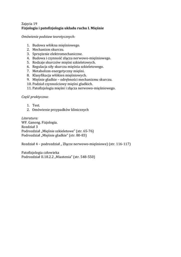 Zajęcia 19 Fizjologia i patofizjologia układu ruchu I. Mięśnie Omówienie podstaw teoretycznych: 1. Budowa włókna mięśniowego. 2. Mechanizm skurczu. 3. Sprzężenie elektromechaniczne. 4. Budowa i czynność złącza nerwowo-‐mięśniowego. 5. Rodzaje skurczów mięśni szkieletowych. 6. Regulacja siły skurczu mięśnia szkieletowego. 7. Metabolizm energetyczny mięśni. 8. Klasyfikacja włókien mięśniowych. 9. Mięśnie gładkie – odrębności mechanizmu skurczu. 10. Podział czynnościowy mięśni gładkich. 11. Patofizjologia mięśni i złącza nerwowo-‐mięśniowego. Część praktyczna: 1. Test. 2. Omówienie przypadków klinicznych Literatura: WF. Ganong. Fizjologia. Rozdział 3 Podrozdział „Mięśnie szkieletowe” (str. 65-‐76) Podrozdział „Mięśnie gładkie” (str. 80-‐83) Rozdział 4 – podrozdział „ Złącze nerwowo-‐mięśniowe) (str. 116-‐117) Patofizjologia człowieka Podrozdział II.18.2.2 „Miastenia” (str. 548-‐550)