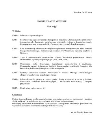 Wrocław, 24.02.2010 KOMUNIKACJE MIEJSKIE Plan zajęć Wykłady: KM0 – Informacje wprowadzające KM1 – Podstawowe pojęcia związane z transportem miejskim. Charakterystyka problemów transportowych. Tendencje kształtowania miejskich systemów komunikacyjnych. Zagospodarowanie przestrzeni ulic. Geometria skrzyŜowań skanalizowanych. KM2 – Rola komunikacji zbiorowej w miejskich systemach transportowych. Sieci i środki transportu zbiorowego. Komunikacja zbiorowa we Wrocławiu. Systemy taryfowe i biletowe. KM3 – Typy i wymiarowanie przystanków. Zasady lokalizacji przystanków. Węzły intermodalne. Systemy wspomagające (P+R, B+R, D+R). KM4 – Organizacja ruchu drogowego. Sygnalizacje akomodacyjne i acykliczne. Urządzenia, metody i algorytmy detekcji. Koordynacja sygnalizacji. Priorytety dla komunikacji zbiorowej oraz pieszych i rowerzystów. KM5 – Systemy sterowania ruchem. Parkowanie w mieście. Obsługa komunikacyjna obiektów handlowych. Uspokojenie ruchu. KM6 – Infrastruktura dla pieszych i rowerzystów. Strefy wyłączone z ruchu pojazdów. Planowanie zachowań komunikacyjnych i zarządzanie mobilnością. Transport przyszłości. KM7 – Kolokwium zaliczeniowe. ☺ Ćwiczenia: Projekt intermodalnego węzła przesiadkowego obejmującego dworzec autobusowy i parking „Park and Ride” w sąsiedztwie skrzyŜowania ulic układu podstawowego. (szczegóły ćwiczenia przedstawione są na temacie, szczegółowe informacje potrzebne do wykonania ćwiczenia omówione zostaną w trakcie ćwiczeń) dr inŜ. Maciej Kruszyna Literatura: 1. Chmielewski J. „Teoria urbanistyki. Wybrane zagadnienia”, Oficyna Wydawnicza Politechniki Warszawskiej 1996; 2. Datka S., Suchorzewski W., Tracz M. „InŜynieria ruchu”, WKiŁ Warszawa 1999; 3. Gałecki T. „Metoda konstruowania planów ogólnych zagospodarowania przestrzennego miast”, Wydawnictwo Politechniki Poznańskiej 1994; 4. Gawlikowski A. „Ulica w strukturze miasta”, Wydawnictwa Politechniki Warszawskiej 1992; 5. Grajnert J. „Nowoczesne pojazdy komunikacji miejskiej”, PWr, Wrocław 1995; 6. Grzywacz W., Wojciechowska K., Rydzkowski W. „Polityka transportowa”, Wydawnictwo Uniwersytetu Gdańskiego 1994; 7. Guzik J., Leśko M. „Sterowanie ruchem drogowym – sygnalizacja świetlna i detektory ruchu pojazdów”, Wydawnictwo Politechniki Śląskiej, Gliwice 2000; 8. Guzik J., Leśko M. „Sterowanie ruchem drogowym – sterowniki i systemy sterowania i nadzoru ruchu”, Wydawnictwo Politechniki Śląskiej, Gliwice 2000; 9. Komar Z., Wolek Cz. „InŜynieria ruchu drogowego. Wybrane zagadnienia”, Skrypt Politechniki Wrocławskiej 1994; 10. Pęski W. „Zarządzanie zrównowaŜonym rozwojem miast”, Arkady 1999; 11. „Postaw na rower – podręcznik projektowania przyjaznej dla rowerów infrastruktury”, CROW oraz ZG PKE, Kraków 1999; 12. Sambor A. „Priorytety w ruchu dla pojazdów komunikacji miejskiej”, IGKM 1999; 13. Tracz M., Allsop „SkrzyŜowania z sygnalizacją świetlną”, WKiŁ Warszawa 1990 14. Komentarz do warunków technicznych jakim powinny odpowiadać drogi publiczne i ich usytuowanie, cz.1: Wprowadzenie, Transprojekt Warszawa 2000; 15. Komentarz do warunków technicznych jakim powinny odpowiadać drogi publiczne i ich usytuowanie, cz.2: Zagadnienia techniczne, Transprojekt Warszawa 2002; 16. Metoda obliczania przepustowości skrzyŜowań z sygnalizacją świetlną. Instrukcja obliczania, GDDKiA Warszawa 2004; 17. Rozporządzenie Ministra Infrastruktury w sprawie szczegółowych warunków technicznych dla znaków i sygnałów drogowych oraz urządzeń bezpieczeństwa ruchu drogowego i warunków ich umieszczania na drogach (z dnia 3.07.2003r., Dz.U.Nr 220, poz.2181), zał.1: „Szczegółowe warunki techniczne dla znaków drogowych pionowych”, zał.2: „Szczegółowe warunki techniczne dla znaków drogowych poziomych”, zał.3: „Szczegółowe warunki techniczne dla sygnałów drogowych”, zał.4: „Szczegółowe warunki techniczne dla urządzeń bezpieczeństwa ruchu drogowego”; 18. Rozporządzenie Ministra Transportu i Gospodarki Morskiej w sprawie warunków technicznych, jakim powinny odpowiadać drogi publiczne i ich usytuowanie (z dnia 14.05.1999, Dz.U.Nr 43, poz.430); 19. Ustawa o uprawnieniach do ulgowych przejazdów środkami publicznego transportu zbiorowego (wersja aktualna z dnia 20.06.1992 r. Dz.U.Nr 175, poz.1440); 20. Uchwała Rady Miejskiej Wrocławia w sprawie polityki transportowej z dnia 23.09.1999; 21. Uchwała Rady Miejskiej Wrocławia w sprawie przyjęcia MPZP dla Placu Grunwaldzkiego z dnia 20.11.2003; 22. Ustawa – prawo przewozowe (obwieszczenie ministra transportu i gospodarki morskiej z dnia 29.05.2000 r. w sprawie ogłoszenia jednolitego tekstu ustawy, Dz.U.Nr 50, poz.601); 23. Ustawa – prawo geodezyjne i kartograficzne (tekst jednolity z dnia 24.10.2000, Dz.U.Nr 100, poz.1086); 24. Ustawa – prawo ochrony środowiska (z dnia 27.04.2001, Dz.U.Nr 62, poz.627); 25. Ustawa – prawo o ruchu drogowym (obwieszczenie Marszałka Sejmu Rzeczypospolitej Polskiej w sprawie ogłoszenia jednolitego tekstu Ustawy z dnia 7.03.2003, Dz.U.Nr 58, poz.515); 26. Ustawa o planowaniu przestrzennym (z dnia 27.03.2003, Dz.U.Nr 80, poz.717); 27. Ustawa o transporcie drogowym (obwieszczenie Marszałka Sejmu Rzeczypospolitej Polskiej w sprawie ogłoszenia jednolitego tekstu Ustawy z dnia 1.09.2004, Dz.U.Nr 204, poz.2088); 28. Wytyczne projektowania ulic (WPU), GDDP Warszawa 1992; 29. Wytyczne projektowania skrzyŜowań drogowych, cz.1, GDDP Warszawa 2001.