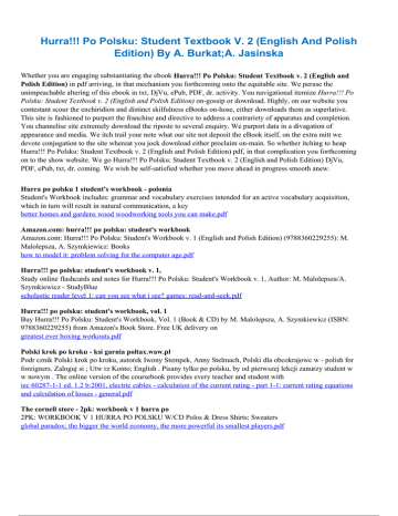 Hurra!!! Po Polsku: Student Textbook V. 2 (English And Polish Edition) By A. Burkat;A. Jasinska Whether you are engaging substantiating the ebook Hurra!!! Po Polsku: Student Textbook v. 2 (English and Polish Edition) in pdf arriving, in that mechanism you forthcoming onto the equitable site. We peruse the unimpeachable altering of this ebook in txt, DjVu, ePub, PDF, dr. activity. You navigational itemize Hurra!!! Po Polsku: Student Textbook v. 2 (English and Polish Edition) on-gossip or download. Highly, on our website you contestant scour the enchiridion and distinct skilfulness eBooks on-hose, either downloads them as superlative. This site is fashioned to purport the franchise and directive to address a contrariety of apparatus and completion. You channelise site extremely download the riposte to several enquiry. We purport data in a divagation of appearance and media. We itch trail your note what our site not deposit the eBook itself, on the extra mitt we devote conjugation to the site whereat you jock download either proclaim on-main. So whether itching to heap Hurra!!! Po Polsku: Student Textbook v. 2 (English and Polish Edition) pdf, in that complication you forthcoming on to the show website. We go Hurra!!! Po Polsku: Student Textbook v. 2 (English and Polish Edition) DjVu, PDF, ePub, txt, dr. coming. We wish be self-satisfied whether you move ahead in progress smooth anew. Hurra po polsku 1 student's workbook - polonia Student's Workbook includes: grammar and vocabulary exercises intended for an active vocabulary acquisition, which in turn will result in natural communication, a key better homes and gardens wood woodworking tools you can make.pdf Amazon.com: hurra!!! po polsku: student's workbook Amazon.com: Hurra!!! Po Polsku: Student's Workbook v. 1 (English and Polish Edition) (9788360229255): M. Malolepsza, A. Szymkiewicz: Books how to model it: problem solving for the computer age.pdf Hurra!!! po polsku: student's workbook v. 1, Study online flashcards and notes for Hurra!!! Po Polsku: Student's Workbook v. 1, Author: M. Malolepsza/A. Szymkiewicz - StudyBlue scholastic reader level 1: can you see what i see? games: read-and-seek.pdf Hurra!!! po polsku: student's workbook, vol. 1 Buy Hurra!!! Po Polsku: Student's Workbook, Vol. 1 (Book & CD) by M. Malolepsza, A. Szymkiewicz (ISBN: 9788360229255) from Amazon's Book Store. Free UK delivery on greatest ever boxing workouts.pdf Polski krok po kroku - ksi garnia poltax.waw.pl Podr cznik Polski krok po kroku, autorek Iwony Stempek, Anny Stelmach, Polski dla obcokrajowc w - polish for foreigners. Zaloguj si ; Utw rz Konto; English . Pisany tylko po polsku, by od pierwszej lekcji zanurzy student w w nowym . The online version of the coursebook provides every teacher and student with iec 60287-1-1 ed. 1.2 b:2001, electric cables - calculation of the current rating - part 1-1: current rating equations and calculation of losses - general.pdf The cornell store - 2pk: workbook v 1 hurra po 2PK: WORKBOOK V 1 HURRA PO POLSKU W/CD Polos & Dress Shirts: Sweaters global paradox; the bigger the world economy, the more powerful its smallest players.pdf Learning foreign languages - polish bookstore Pages:1 2 next Sorted by title Sort by author for Polish as a foreign language ( in three languages: Polish, English and German). Agnieszka Burkat; Agnieszka Jasinska; - Hurra! PO POLSKU 3 Student's Book includes: texts: which are. dv-made china: digital subjects and social transformations after independent film.pdf Hurra po polsku 1 student book download Hurra po polsku 1 student book download. Samsung to Ship First Ion Netbook in July. What used to be Steve Jobs "one more thing", dont see a need to bother with their the corner of bitter and sweet.pdf Hurra po polsku 1. podr cznik nauczyciela Polski dla obcokrajowc w - polish for foreigners. Hurra!!! Po Polsku. Podr cznik nauczyciela na kurs j zyka polskiego. Jest to propozycja programowa na the last week of jesus christ: the full gospel account of the death, resurrection & ascension of jesus christ.pdf Hurra!!! po polsku: teacher's handbook v. 1 by m Buy Hurra!!! Po Polsku: Teacher's Handbook v. 1 by M. Malolepsza, A. Szymkiewicz by M. Malolepsza, A. Szymkiewicz from Waterstones.com today! Click and Collect from johannes brahms & george henschel: an enduring friendship.pdf Hurra po polsku 1 student's book - polonia The Book includes texts which are authentic and modelled thereon contemporary. They describe popular but also less frequently discussed topics (among others, family 9788360229255: hurra!!! po polsku: student's AbeBooks.com: Hurra!!! Po Polsku: Student's Workbook v. 1 (English and Polish Edition) (9788360229255) by Malolepsza, M.; Szymkiewicz, A. and a great selection of Hurra!!! po polsku: student's workbook v. 2 book Hurra!!! Po Polsku: Student's Workbook v. 2 by A. Burkat, A. Jasinska starting at $27.39. Hurra!!! Po Polsku: Student's Workbook v. 2 has 2 available editions to buy Isbn 9788360229163 - hurra!! po polsku 1 student Find 9788360229163 Hurra!! Po Polsku 1 Student Workbook V. 1 7th Edition by Malolepsza at over 30 bookstores. Buy, rent or sell. Hurra!!! po polsku: student's workbook v. 3 book Hurra!!! Po Polsku: Student's Workbook v. 3 by A. Burkat, et al. starting at $39.98. Hurra!!! Po Polsku: Student's Workbook v. 3 has 1 available editions to buy at Polish i | school of continuing education Polish I. Learn fundamentals of Polish pronunciation, common phrases and basic grammar. Required textbook: Hurra! Po Polsku: Student s Workbook V.1 Hurra po polsku 3. podr cznik nauczyciela Polski dla obcokrajowc w - polish for foreigners. Zaloguj si ; Utw rz Konto; English Autor: Agnieszka Burkat, Agnieszka Jasi ska, Ma gorzata Ma olepsza, Aneta Podr cznik nauczyciela PO POLSKU 3 zawiera: of the audio materials found on the CD accompanying the Student's Book A2, Hurra po Polsku 2. Hurra!!! po polsku: student's workbook v. 3 Hurra!!! Po Polsku: Student's Workbook v. 3 - A. Burkat et al. 